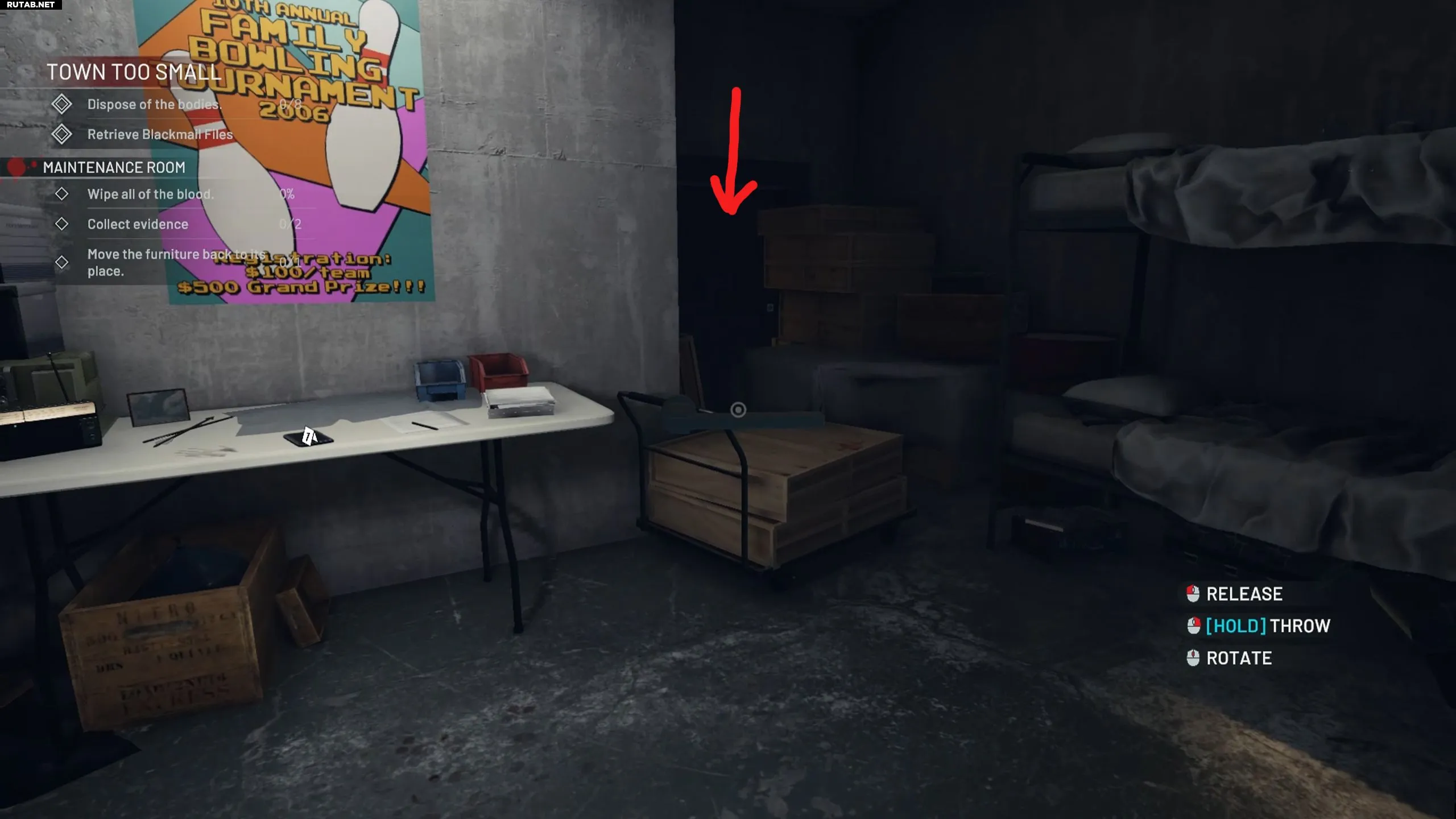Зайдите в туалет справа и взберитесь по сломанной кабинке, чтобы попасть на чердак. Затем спрыгните в отверстие, чтобы оказаться в зоне боулинга.