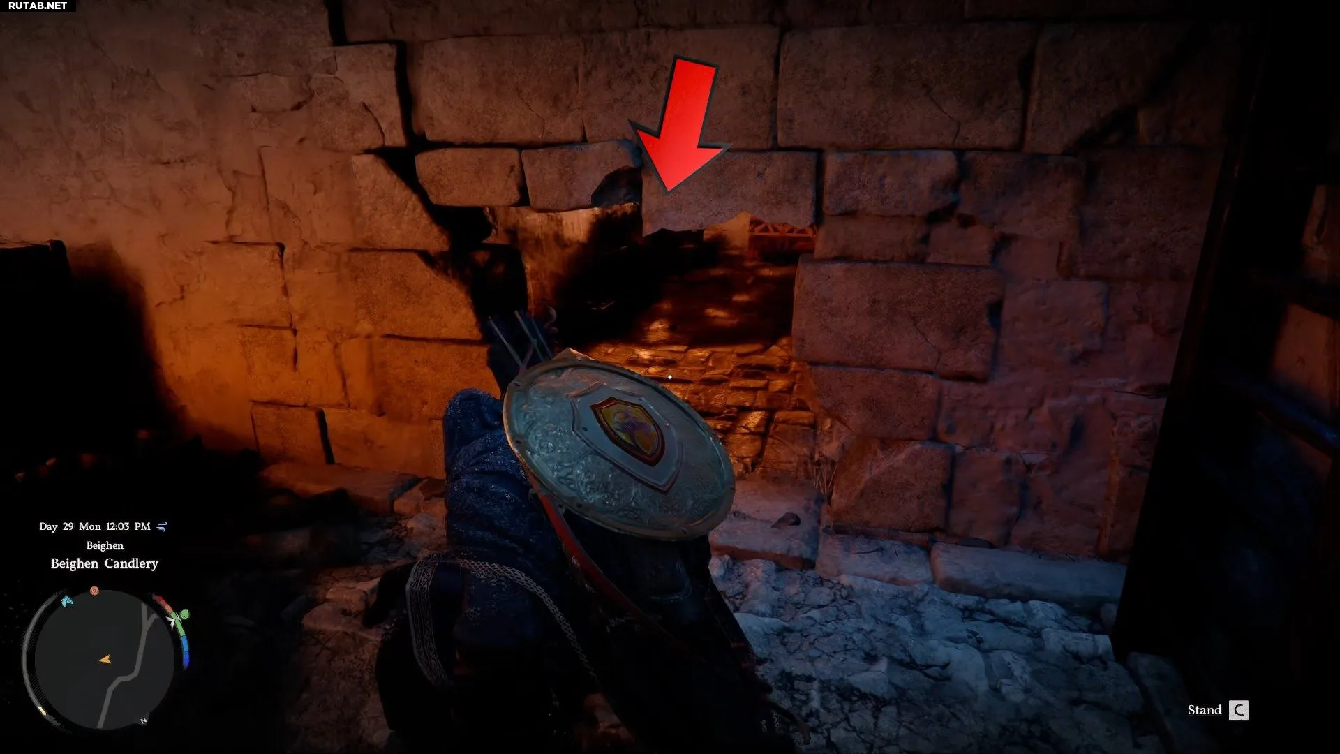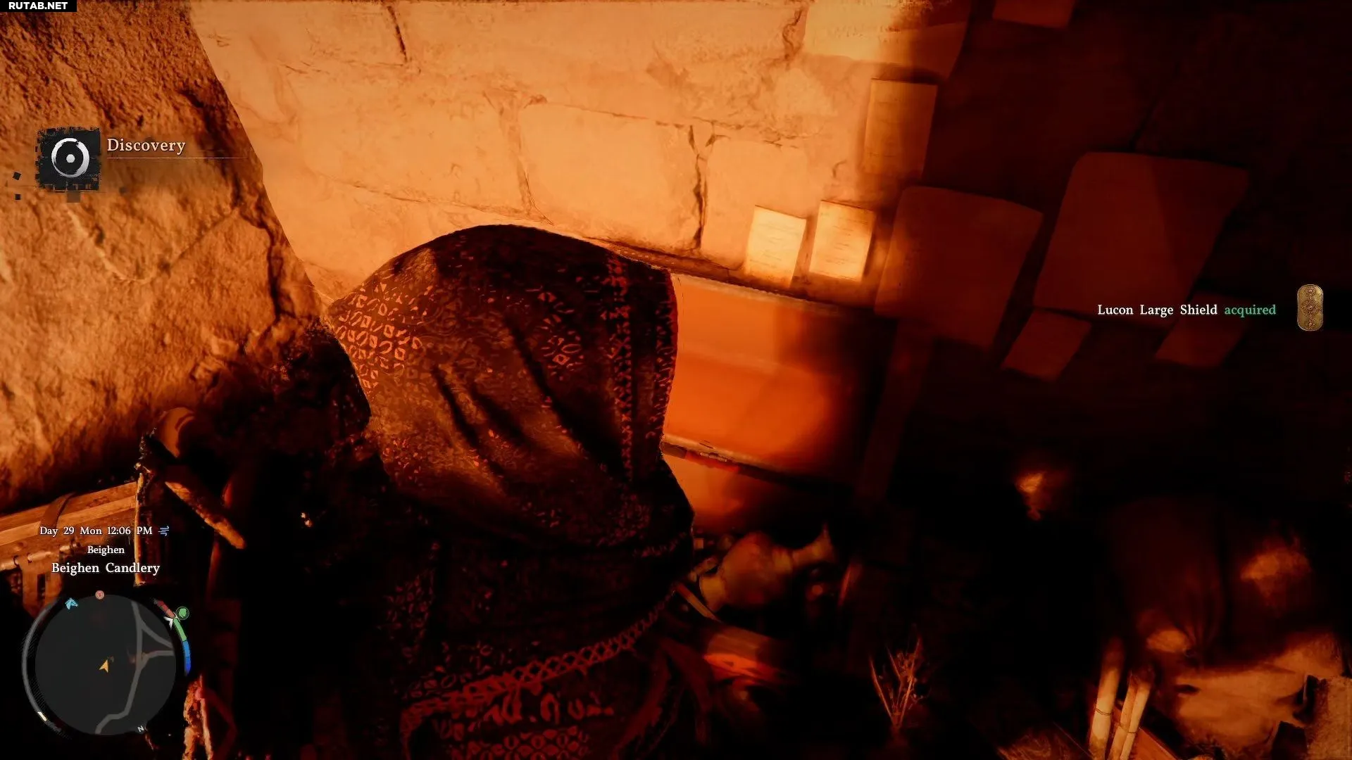 - Пройдите через подвал, и в дальнем конце комнаты вы обнаружите сундук с сокровищами. В нём и лежит большой щит Лукона.