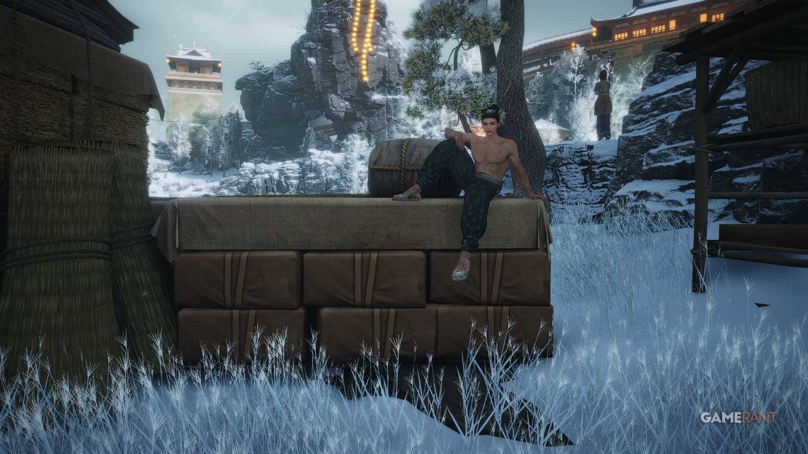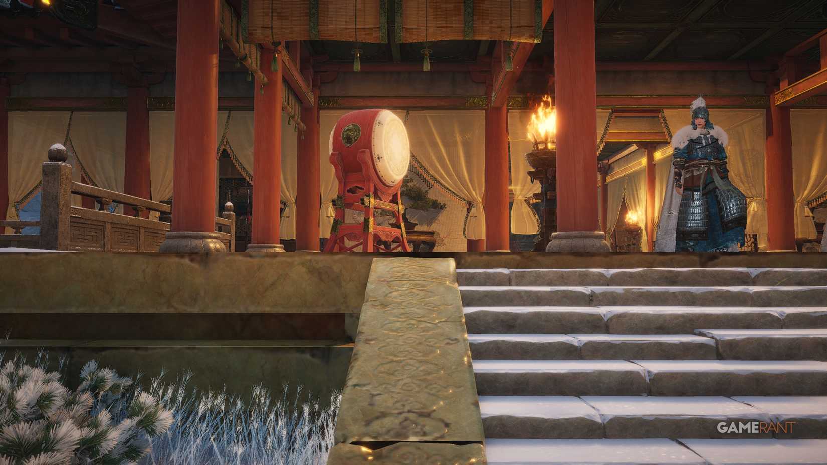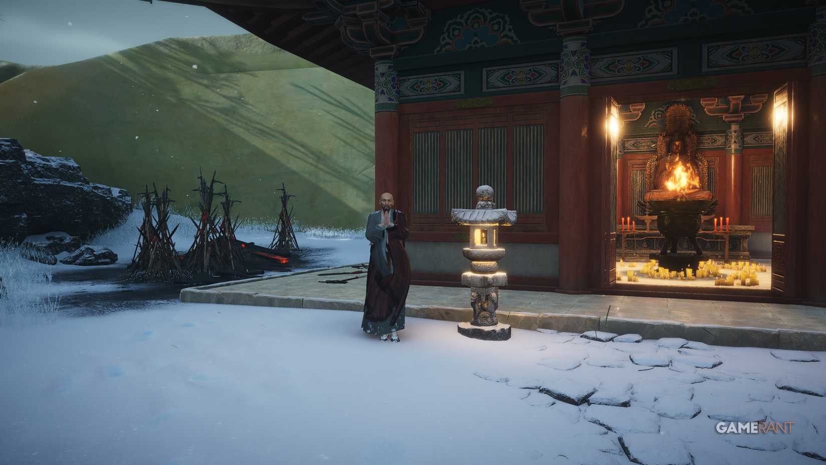 Покиньте эту область, поднимитесь по тропе, затем поверните направо и идите вверх к храму, где вы найдёте другого NPC — Джиацо Шрама. Разговор с ним завершит эту встречу.