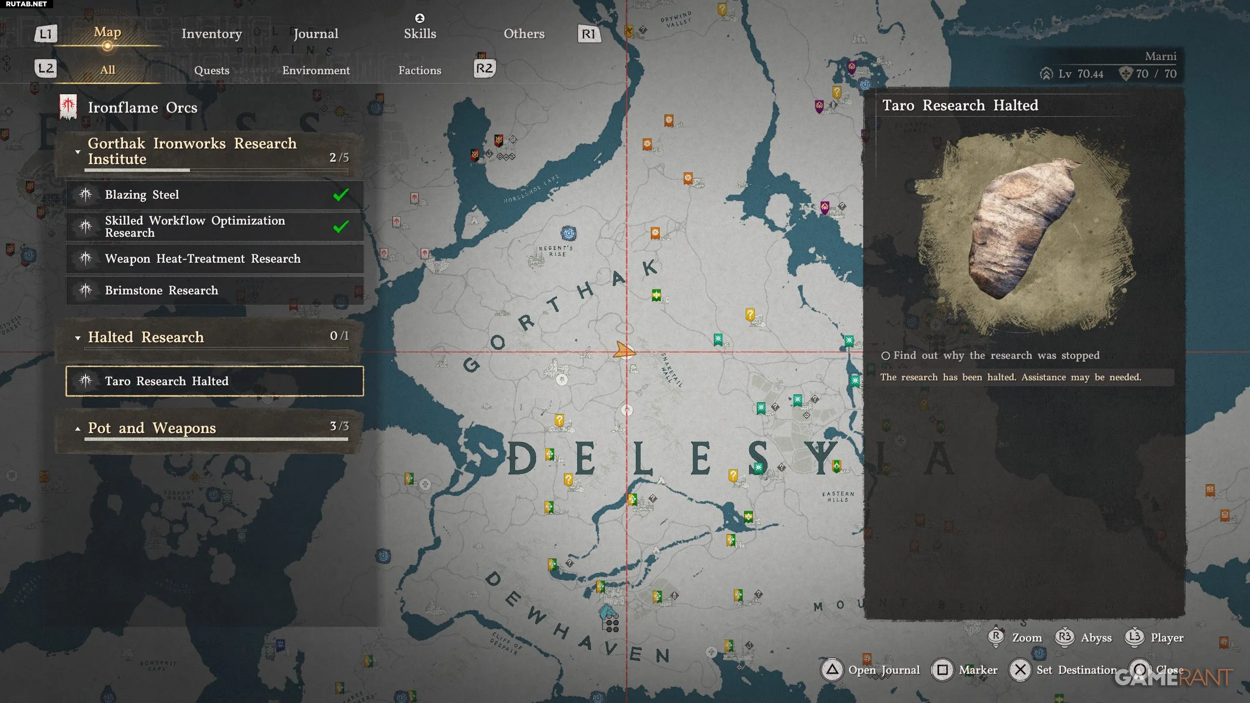 - Чтобы получить доступ к исследованию «Таро», сначала нужно выполнить задание «Исследование оптимизации квалифицированного рабочего процесса». Оно находится на карте к северу от первой буквы «Е» в названии региона Делесия, на литейном заводе Кралла.