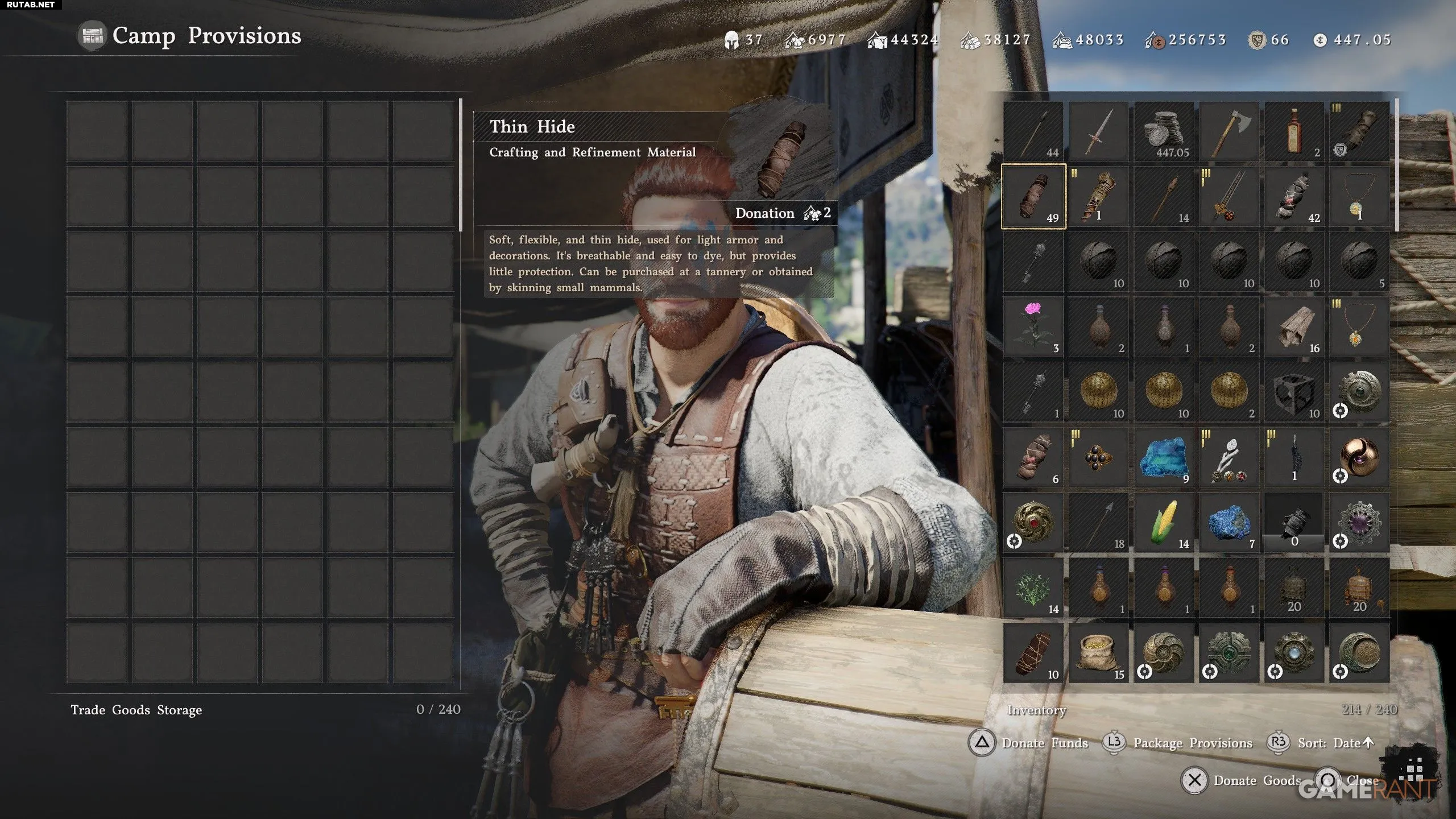 - Выберите «Управление припасами» (Manage Provisions), затем «Пополнить ресурсы лагеря» (Camp Provisions), чтобы пожертвовать предметы.