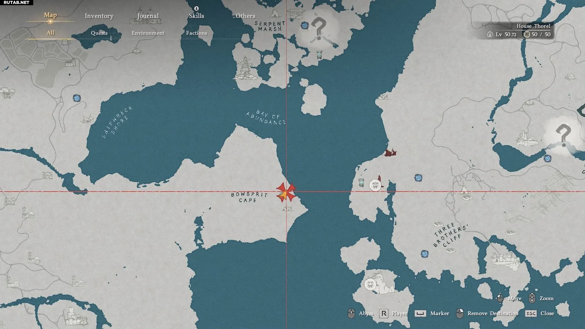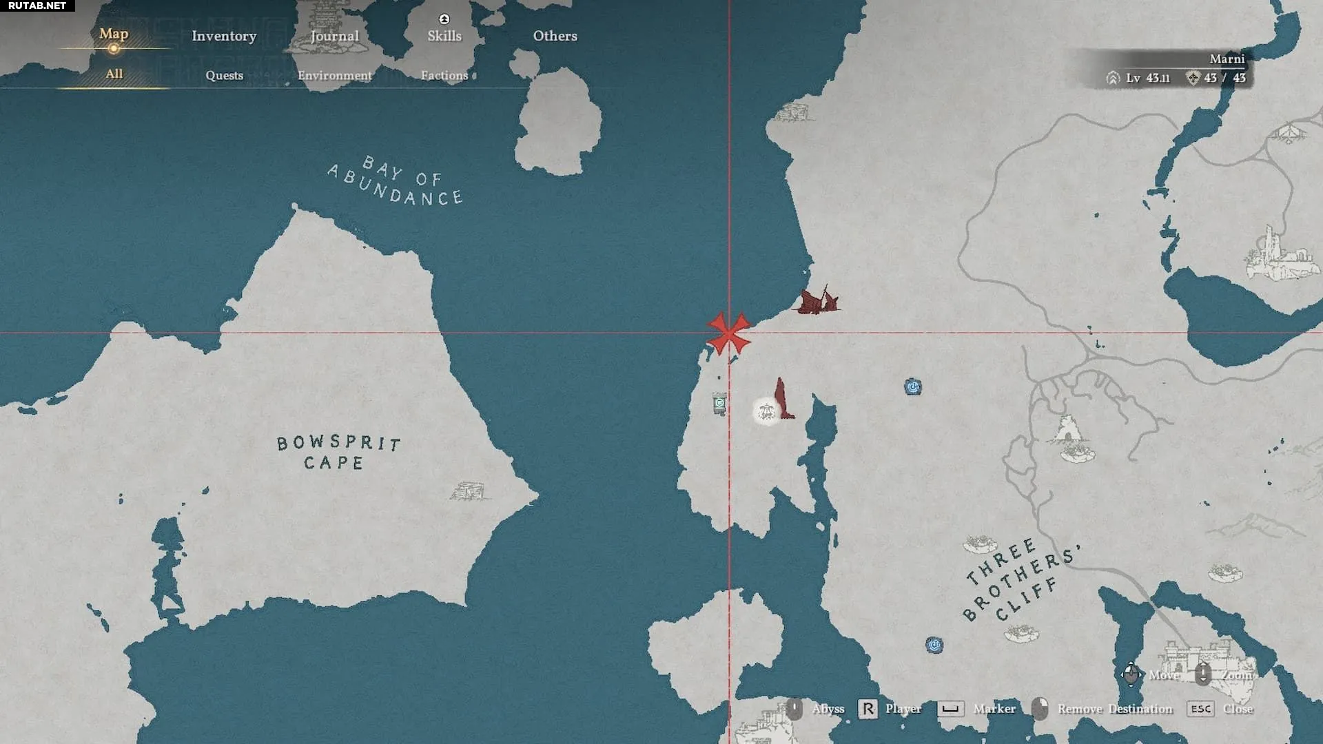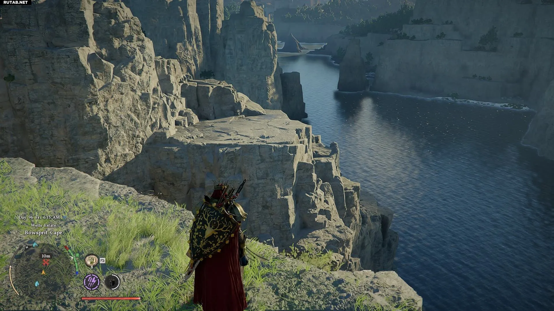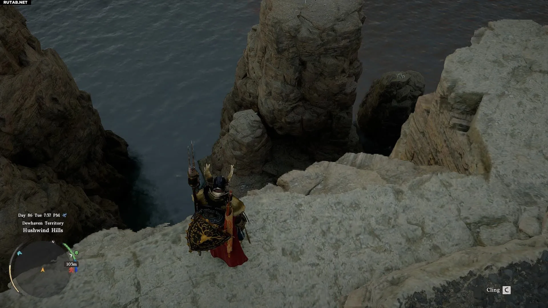Перчатки снова спрятаны внутри большой скальной формации, но на этот раз вам нужно отправиться на запад, к мысу Бушприт, недалеко от места, где вы взяли плащ. Снова подойдите к краю обрыва, как показано на изображении выше, и найдите в воде скальное образование с небольшой плоской вершиной. Доберитесь до этой скалы и осмотрите утёсы позади неё. В тёмном углу утёсов есть хорошо спрятанное отверстие, скрывающее сундук. Проползите внутрь и заберите добычу.