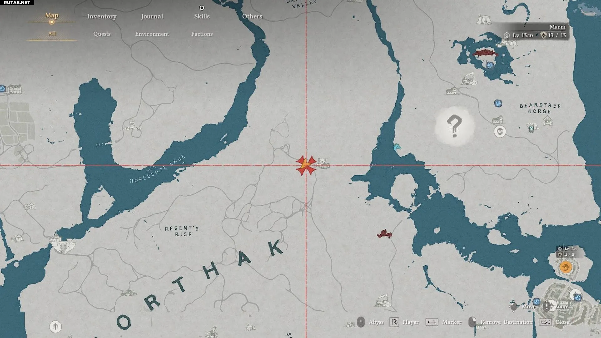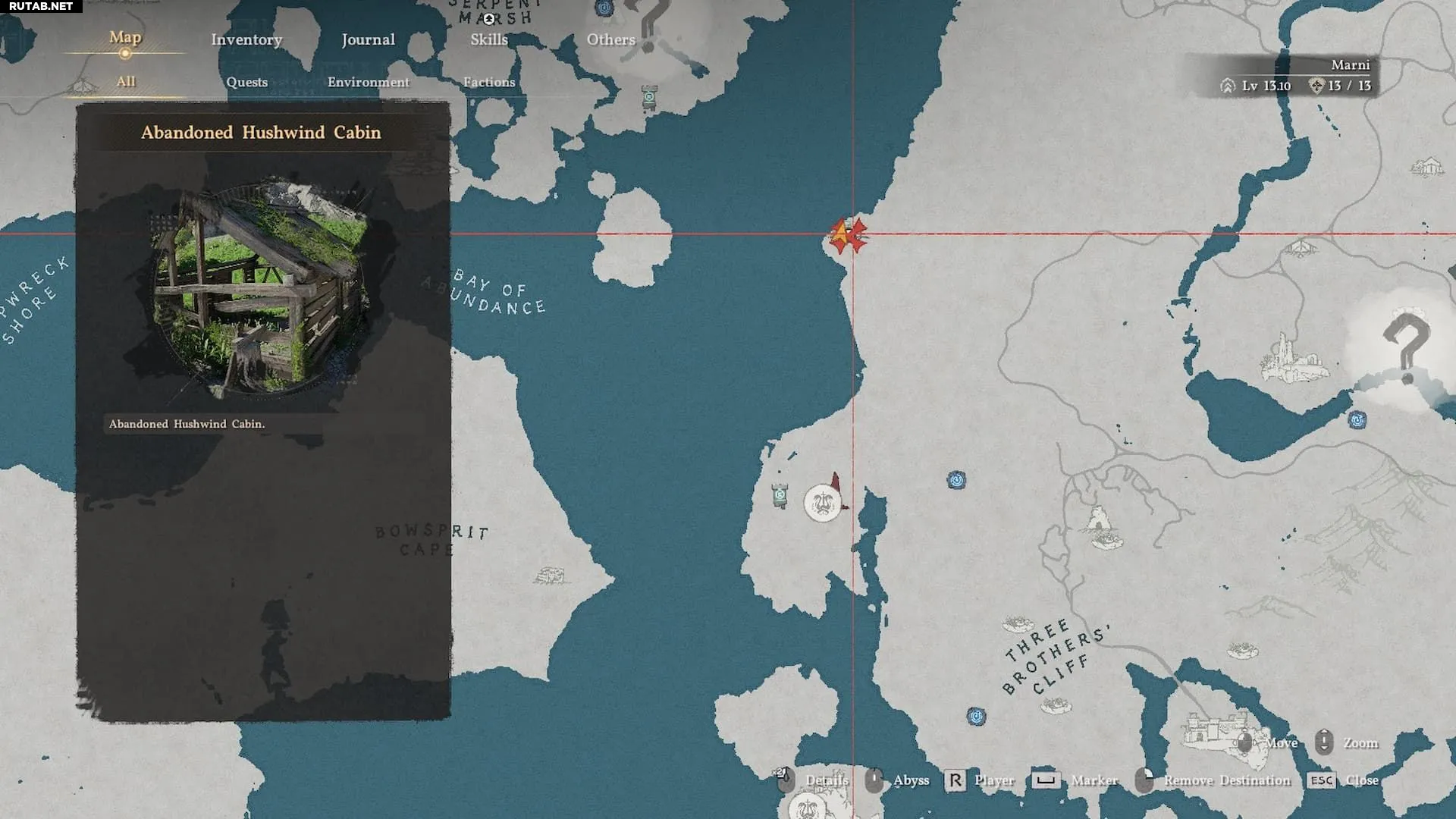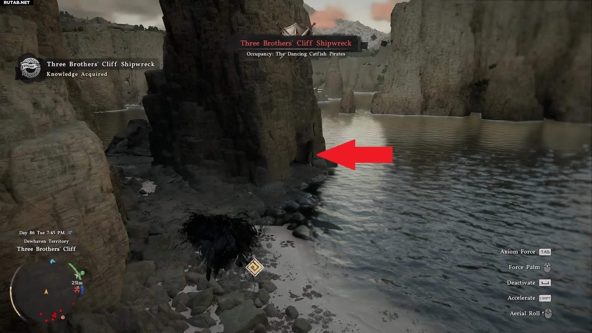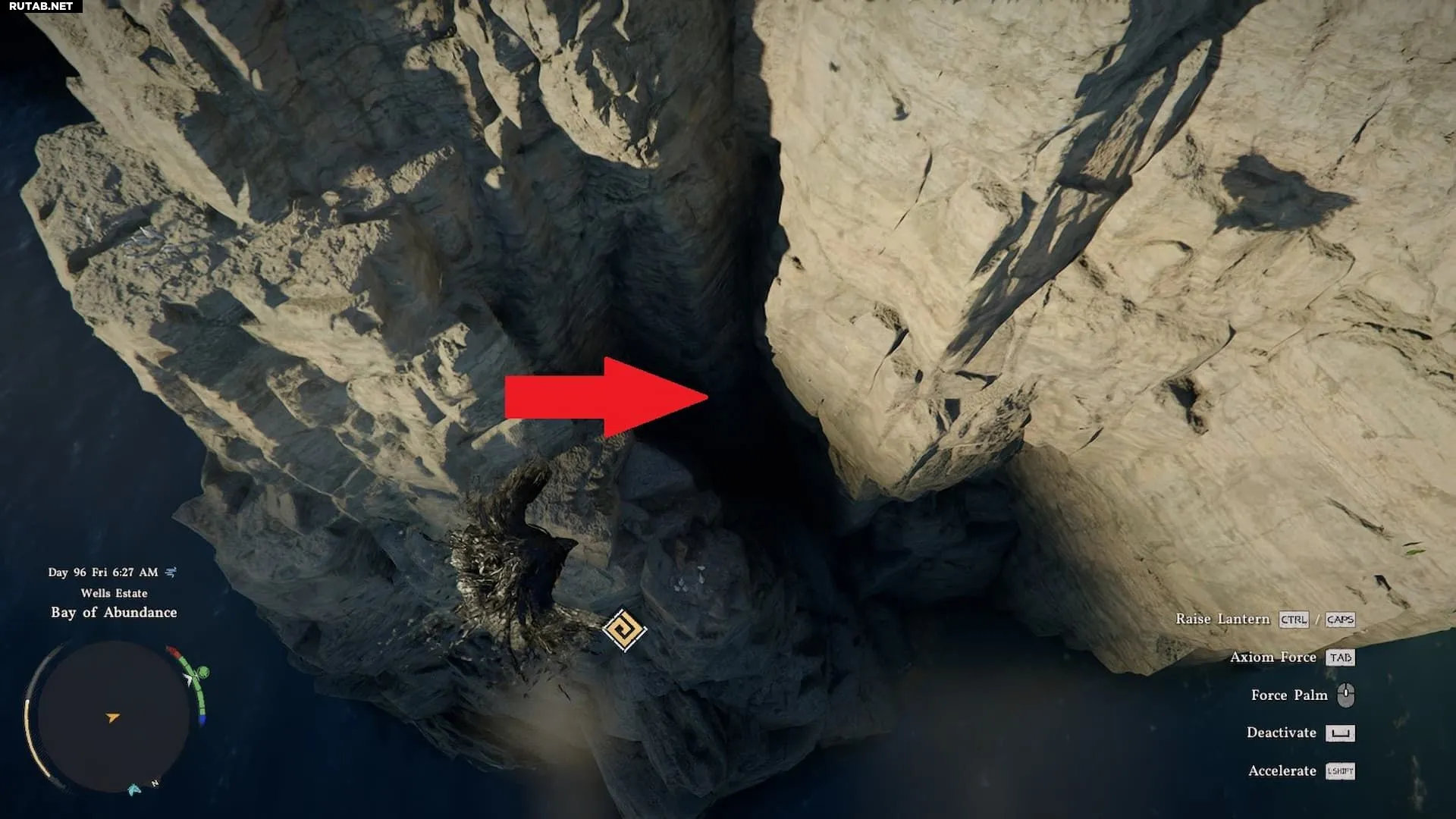Ботинки находятся внутри расщелины к северу от места, где вы нашли плащ. Доберитесь до указанного на изображении выше места и найдите отмеченную каменную вершину, торчащую из воды. Спланируйте к ней и приземлитесь примерно посередине. Там вы обнаружите небольшую расщелину с ещё одним сундуком. Обыщите его, чтобы найти ботинки.
