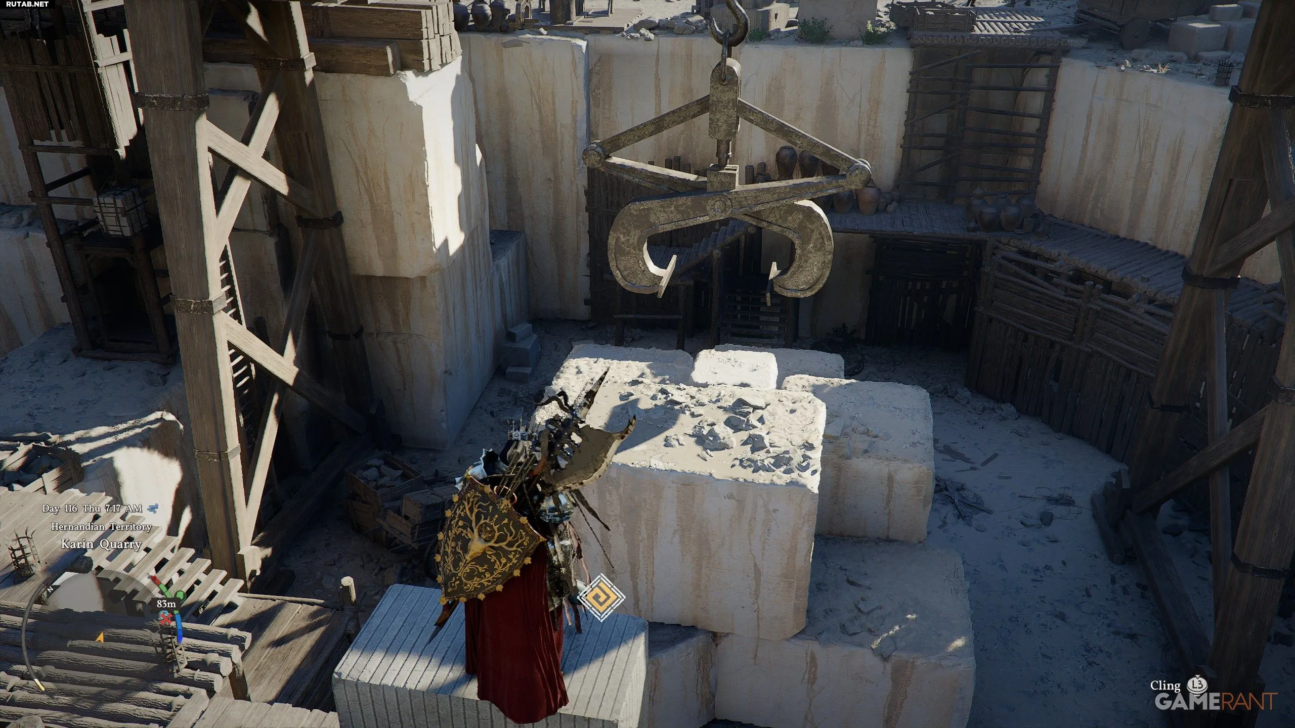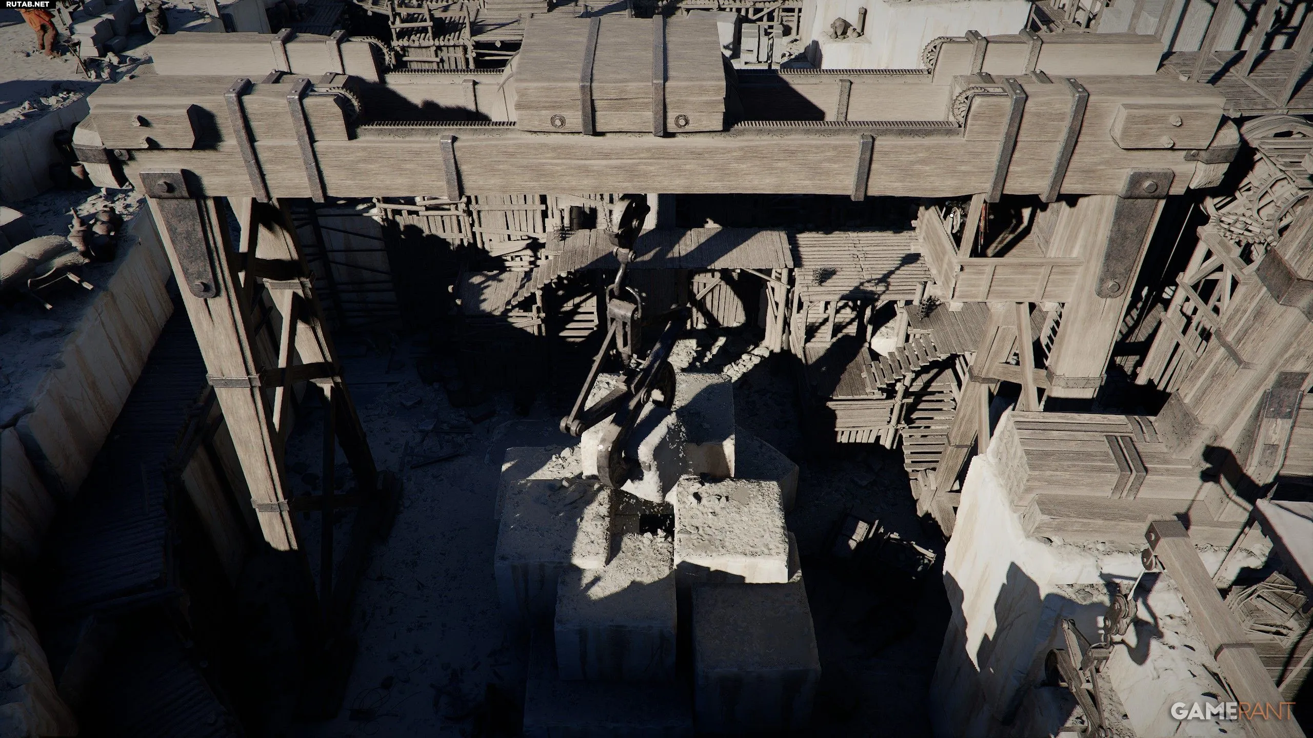 - С помощью крестовины переместите кран и наведите его на центральный каменный блок. Нажмите X/A, чтобы зафиксировать захват, а затем потяните блок вверх с помощью крестовины, чтобы вытащить его из паза.