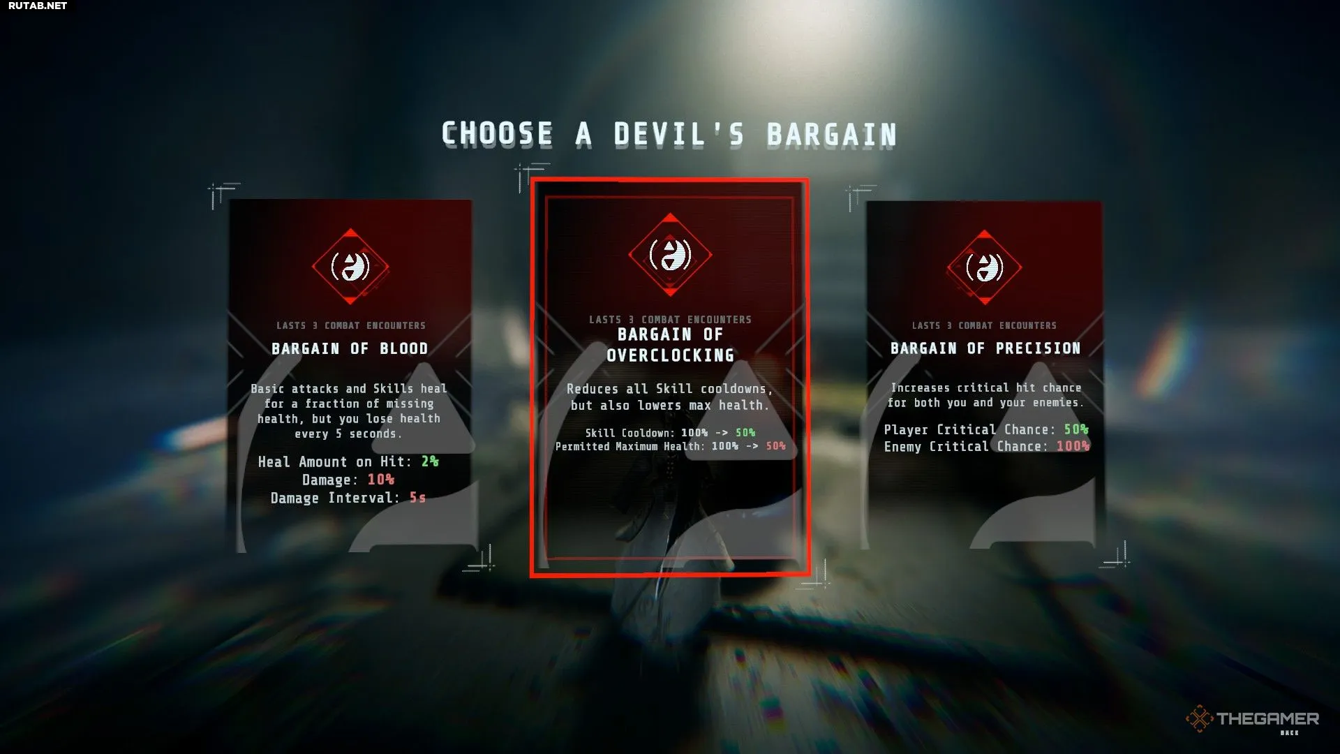 Он позволит вам выбрать один из трёх вариантов, каждый из которых даст мощный бонус, но за определённую цену. Например, «Сделка Разгона» сократит время перезарядки всех ваших навыков вдвое, но ваше максимальное здоровье также уменьшится в два раза.