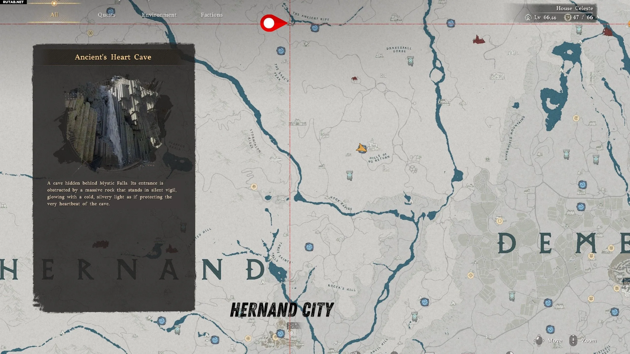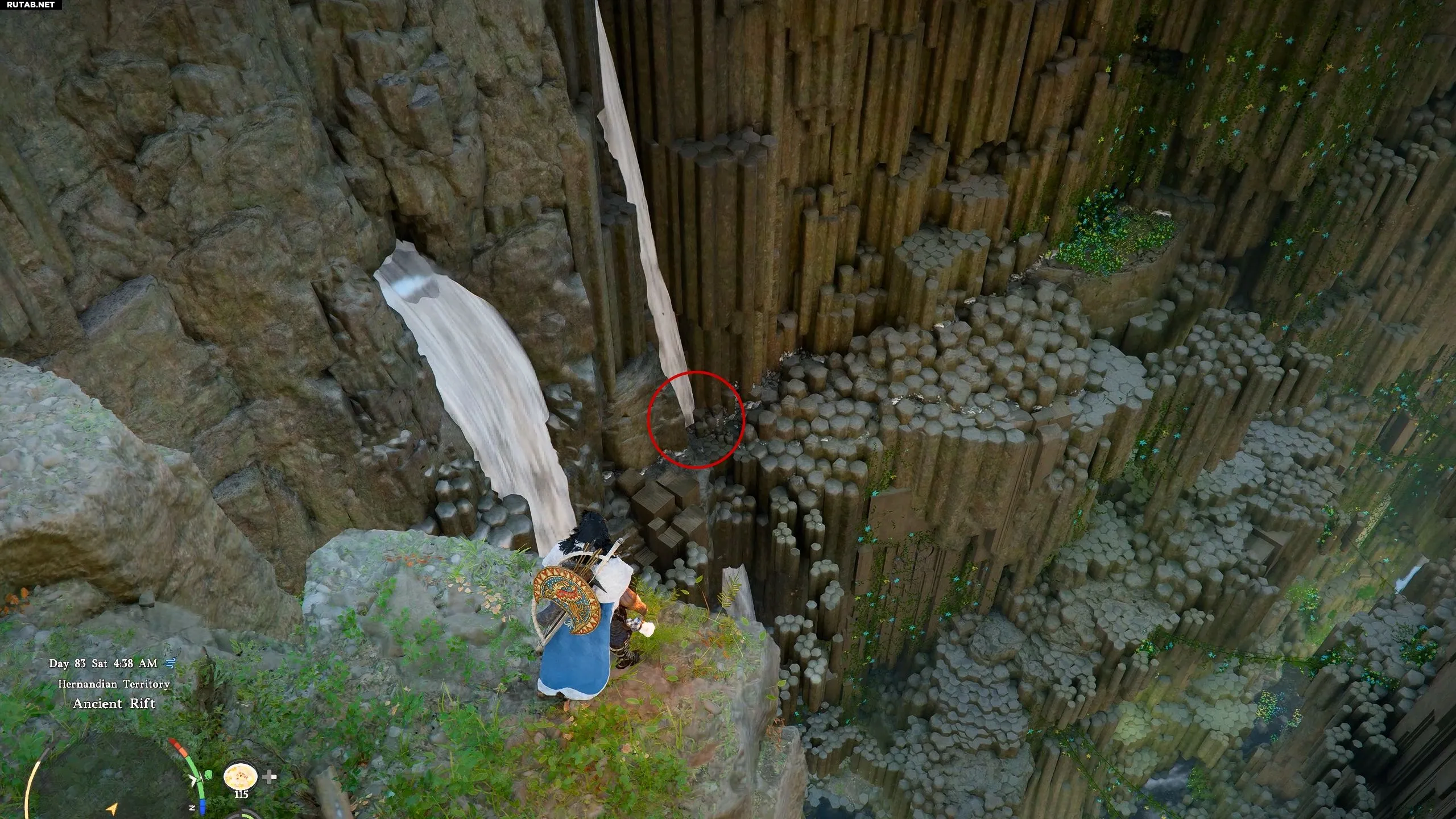 В конце концов вы окажетесь у огромной расщелины в земле с полигональными структурами из царства Бездны и водопадами. Не спускаясь в расщелину, идите к западной стороне Древнего Разлома, пока не увидите два водопада, текущих рядом друг с другом. Обнаружив их, спланируйте к водопаду слева.