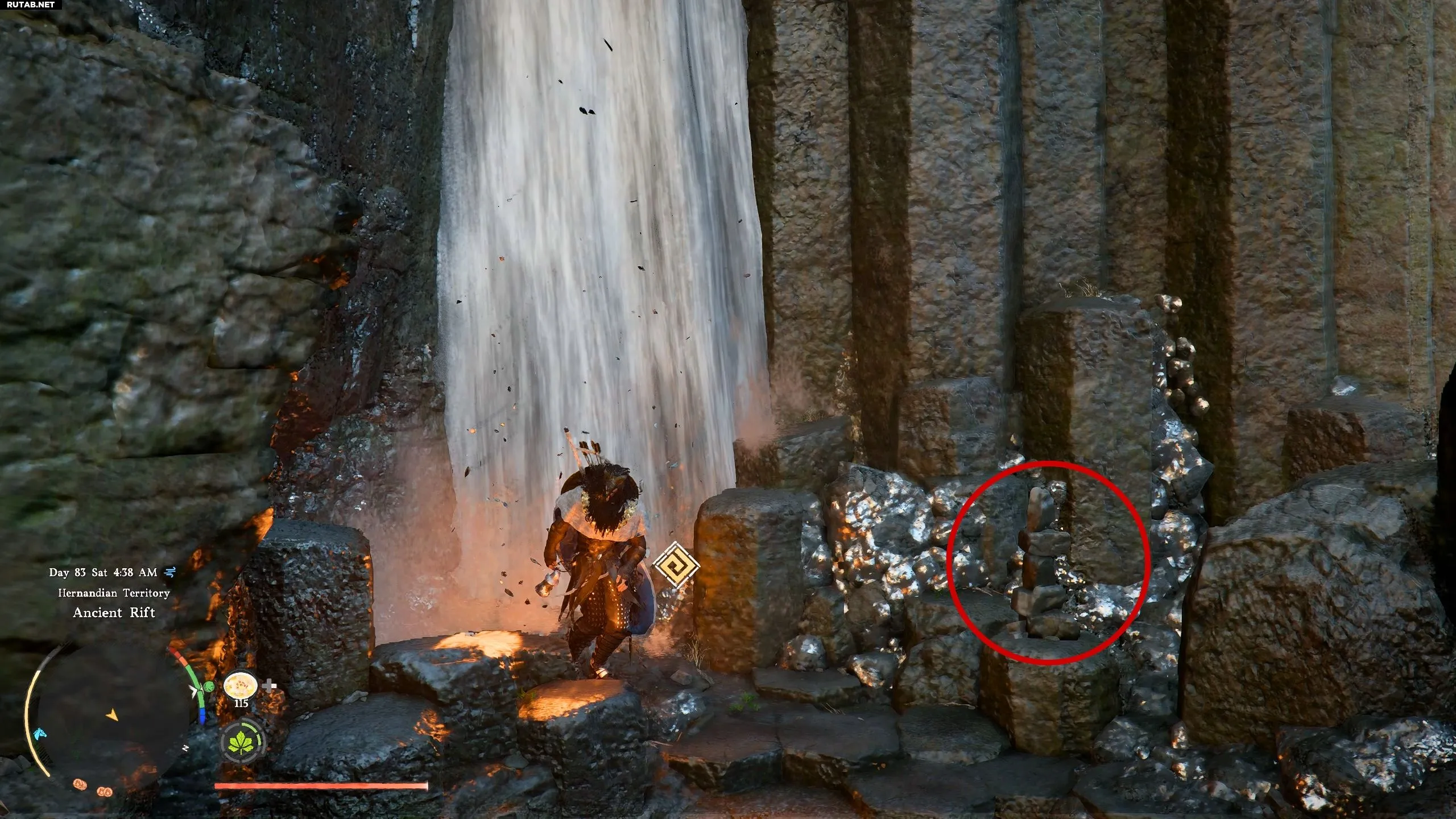 Приземлившись на платформу рядом с водопадом, вы увидите небольшую груду камней, указывающую на вход в пещеру Сердце Древнего. Всё, что нужно сделать, — это подойти к водопаду и выполнить колющий удар (RB + Y / R1 + Triangle). Это позволит Клиффу пройти сквозь мощный поток воды и попасть в пещеру за водопадом.