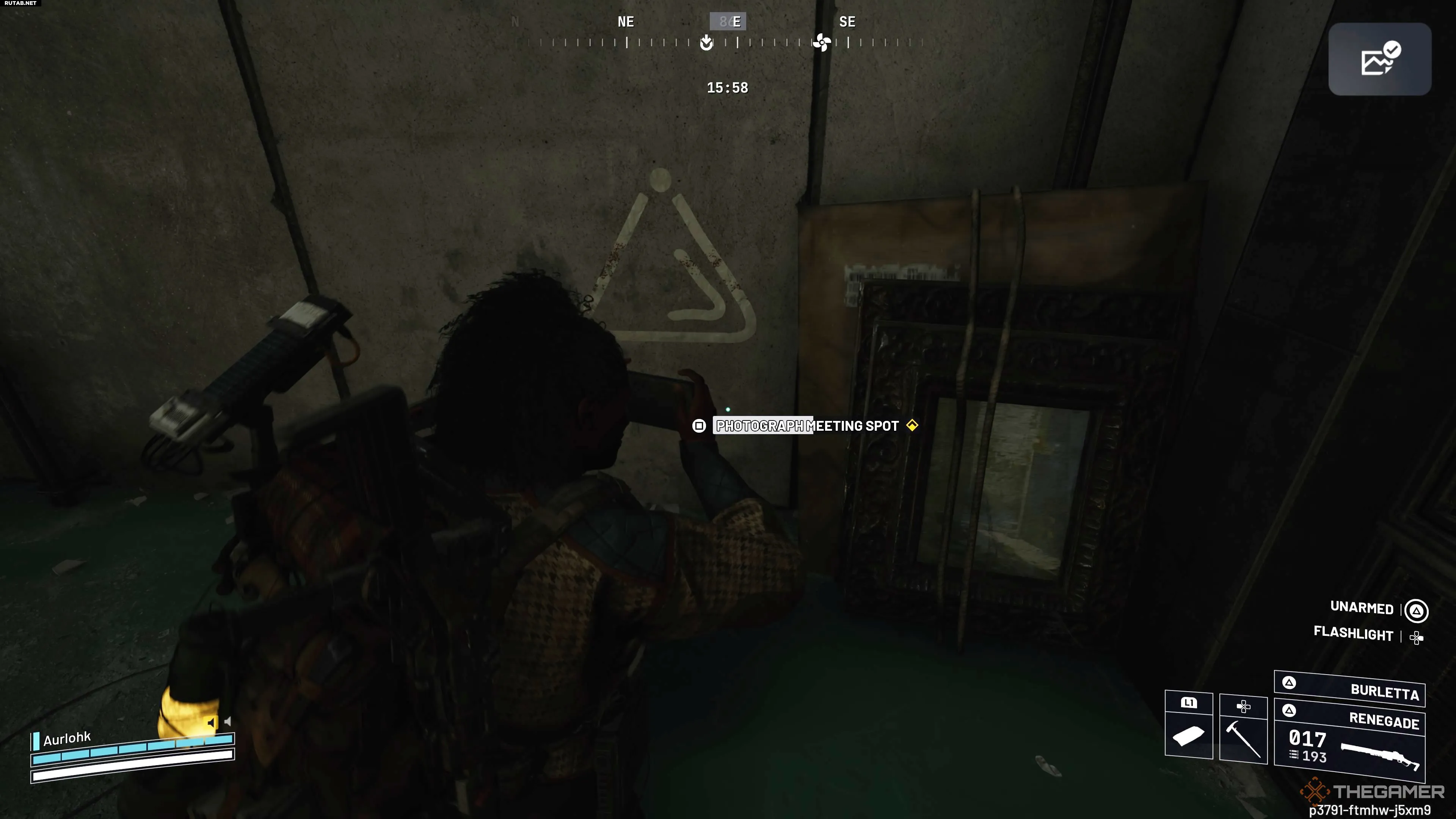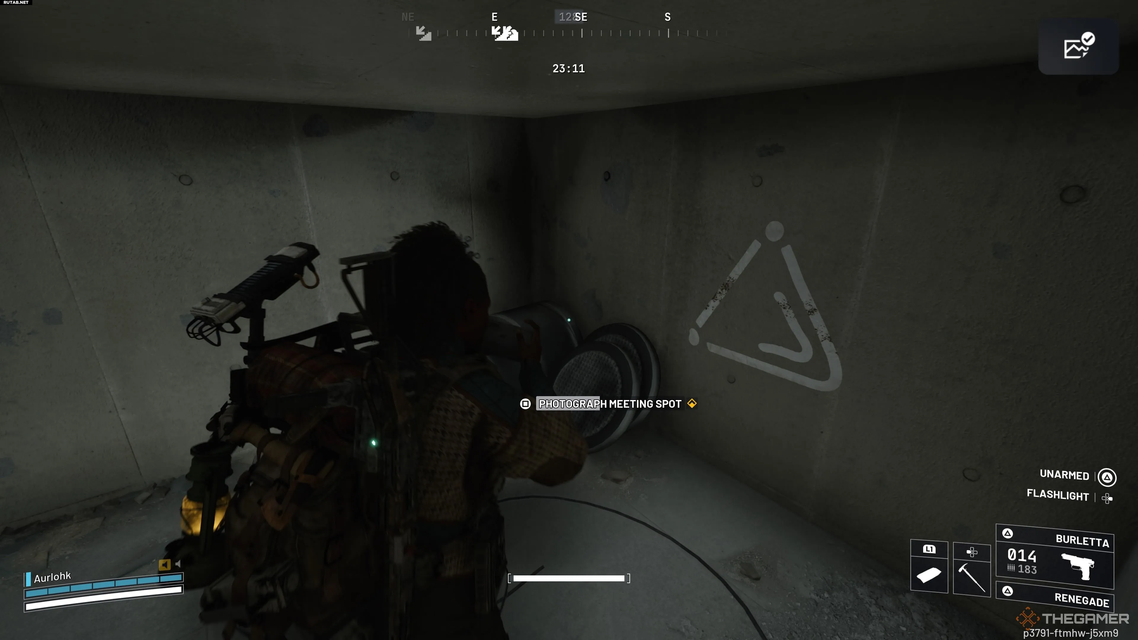 Первая метка находится в Медицинском исследовательском крыле на западе карты. Ищите её под лестницей в юго-западном углу нижнего этажа, соединённого с лабораториями. На стене под лестницей будет нарисован белый треугольник с двумя точками. Подойдите к нему, чтобы сфотографировать и выполнить первую цель.