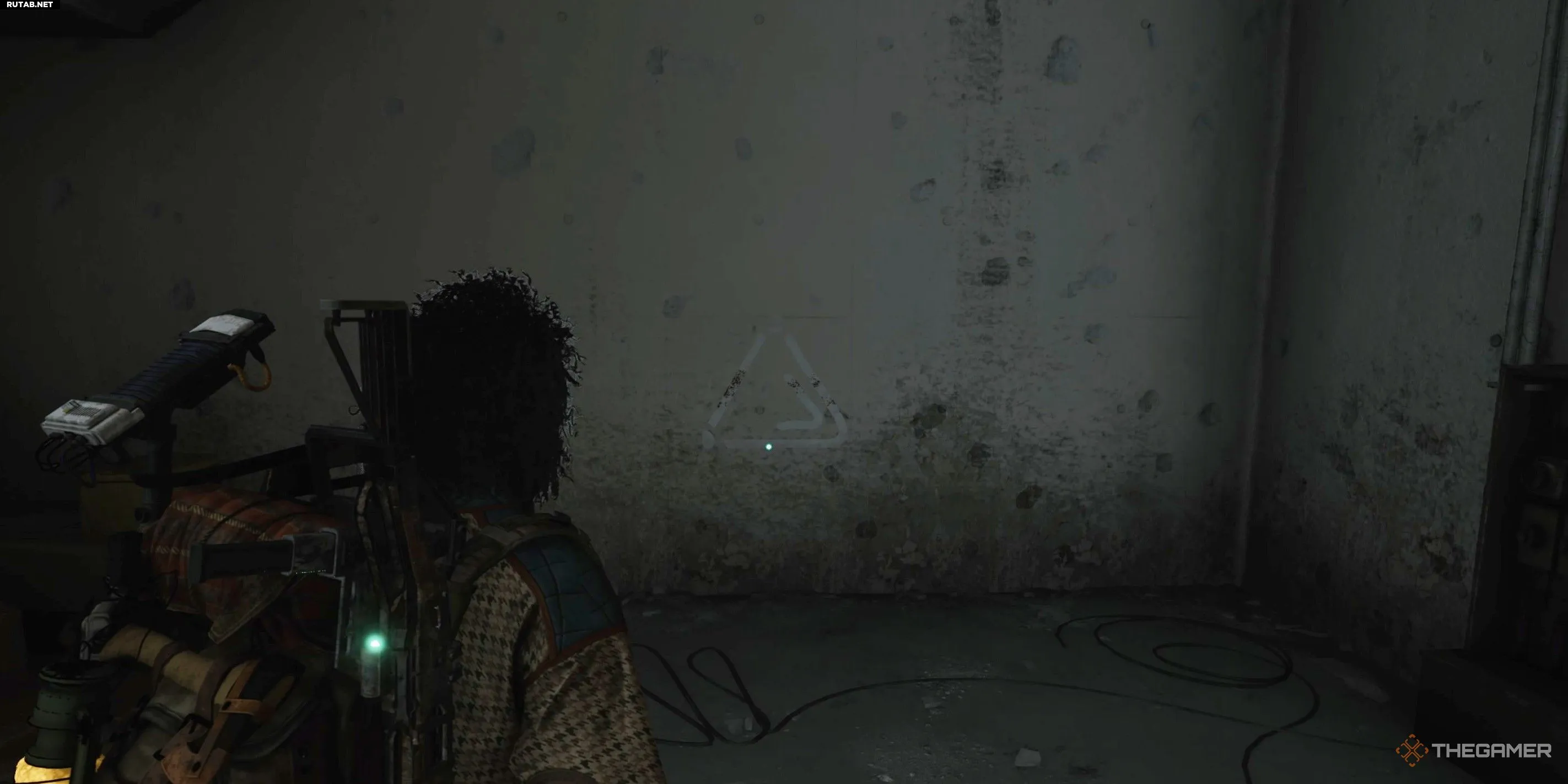 В большом коридоре к востоку от Робототехнического полигона B найдите лестницу, ведущую вверх, прямо перед вентиляционной шахтой к Хранилищу. Под ней на стене будет второй треугольный символ. Сфотографируйте его.