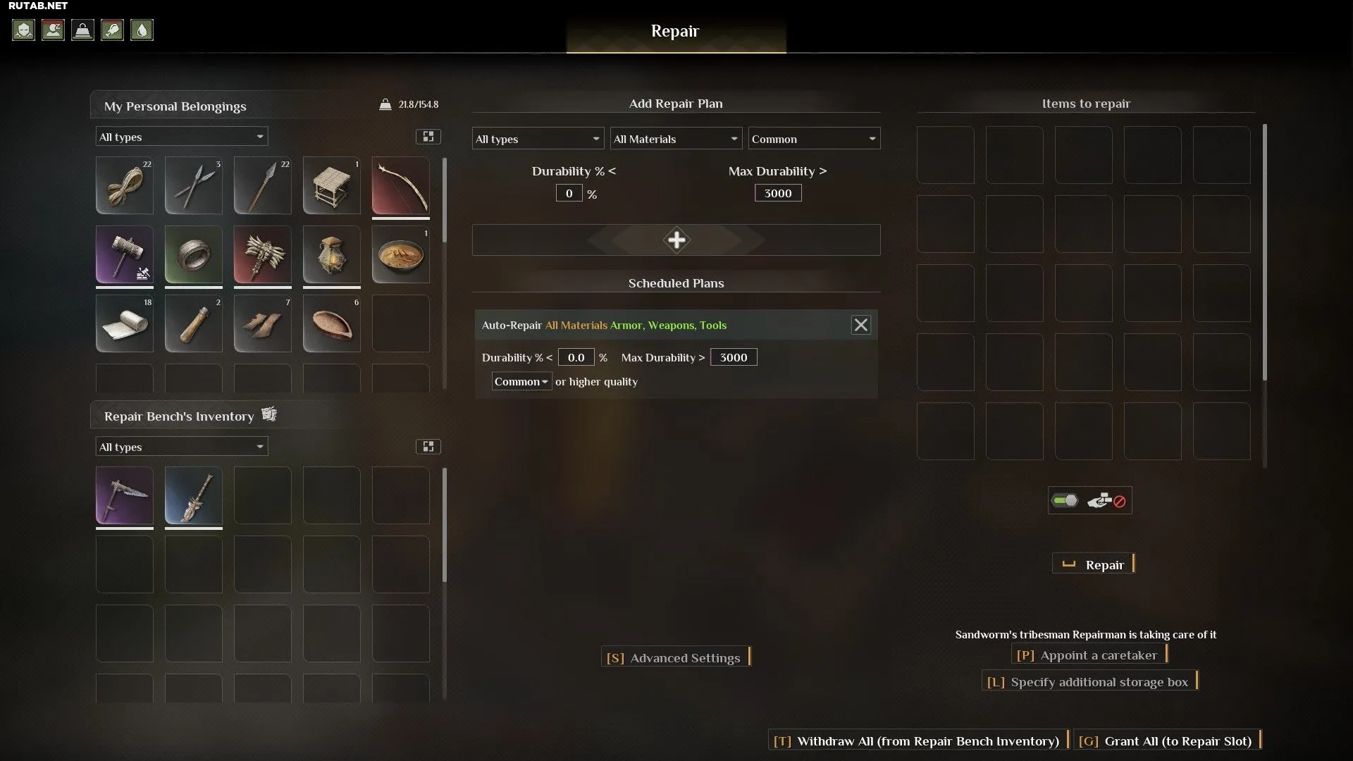 На данный момент не совсем ясно, начинают ли соплеменники автоматически чинить свою экипировку с помощью верстака. Логика автоматизации в игре в этом аспекте работает неочевидно. Если вы хотите проверить это самостоятельно, создайте «План авто-починки», нажав на большой знак плюса в меню верстака, и назначьте одного из NPC ответственным за этот верстак. Приказ NPC забирать предметы из определённых ящиков может помочь, но убедитесь, что функция авто-хранения в меню верстака отключена.
