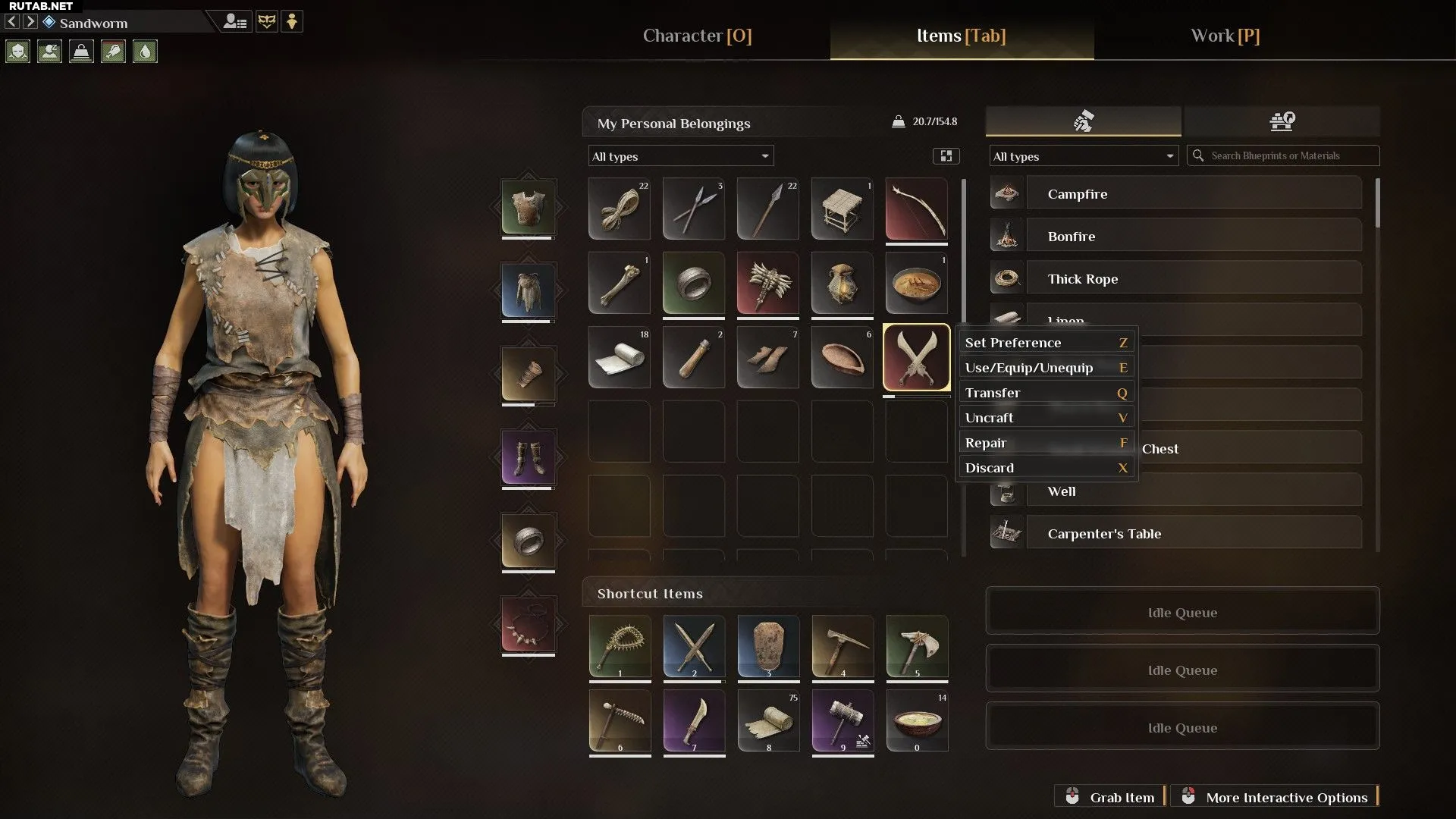 Базовое снаряжение из дерева, камня или костей можно починить прямо из инвентаря. Для этого нажмите правой кнопкой мыши на предмет и выберите опцию «Починить». Вам понадобятся соответствующие материалы. Если вы находитесь в радиусе действия костра, необходимые ресурсы автоматически возьмутся из ближайших ящиков для хранения.