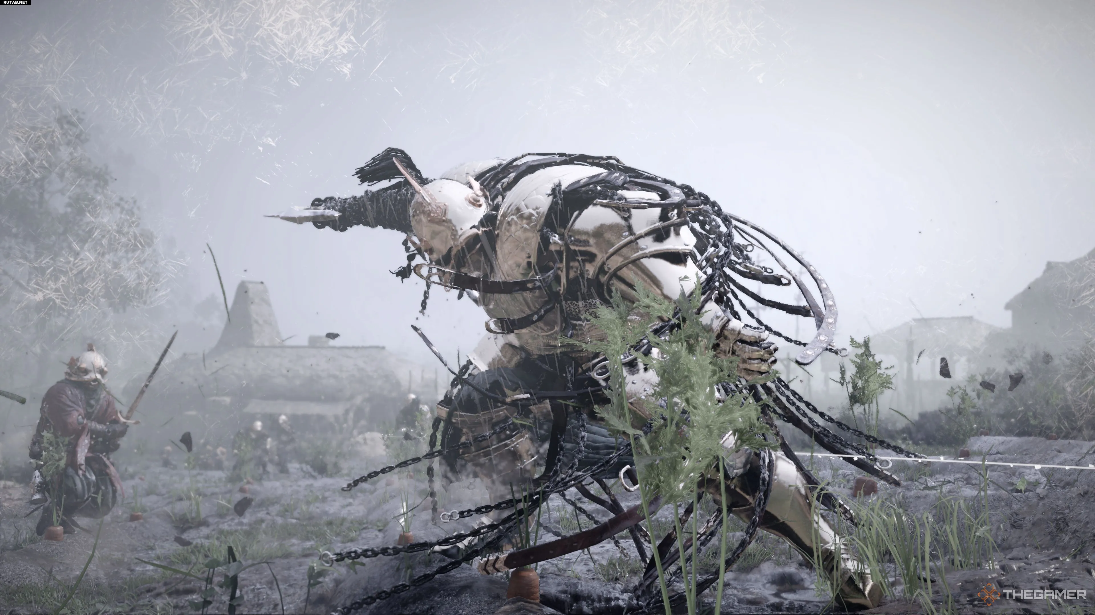 Как только вы достигнете полей перед деревней, то увидите большое скопление солдат и невероятно крупного лидера врагов — Сэра Водяного.
