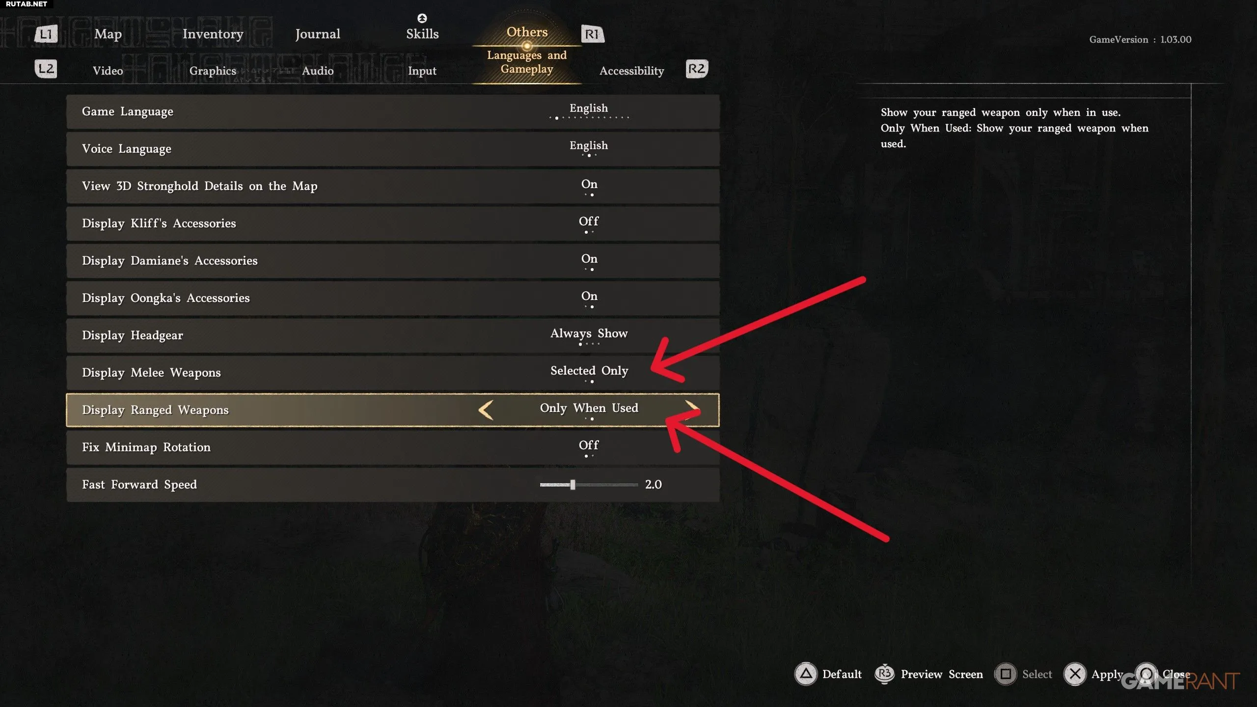 - Перейдите на вкладку «Languages and Gameplay» (Языки и игра), чтобы найти разделы «Display Melee Weapons» (Показывать ближнее оружие) и «Display Ranged Weapons» (Показывать дальнее оружие).