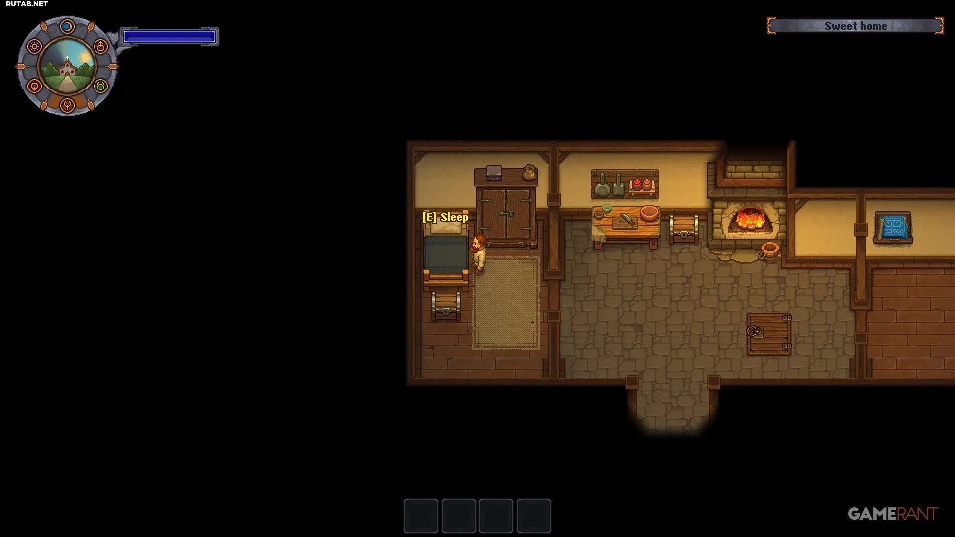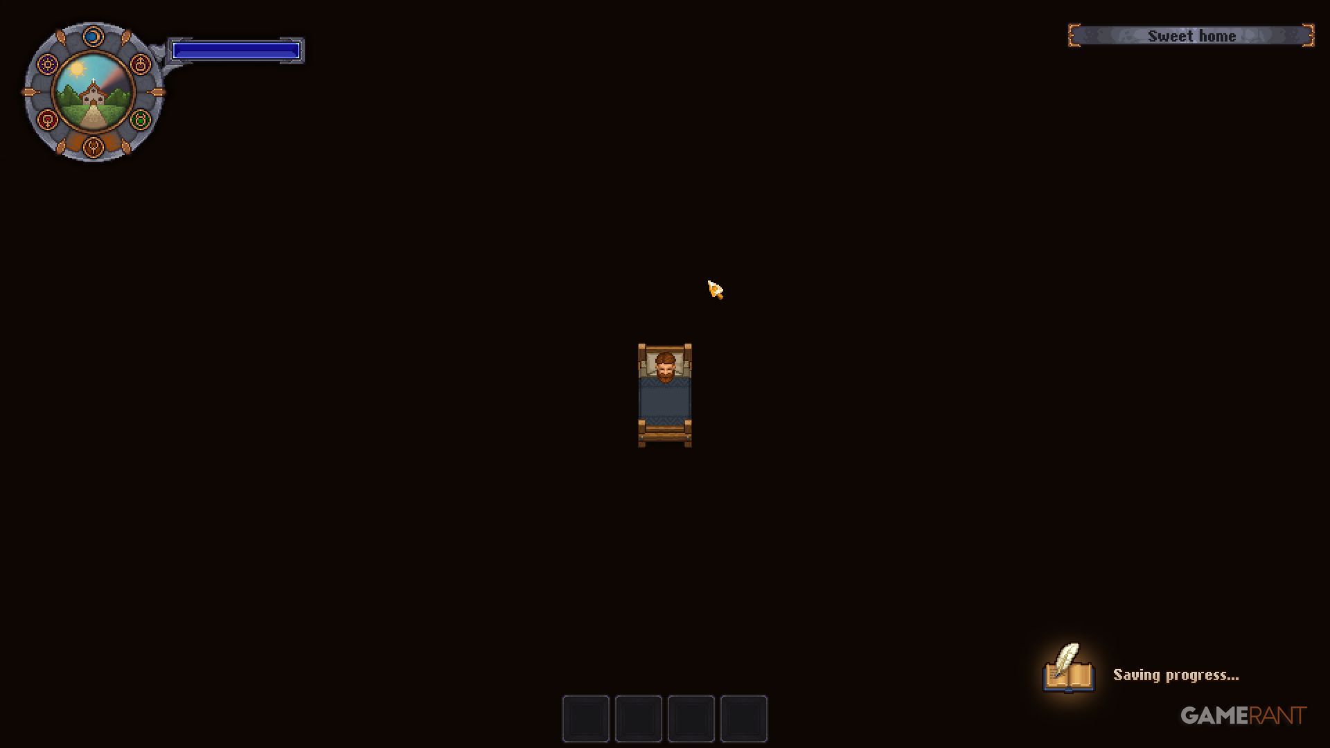 Помимо сохранения игры, сон также восстанавливает энергию, которая отображается синей полосой. Спать можно сколько угодно, чтобы полностью её восполнить. Время суток отображается движущимся солнцем и луной в верхнем левом углу экрана.