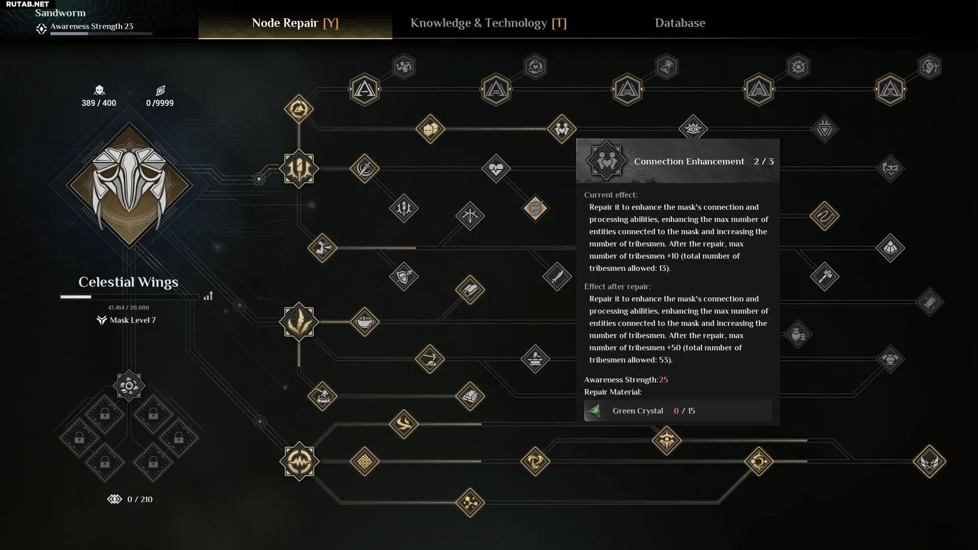 Сначала нажмите Y, чтобы открыть экран улучшения нод маски. Затем найдите ноду «Усиление связи». Она находится во втором ряду в самом верху. Для разблокировки и улучшения этой ноды вам понадобится много зеленых кристаллов, которые обычно можно найти в многочисленных руинах, разбросанных по обеим картам игры.