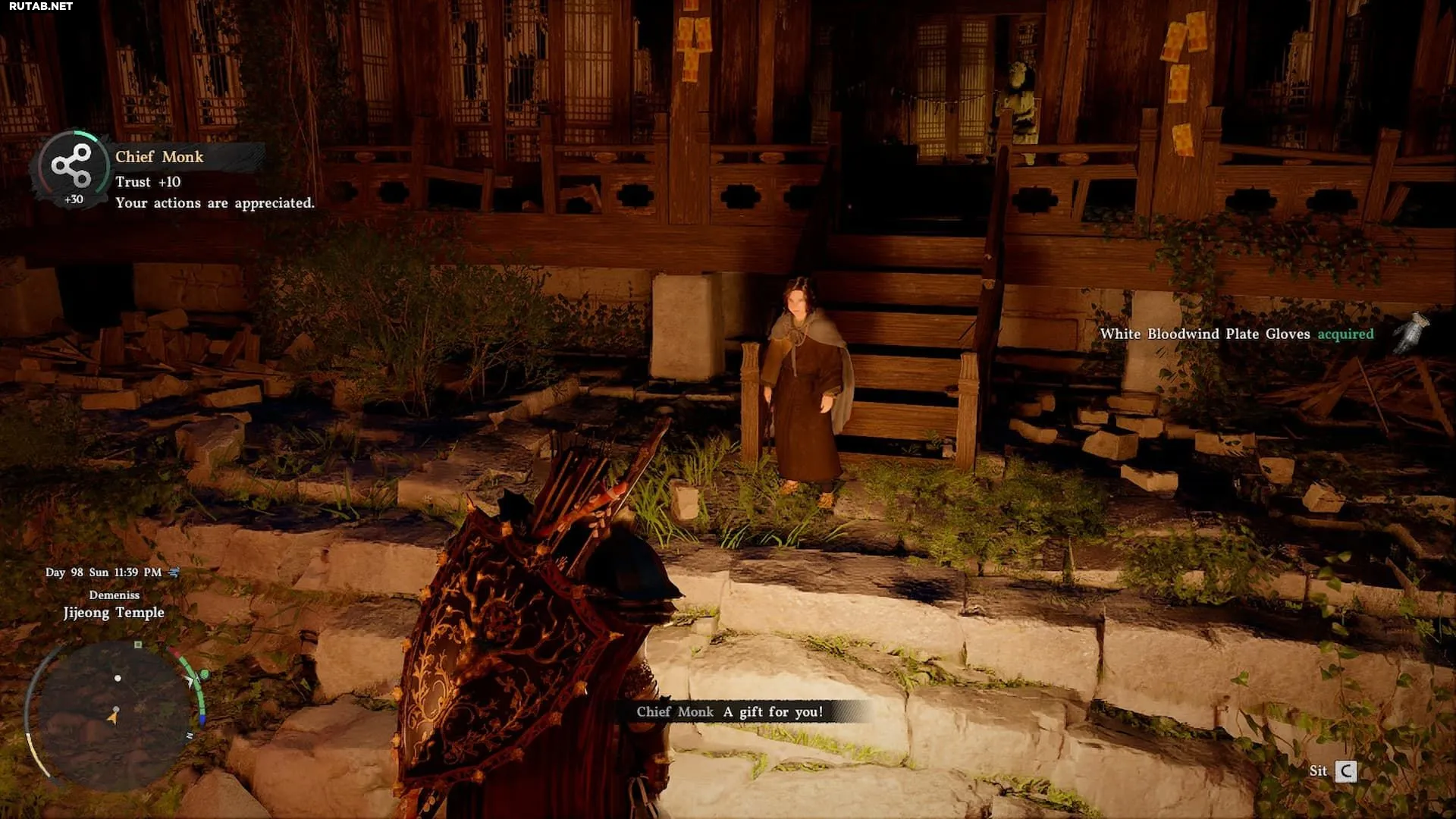 Перчатки дарит Настоятель в храме Чичжон. Он принимает любые овощи в подарок, так что повысить доверие не составит труда. Важное замечание: если вы уже завершили сюжетную линию храма, Настоятель исчезнет до момента прохождения основной кампании и эпилога.