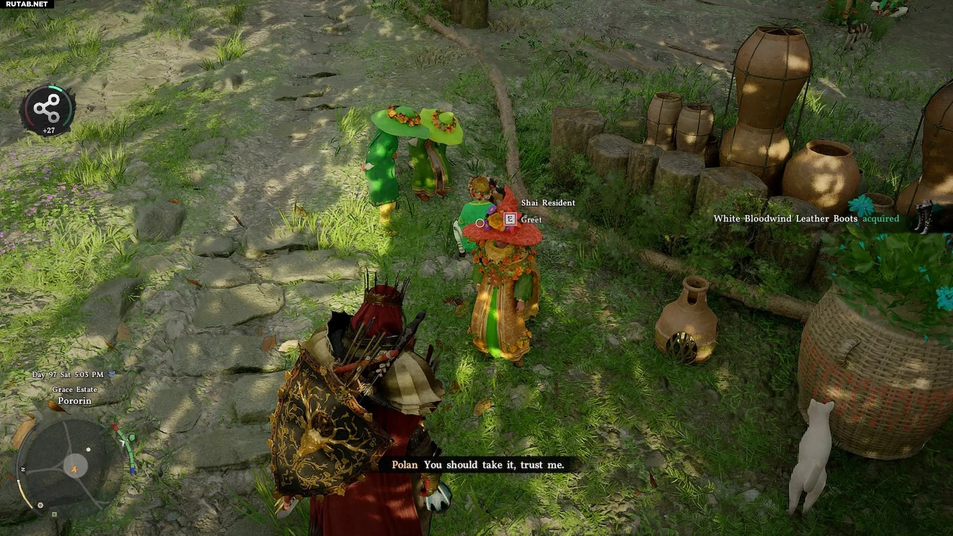 Сапоги дарит Полан, вождь Порорина. Он принимает корзины с цветами, а также рога и грибы. Полан тоже перемещается, но его легко опознать по большой красной шляпе. Чтобы попасть в Порорин, сначала нужно выполнить квест «Недоступная деревня». Полан станет доступен на втором этапе цепочки квестов «Дети леса».