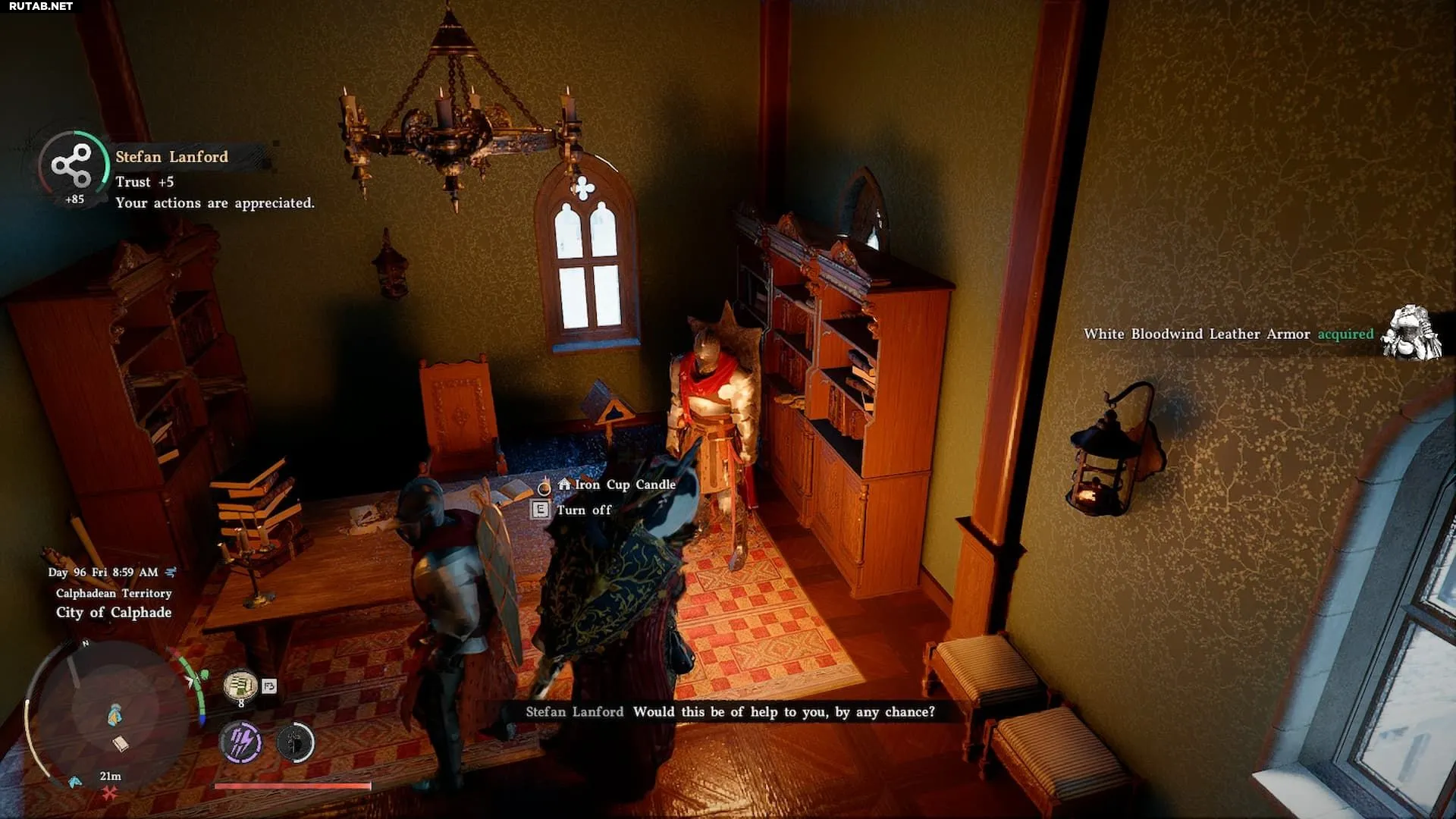 Эту часть брони дарит Стефан Лэнфорд, лорд Кальфада. Он появится в замке города после его освобождения по сюжету. Его можно найти в главной спальне на верхнем этаже, в соседнем кабинете (потребуется ключ) или на тренировочном плацу. Лэнфорд принимает в подарок только горшки или корзины с цветами. Их можно купить в лавке провизии в Эрнанде или в других городах.