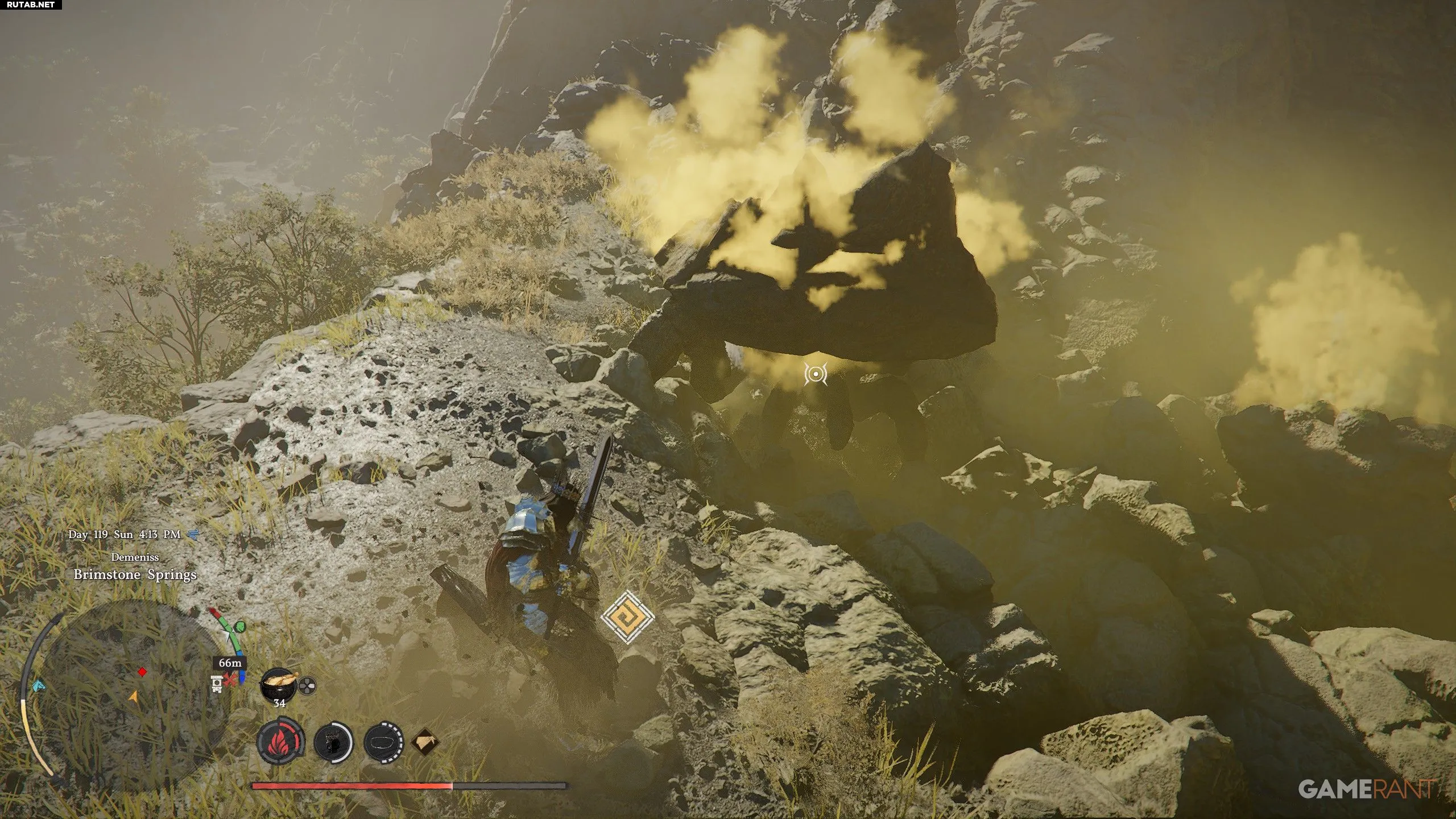 - Атакуйте камни, из которых бьёт вода, чтобы они взорвались и выпало 2+ единицы серы.