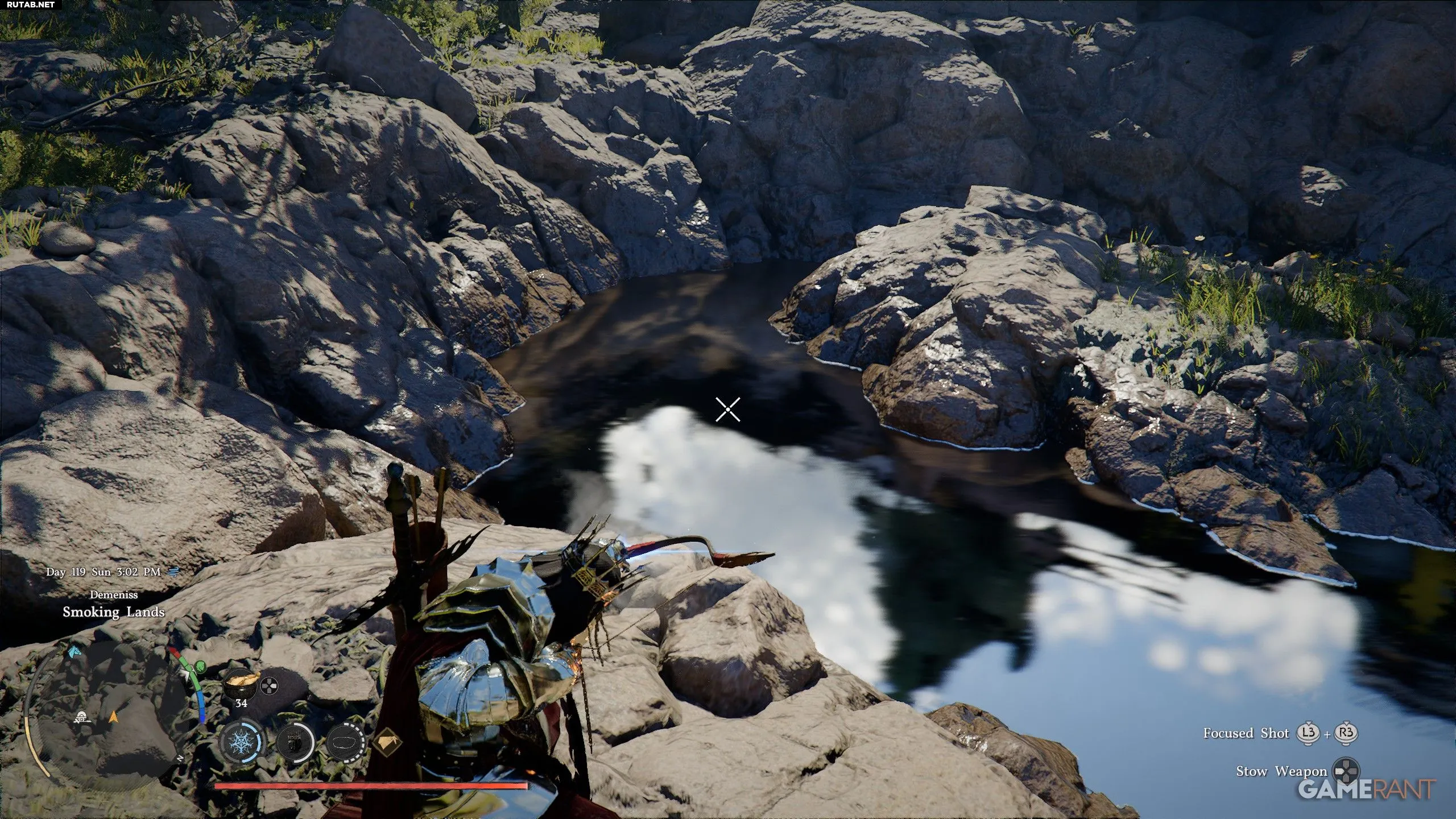 - Нацельтесь из лука в лужу, удерживайте L2 и выпустите ледяной «Пронзающий ветер». Это создаст собираемую ртуть.