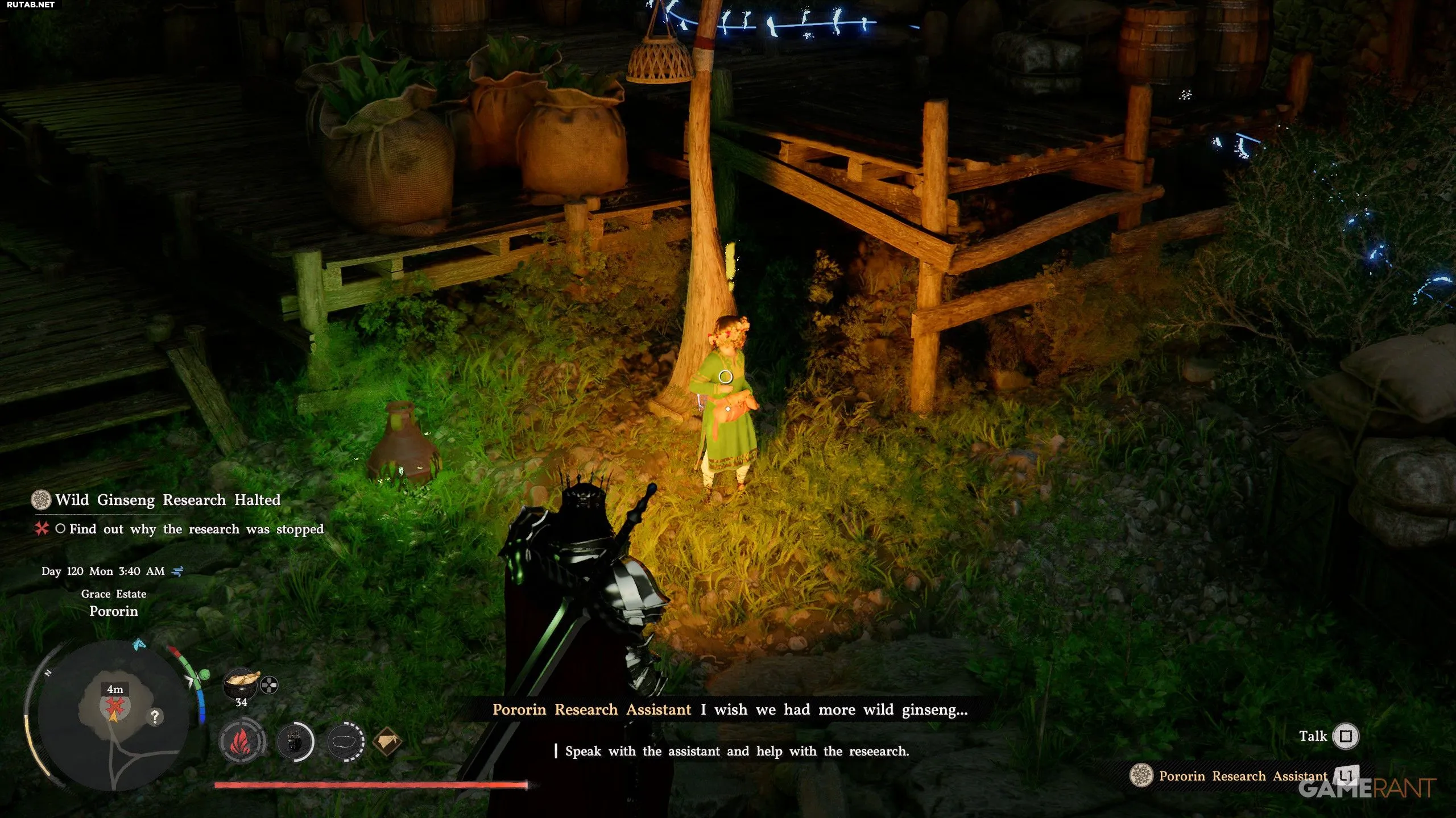 - Когда появится квест «Исследование женьшеня приостановлено», найдите в Порорине помощника исследователя и поговорите с ним.