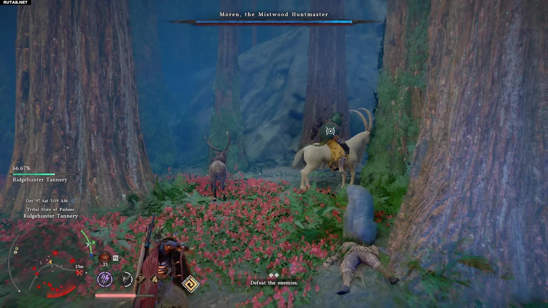 Этот босс может доставить немало хлопот. Он — конный лучник, восседающий на снежном ибексе, а место битвы контролируется его племенем охотников, которые будут пытаться вам мешать. Морен патрулирует окрестности в районе метки задания. Его легко заметить благодаря крупным размерам его скакуна, либо можно использовать «Отслеживание», направив перед собой «Огонь» и следуя по жёлтым линиям.