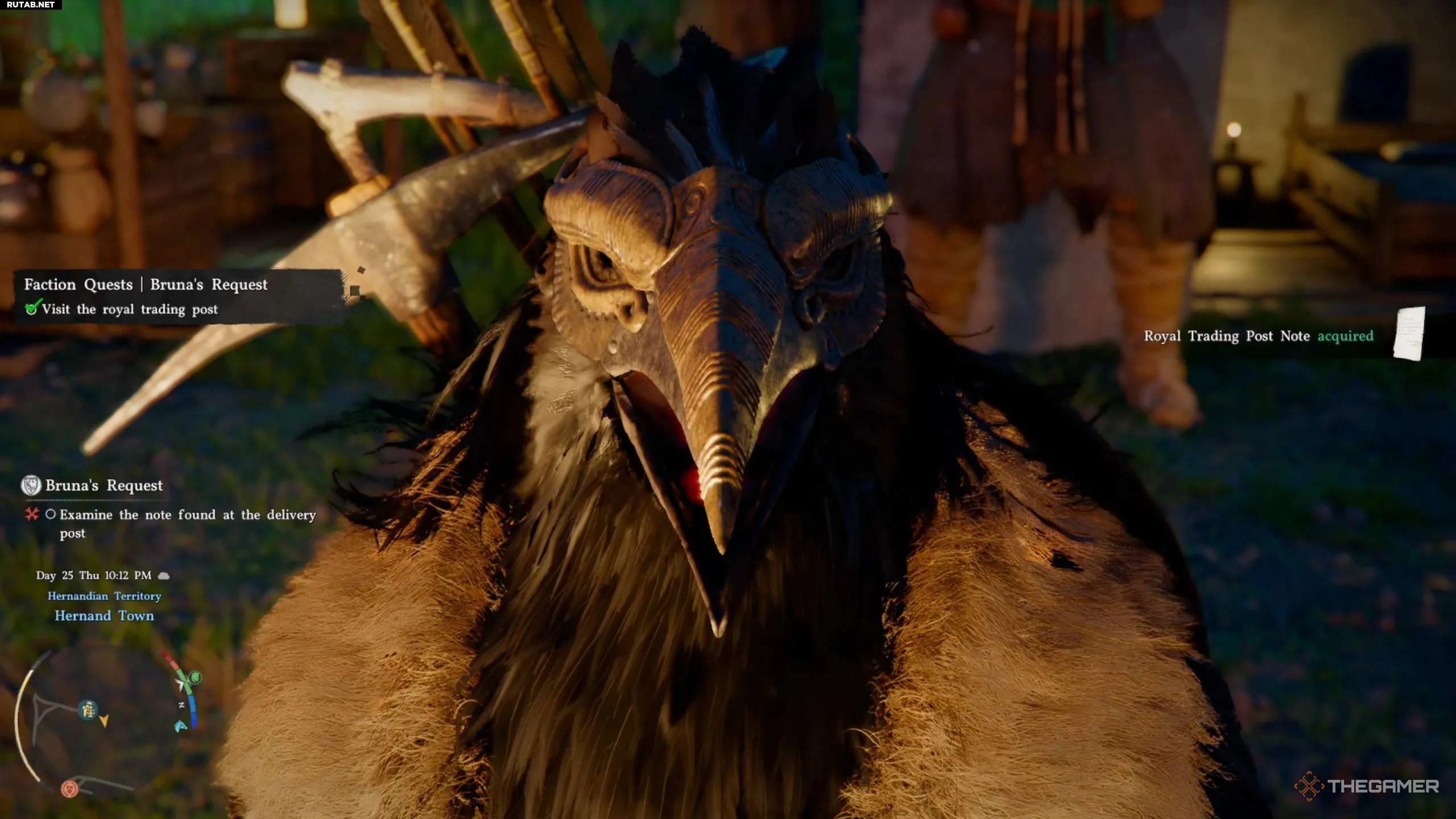 Подойдите к ней и найдите на столе записку. В ней указан новый пункт назначения — «Королевский торговый пост». Там вам нужен неигровой персонаж в красной шляпе, стоящий у главной лавки. Поговорив с ним, он попросит вас отвести взгляд.