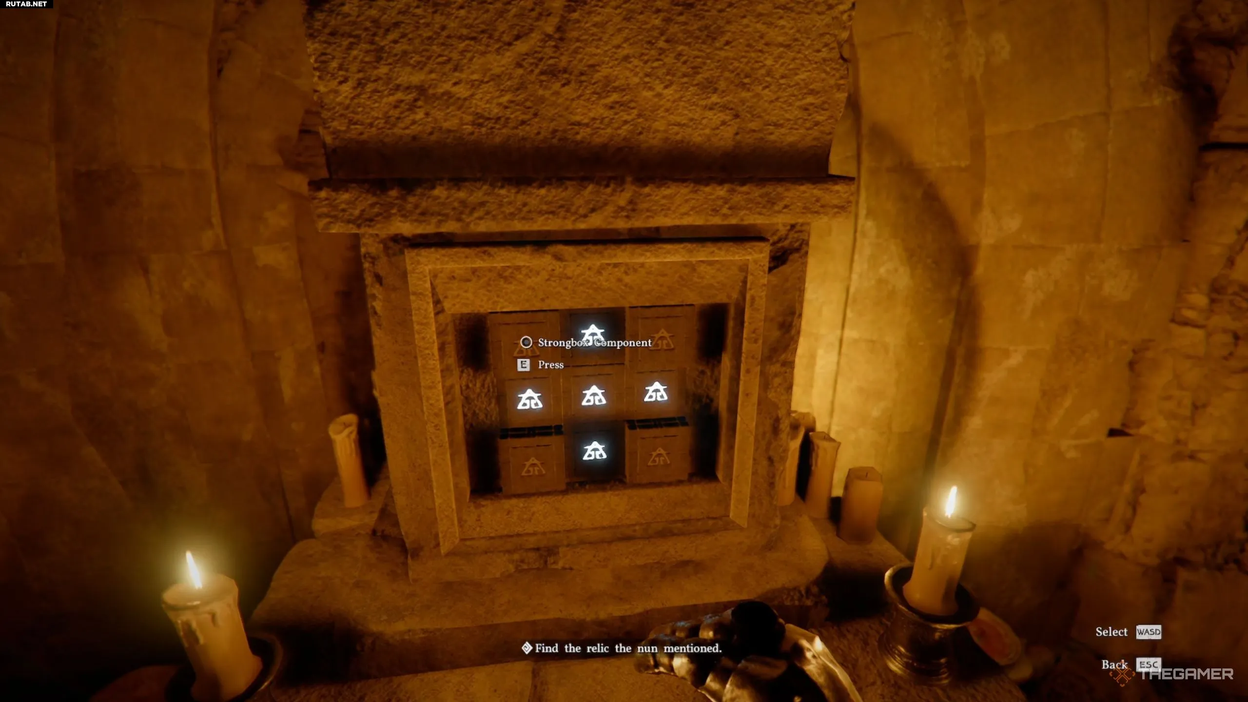Спустившись в подвал, вы обнаружите небольшую головоломку с плитками, охраняющую церковную реликвию. В этой головоломке можно нажимать только на выступающие плитки, но при этом все плитки, соединенные с ними по горизонтали и вертикали, также придут в движение. Например, если выбрать центральную плитку, изменится весь средний ряд и столбец.