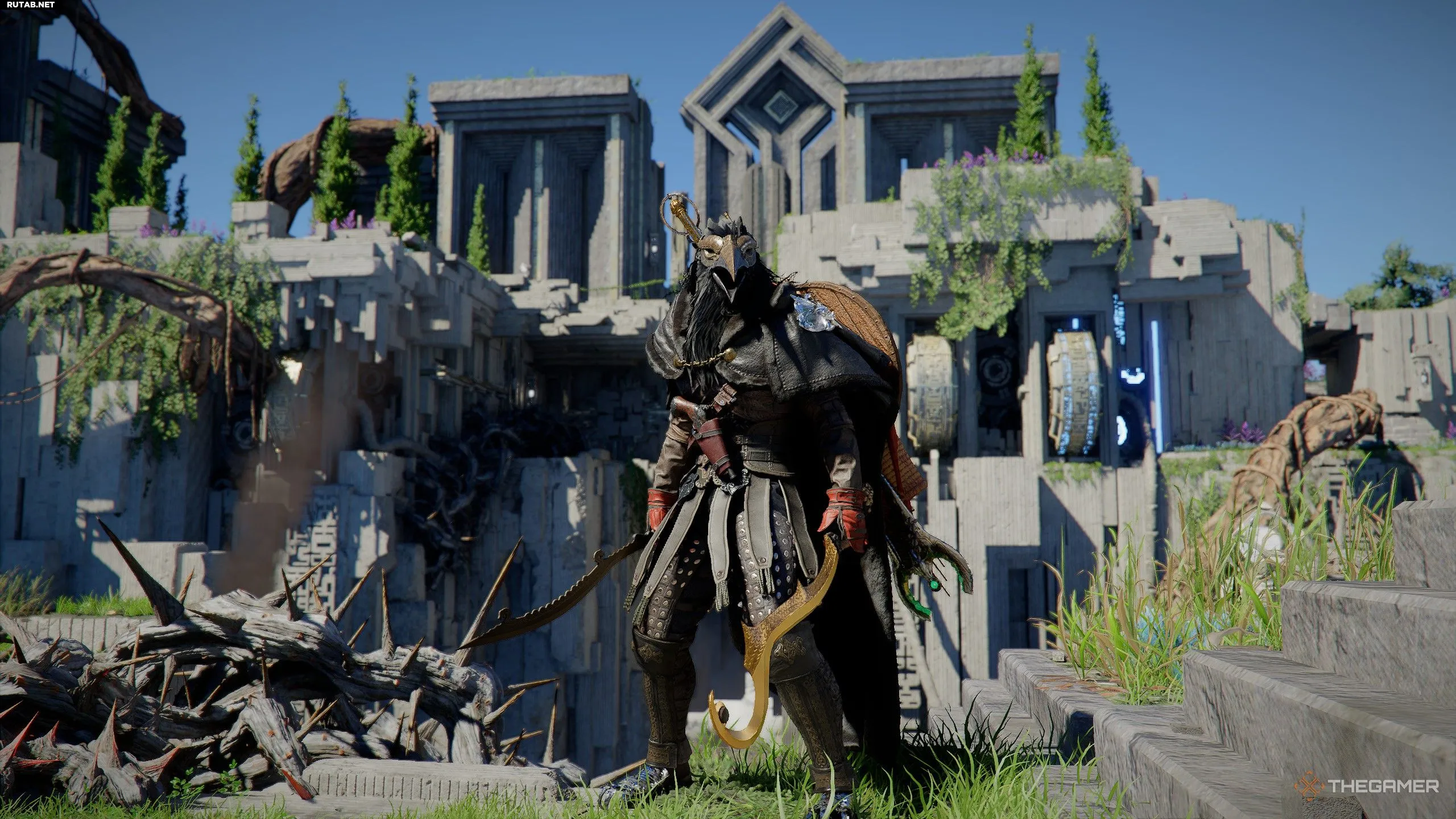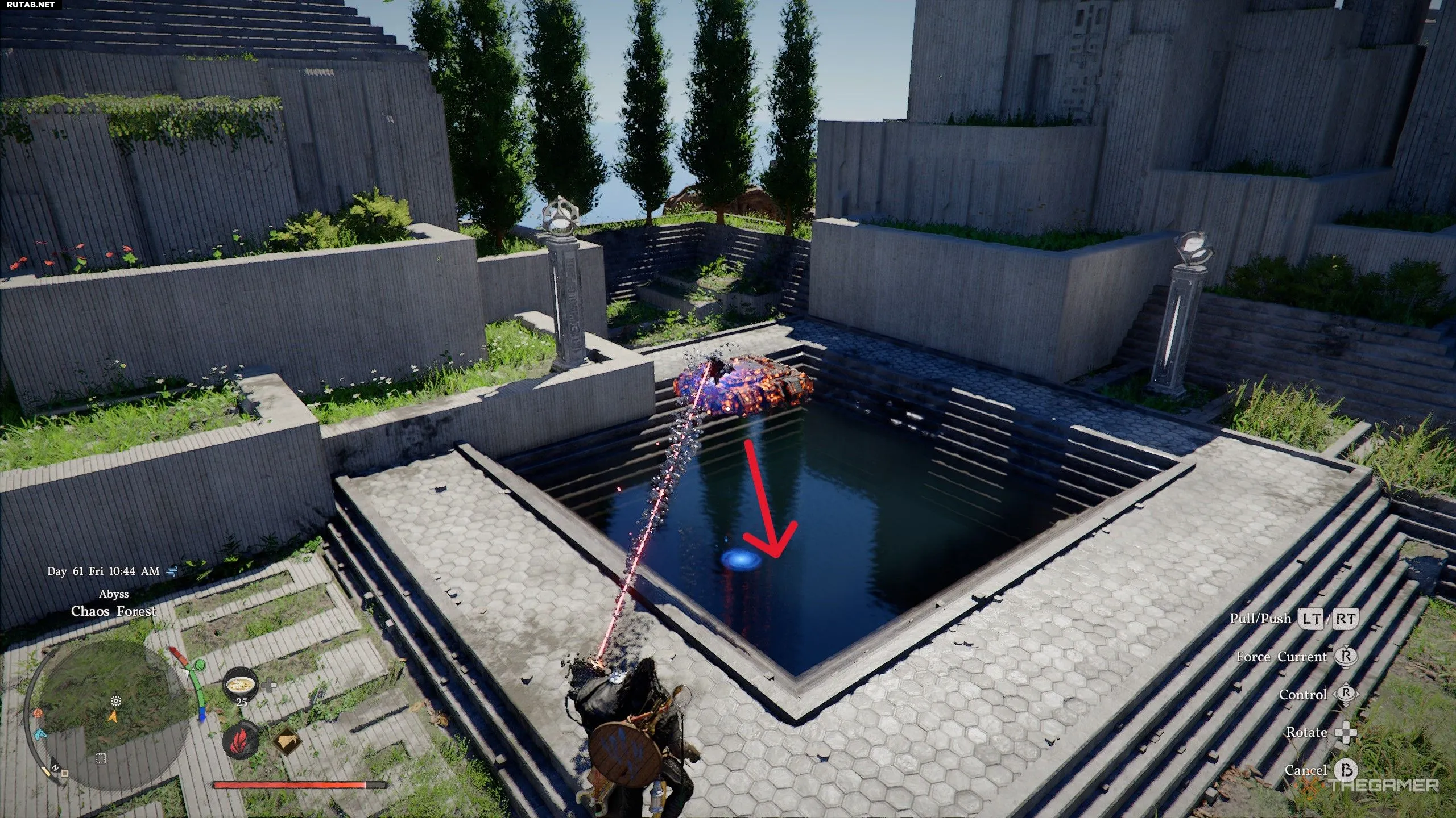 Добравшись до локации, подойдите к большой каменной двери и используйте навык «Подъём», чтобы поднять её. Войдите на остров, остерегаясь шипастых кустов. Если у вас открыт навык «Элемент: Тлеющий удар», используйте его на кусты справа, за большим водоёмом.