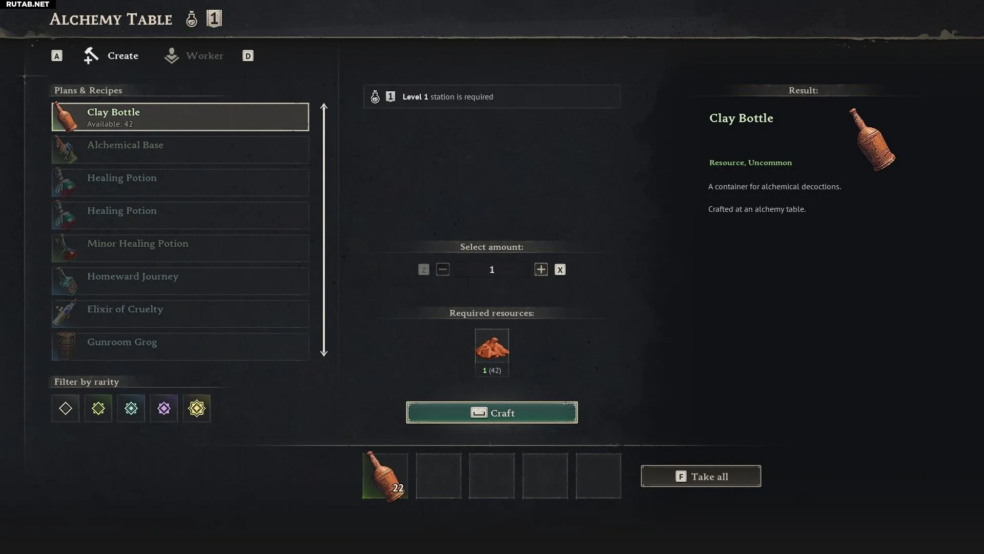 Для добычи глины вам понадобится кирка. Достаточно примитивной каменной кирки. Чтобы её создать, постройте верстак, соберите 3 единицы дерева и камня и скрафтите инструмент. После добычи ресурсы возобновятся через несколько игровых дней, поэтому для постоянных поставок лучше исследовать соседние острова.