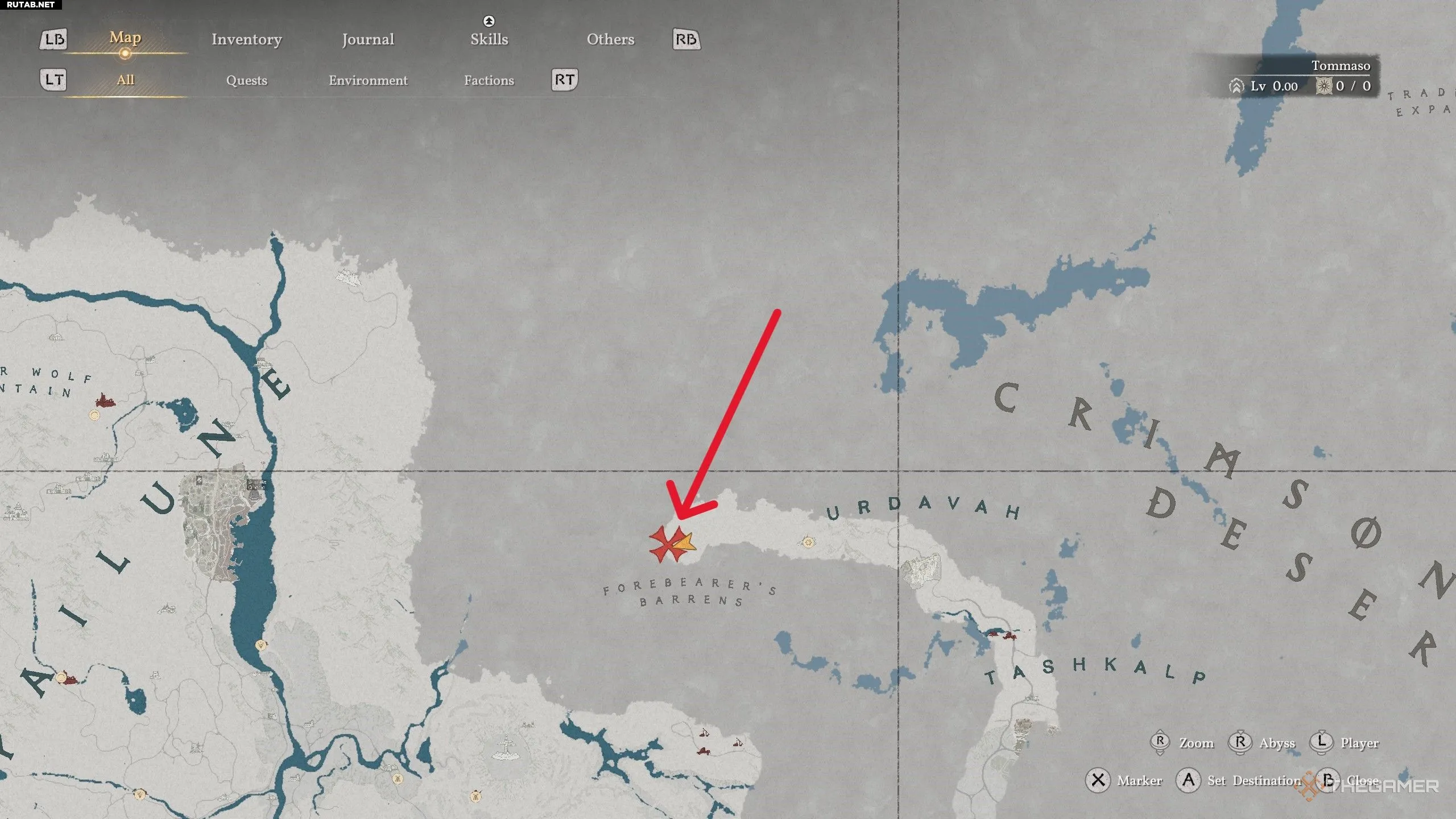 Чтобы найти Алебастровый ятаган, вам нужно отправиться на северо-запад, в регион Багровой пустыни. Он находится в провинции Урдава, чуть выше Пустошей Предтеч. Установите маркер на карте примерно на сантиметр выше буквы «B» в названии «Forebearer's Barrens».