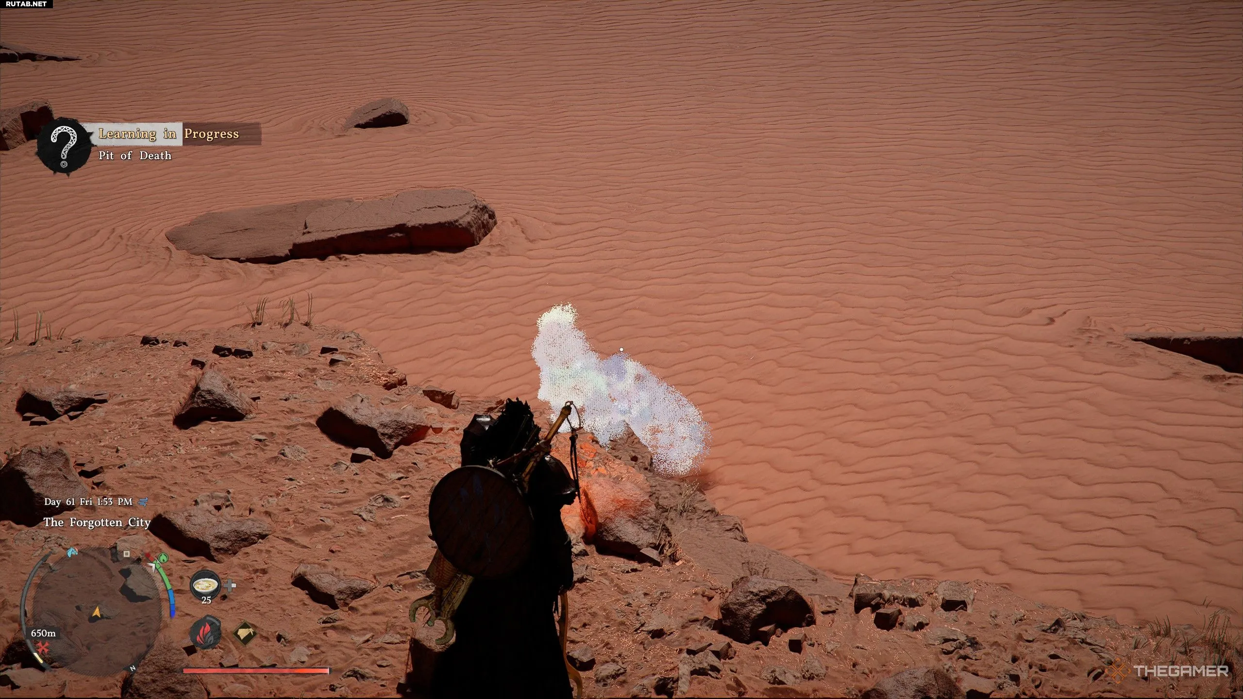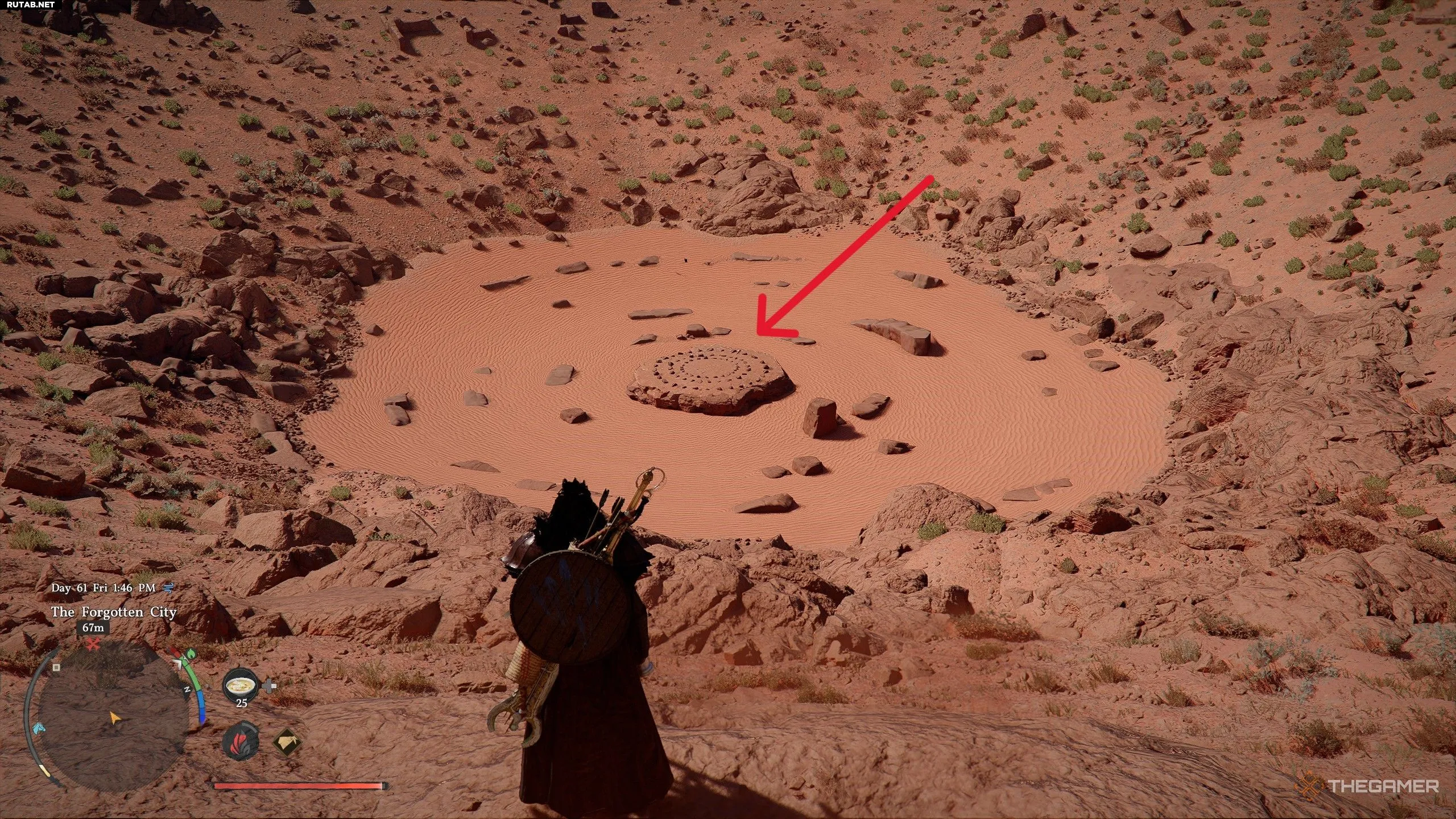 Добравшись до места, ищите большую круглую песчаную воронку с каменным кольцом посередине. Двигаясь к центральной платформе, перепрыгивайте с камня на камень. Это зыбучий песок, и бежать по нему обычным способом, не проваливаясь, невозможно.