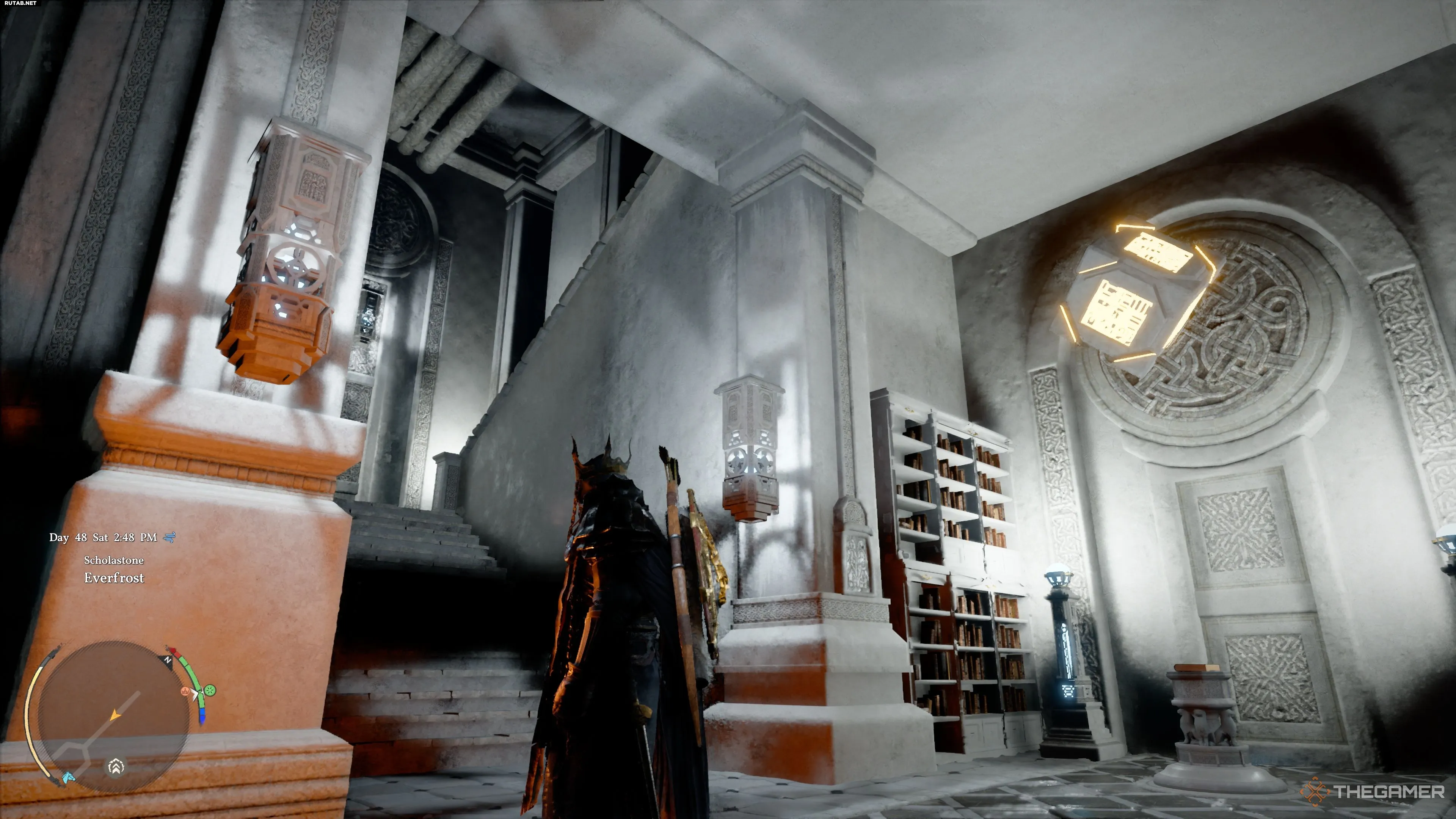 Чтобы добраться до него, войдите в библиотеку и пройдите через автоматически открывающуюся каменную дверь в зале с огромным парящим глобусом.