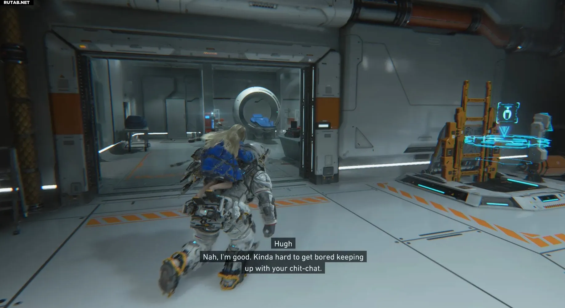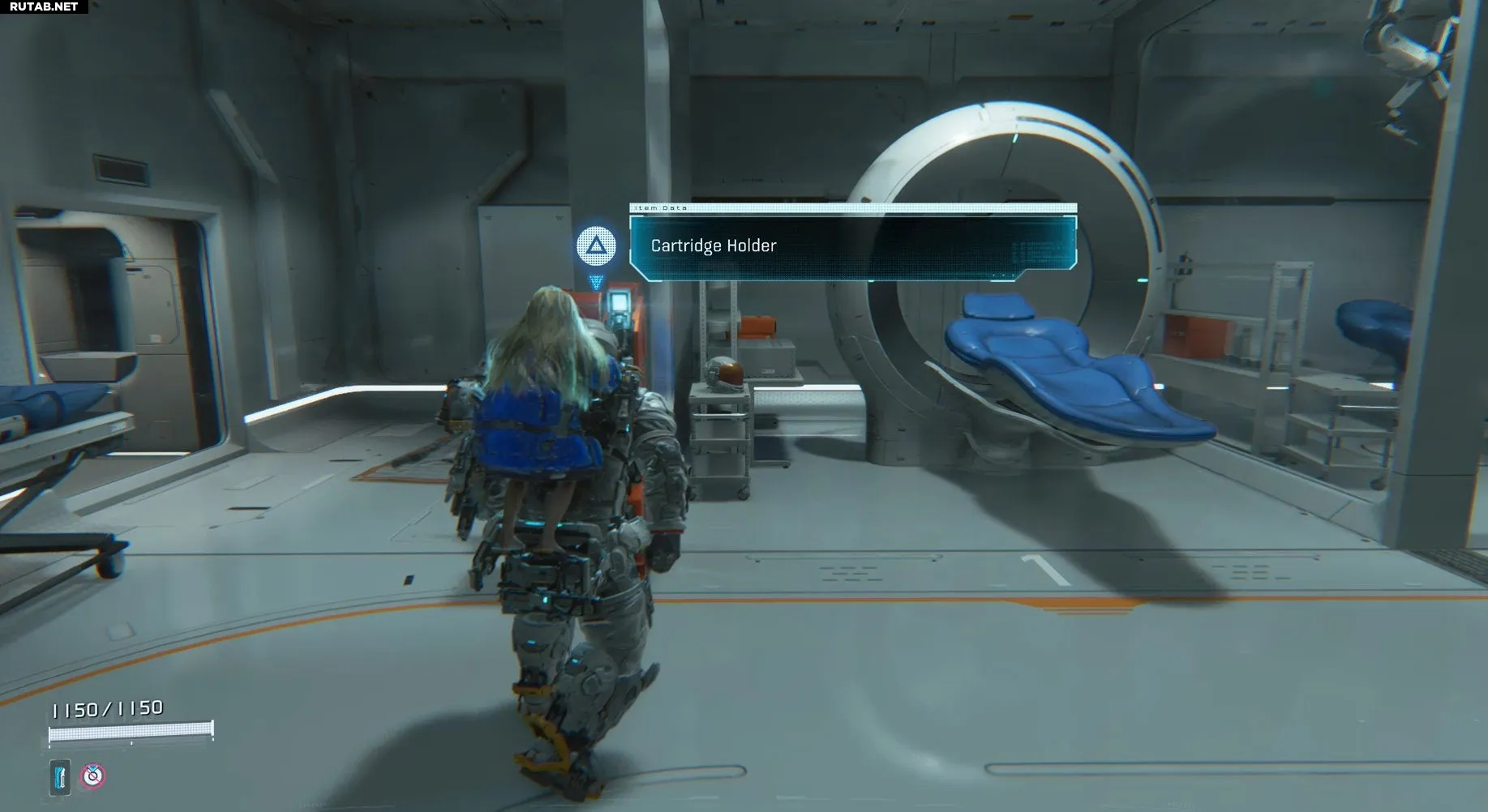 Чтобы найти первый держатель, отправляйтесь в комнату с терминалом трамвая в Секторе 1, Блок 3. От терминала пройдите через двери слева от него. Внутри комнаты, слева от футуристичного аппарата МРТ, будет оранжевое медицинское устройство. Взаимодействуйте с ним, чтобы забрать держатель.