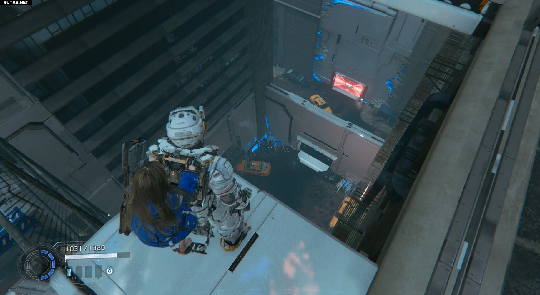 Наверху вы легко заметите оранжевое медицинское устройство с держателем. Чтобы покинуть это место, взломайте ближайший узел и используйте управляемые им блоки, чтобы подняться в офисную зону выше — это ваш дальнейший путь по сюжету.