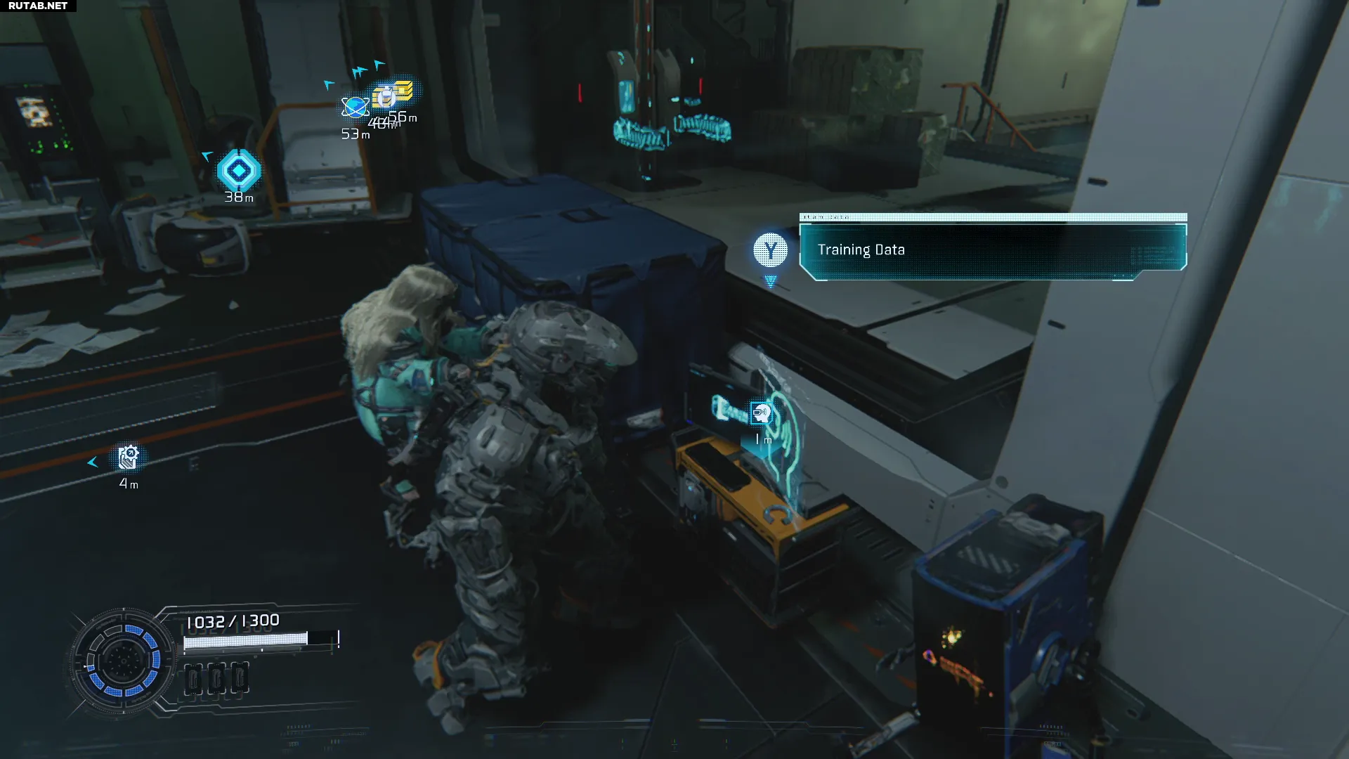 После прохождения всех трёх комнат в этой камере, в следующем помещении, сразу после череды боёв, вы найдёте учебные данные рядом со сломанной системой кабины, которые можно будет собрать (см. изображение ниже).