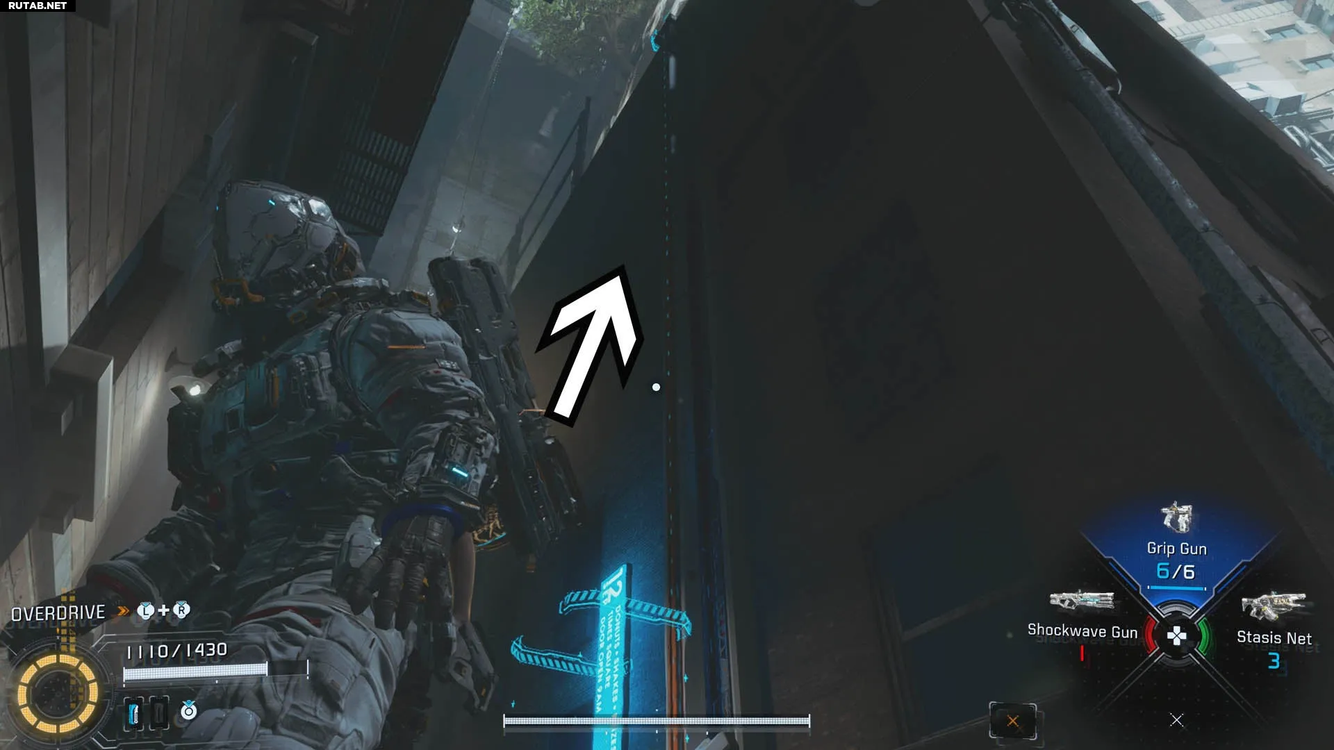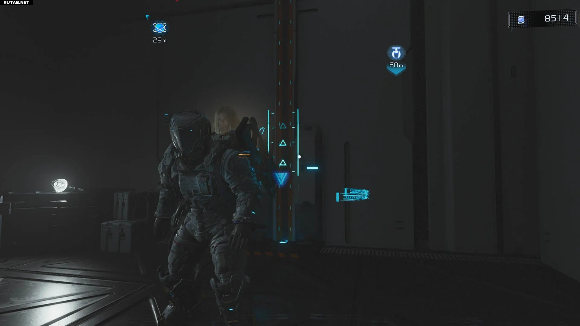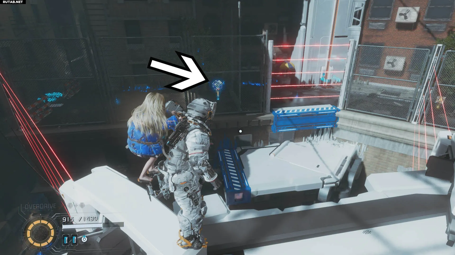 Двигайтесь по главному коридору к концу сектора. Перед тем как повернуть направо к узлу в большой арене, посмотрите налево — вы увидите лестницу. Поднимитесь по ней.