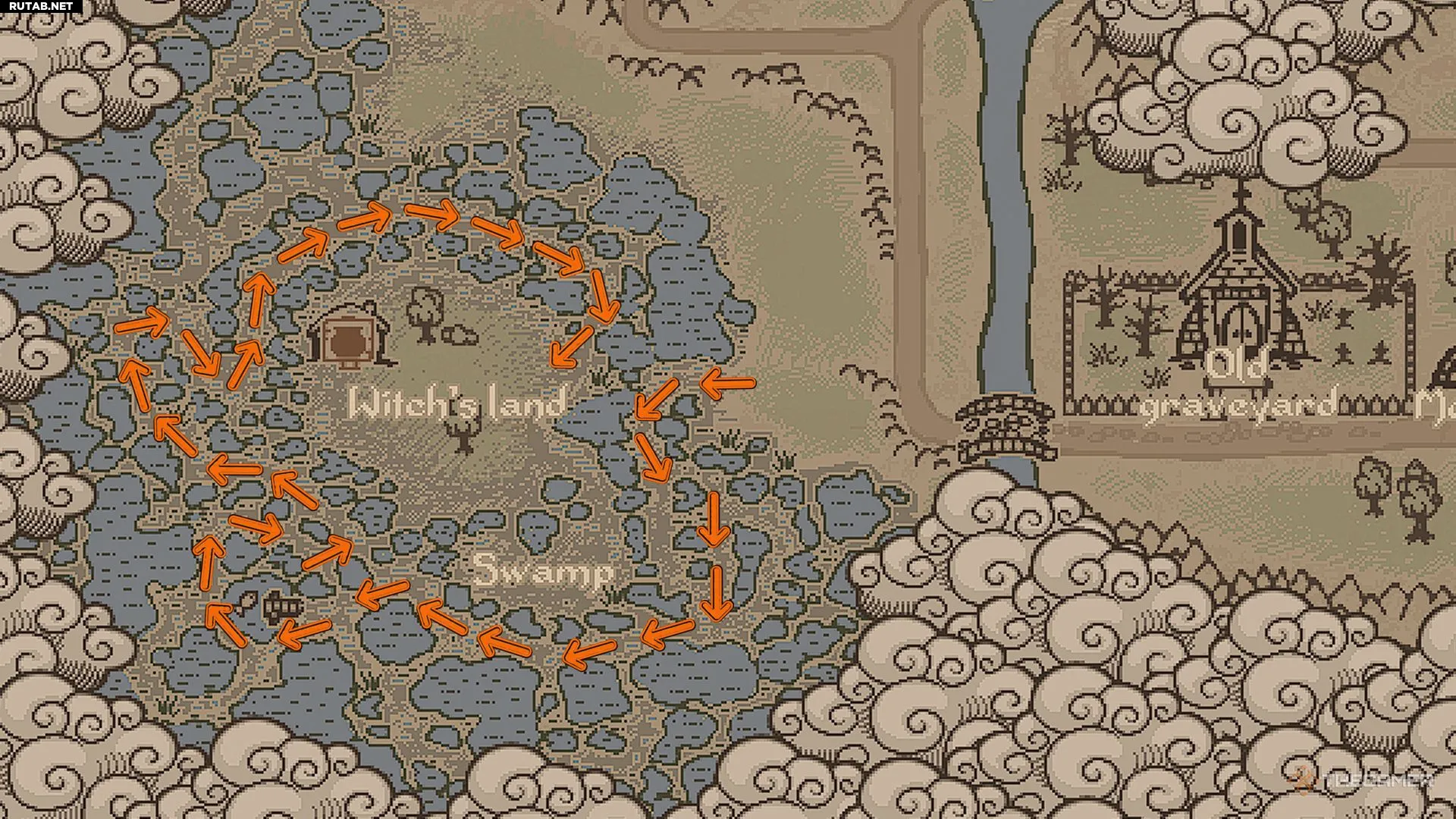 После починки моста идите на запад, к болоту. Спустившись на топи, двигайтесь по болоту по часовой стрелке, выбирая проходимые участки. Тропа извилиста, поэтому, если заблудитесь, откройте карту и следуйте по пути, огибающему воду.