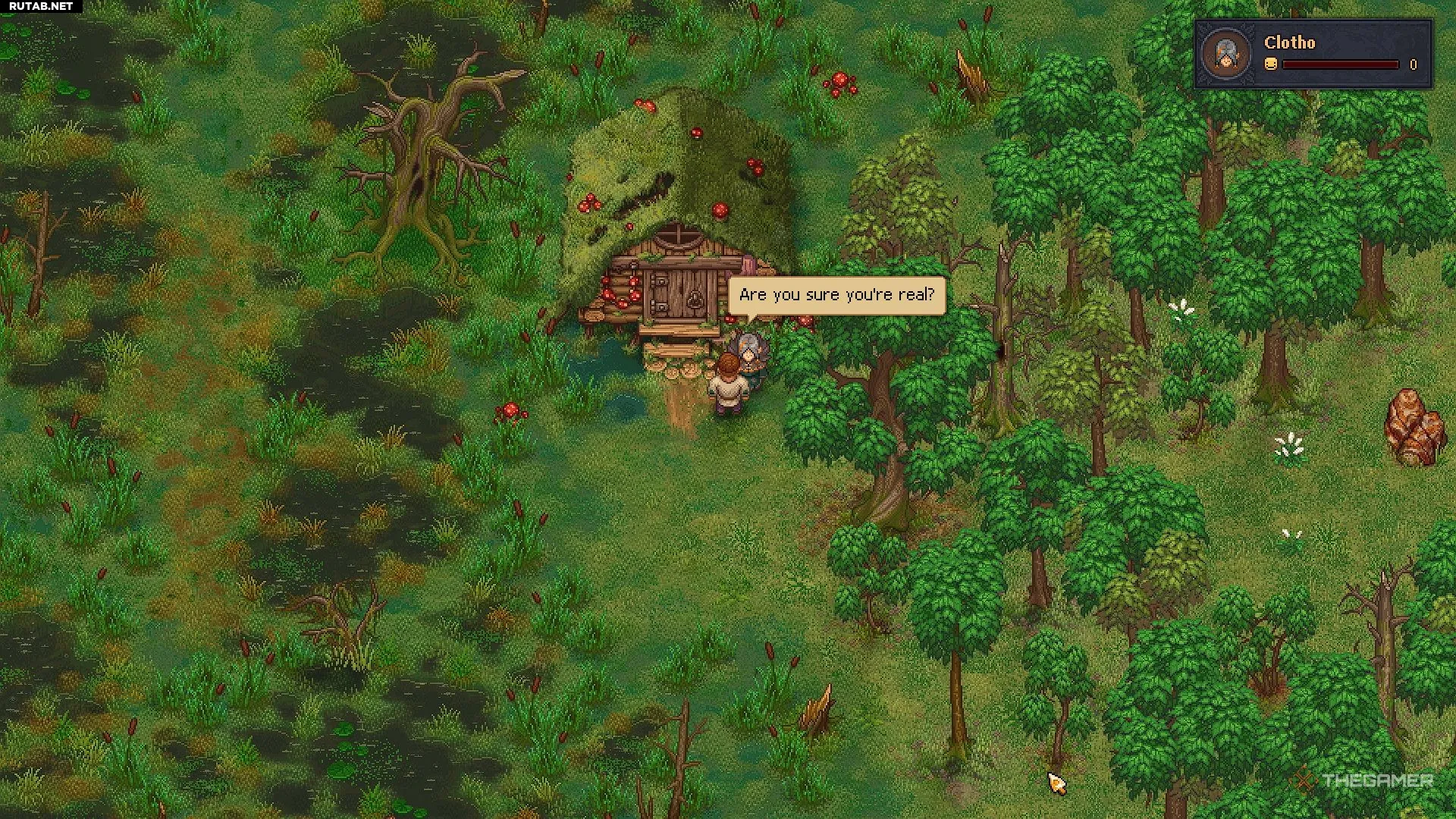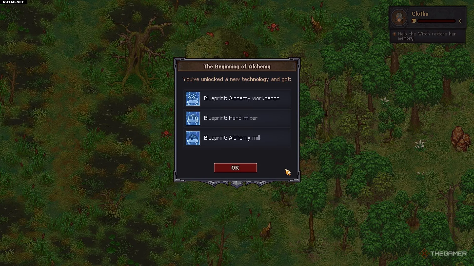 Заблудиться легко, но, двигаясь по кругу, вы найдёте хижину ведьмы, где вас ждёт Клото. Поговорите с ней, чтобы получить её задания и чертёж алхимического верстака.