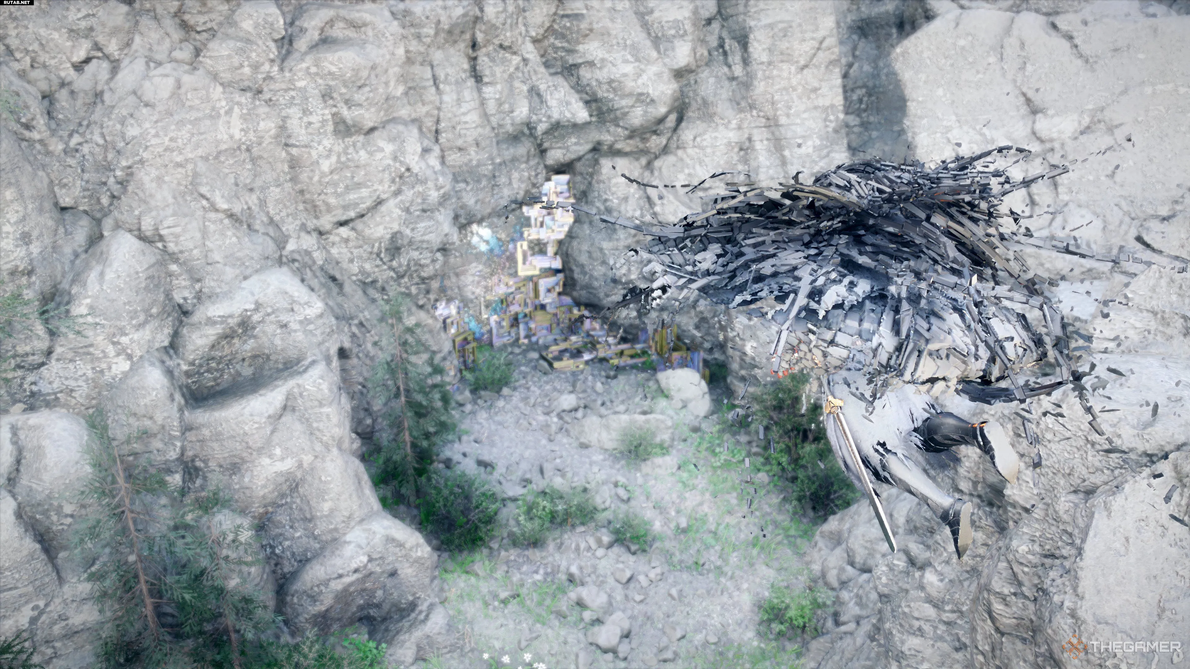 Идите к холмам к северо-востоку от перекрёстка, где вы заметите стену необычного цвета.
