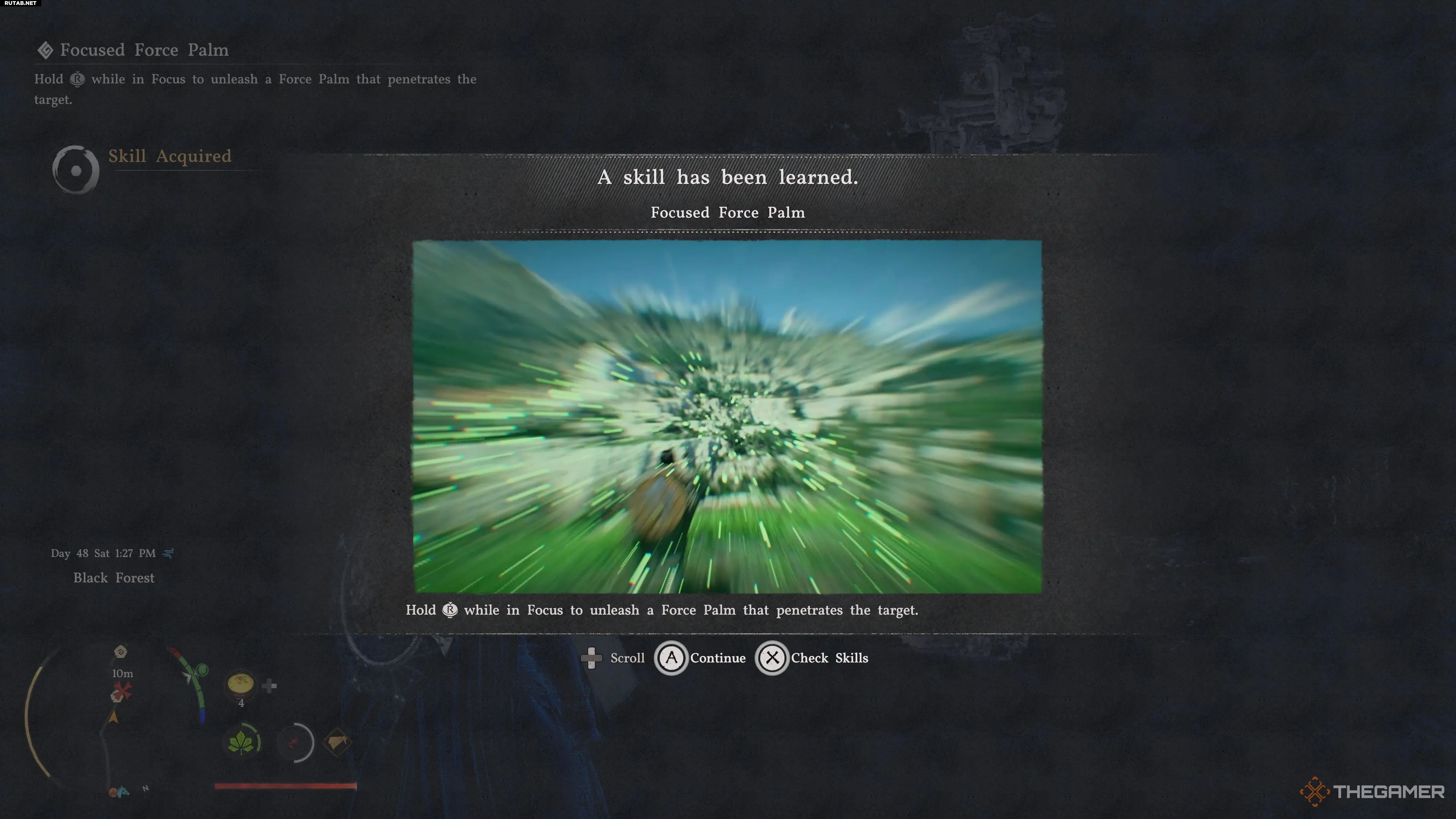 Подойдите к ней, и вы получите подсказку понаблюдать за методом изучения Удара пальмары: Фокусировка. Этот навык используется для разрушения определённых препятствий.