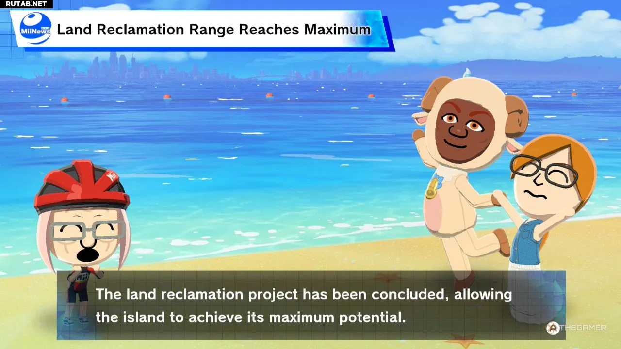 После того как вы создадите 10 отдельных Mii и расселите их по домам, вас встретит новостной репортаж, описывающий новую инициативу под названием «Проект по освоению земель». Это означает, что хотя сам остров не обязательно становится больше, количество свободного пространства вокруг него увеличивается.