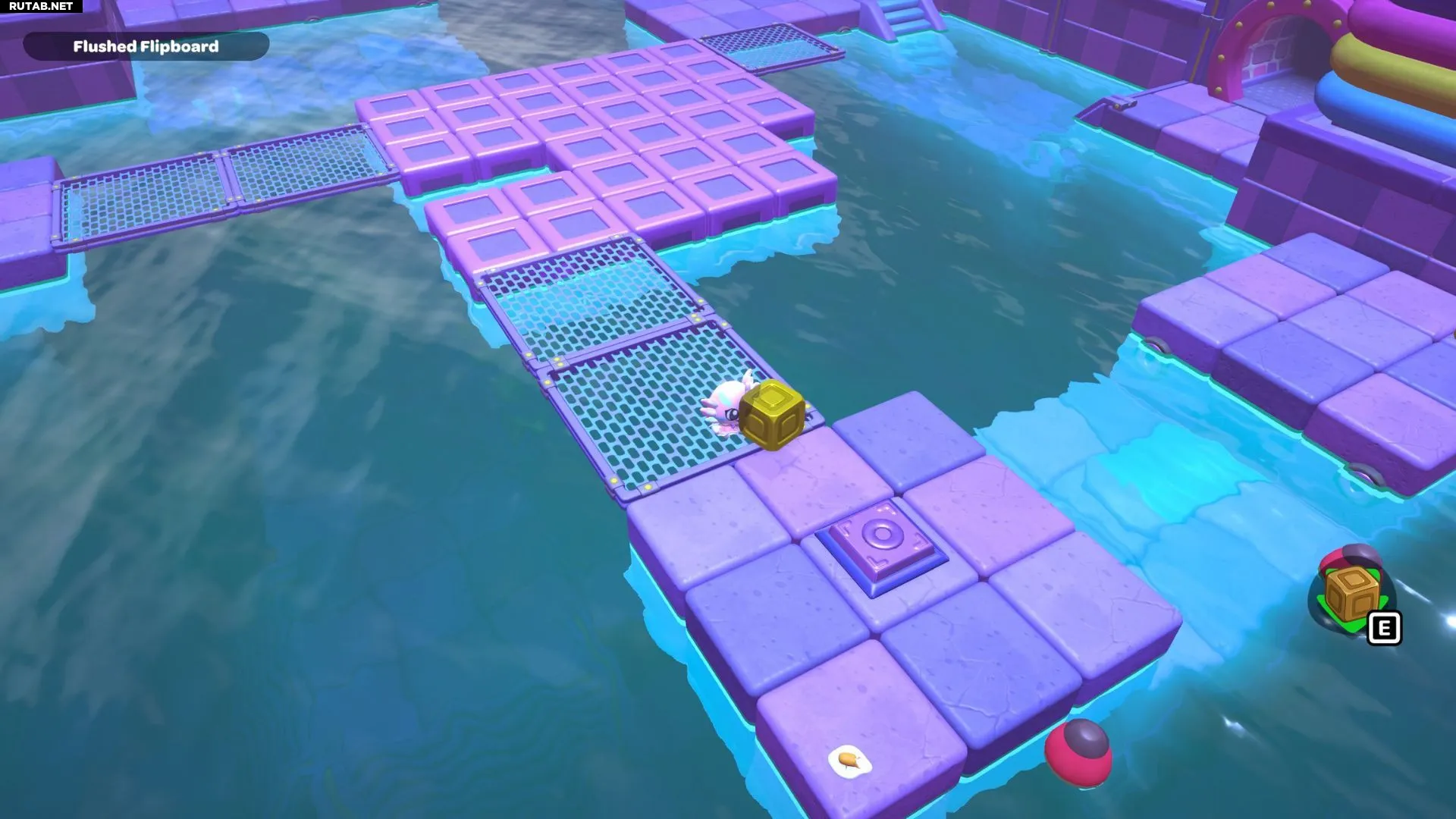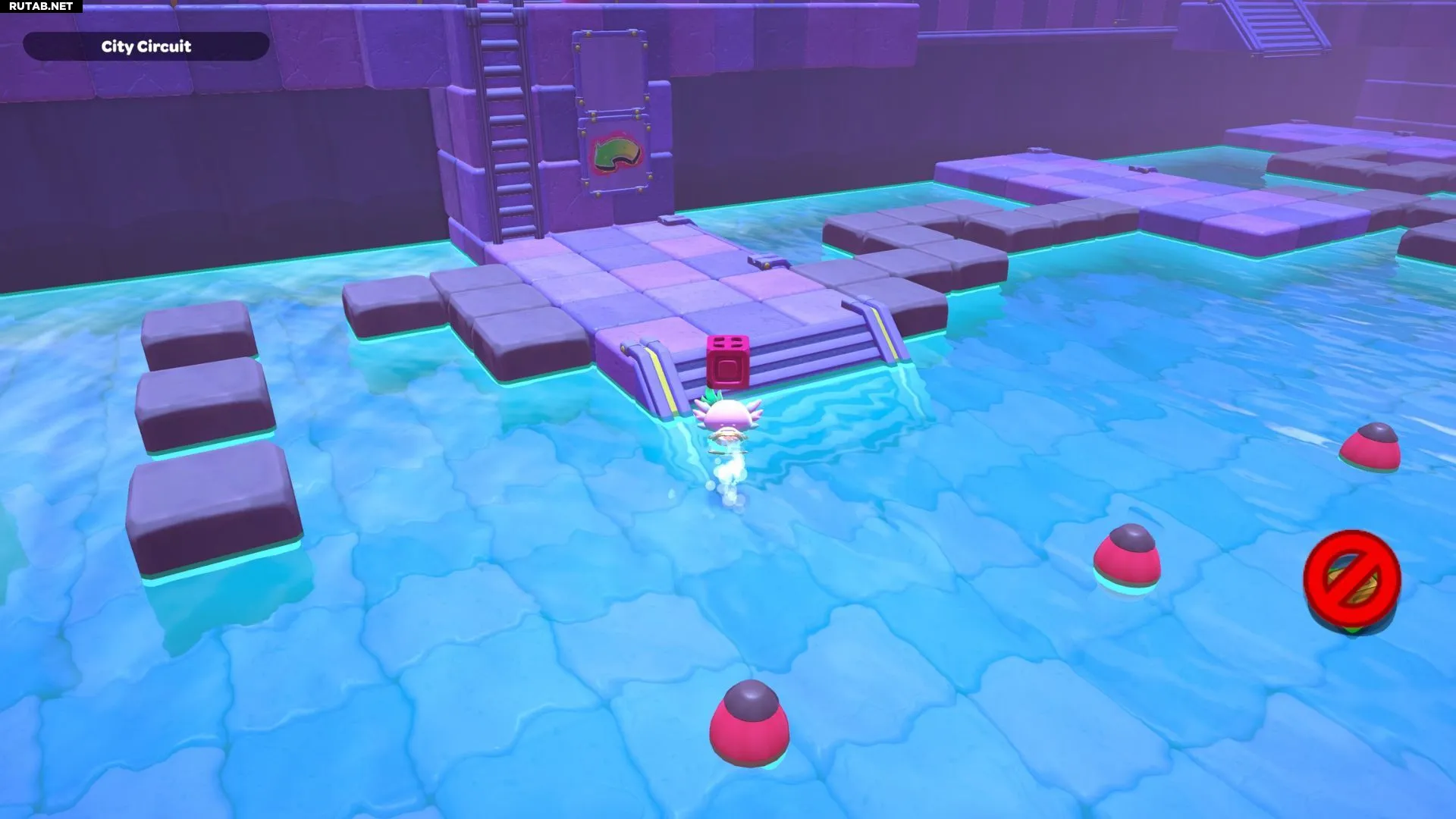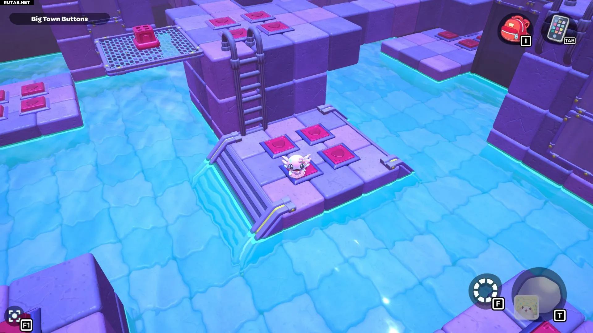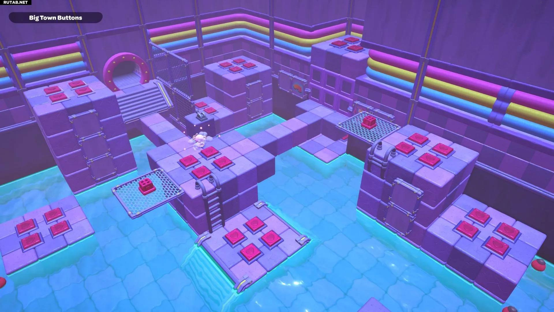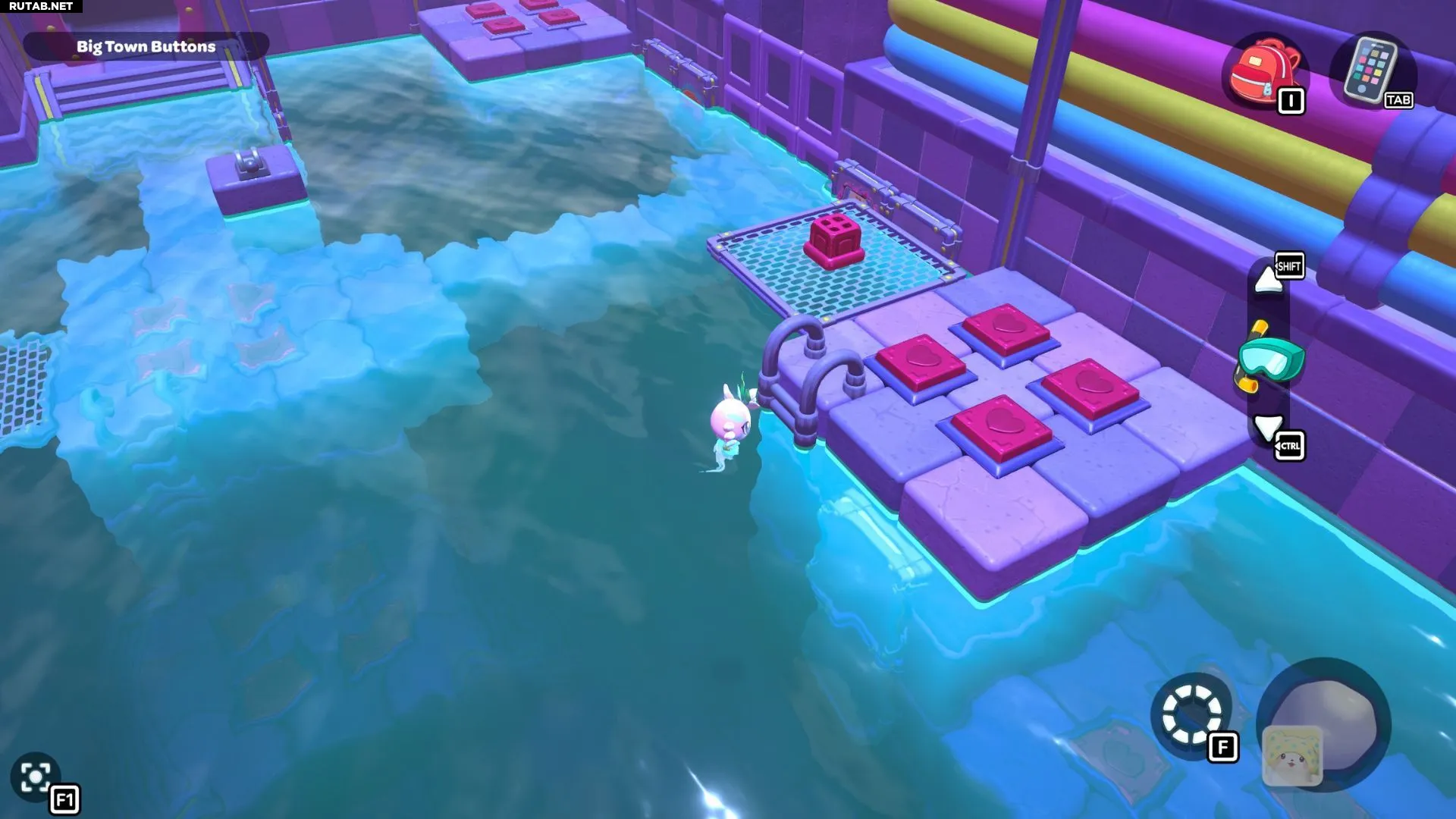 Проплывите к платформе на западе и поднимитесь по её лестнице. Прежде чем двигаться дальше, наступите на каждую кнопку на этой платформе.