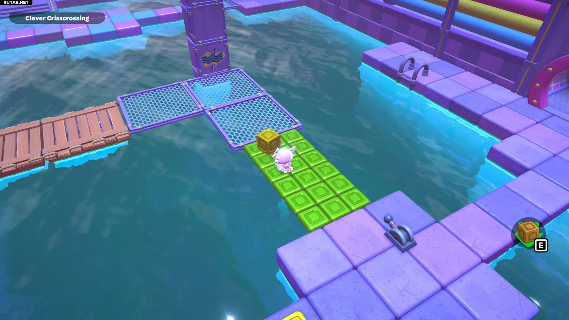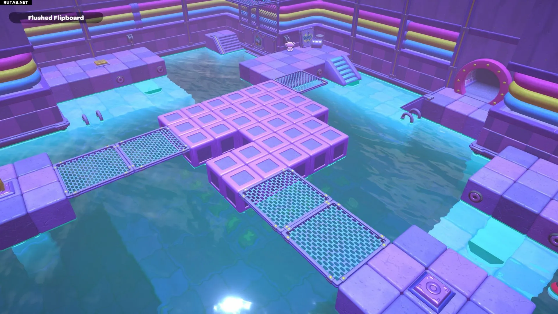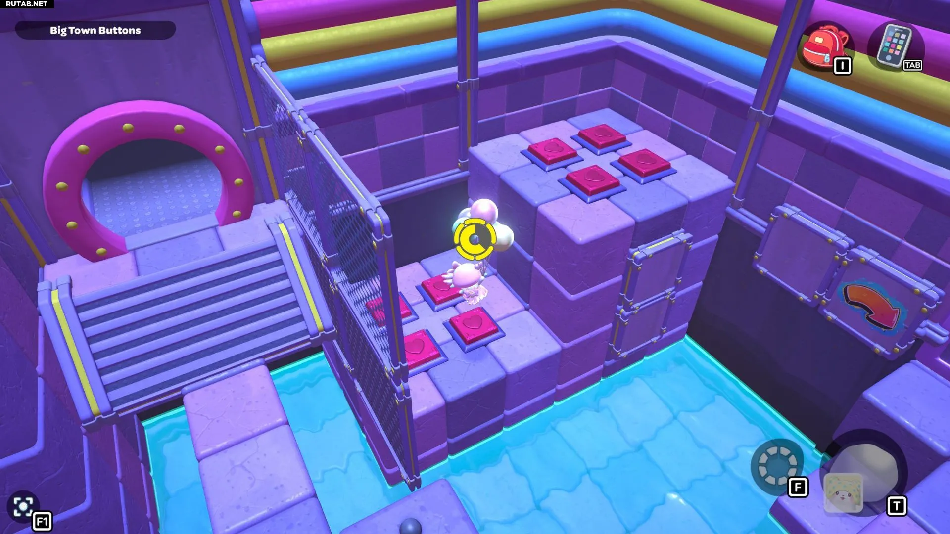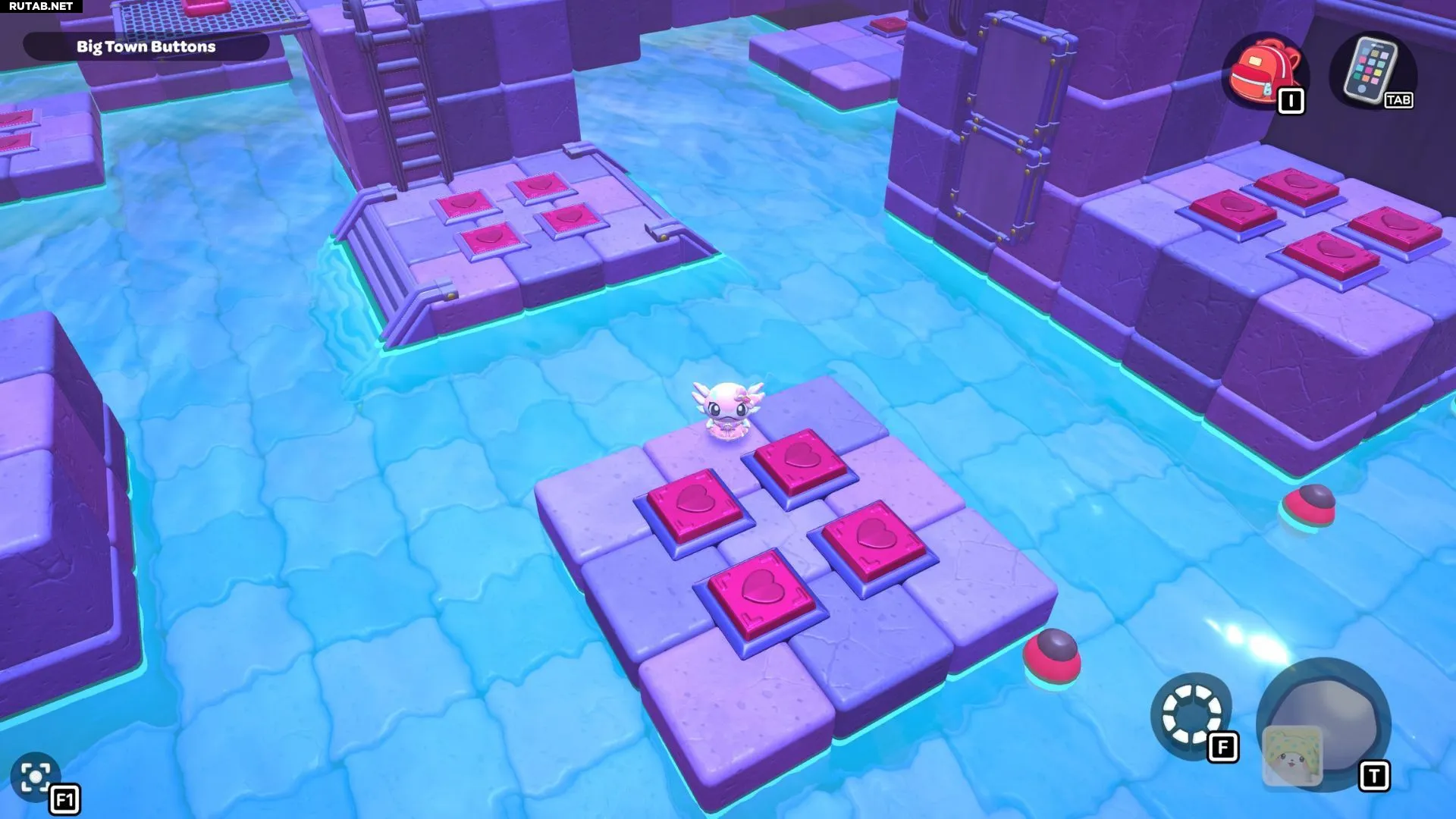 Проплывите к платформе на западе и поднимитесь по её лестнице. Прежде чем двигаться дальше, наступите на каждую кнопку на этой платформе.