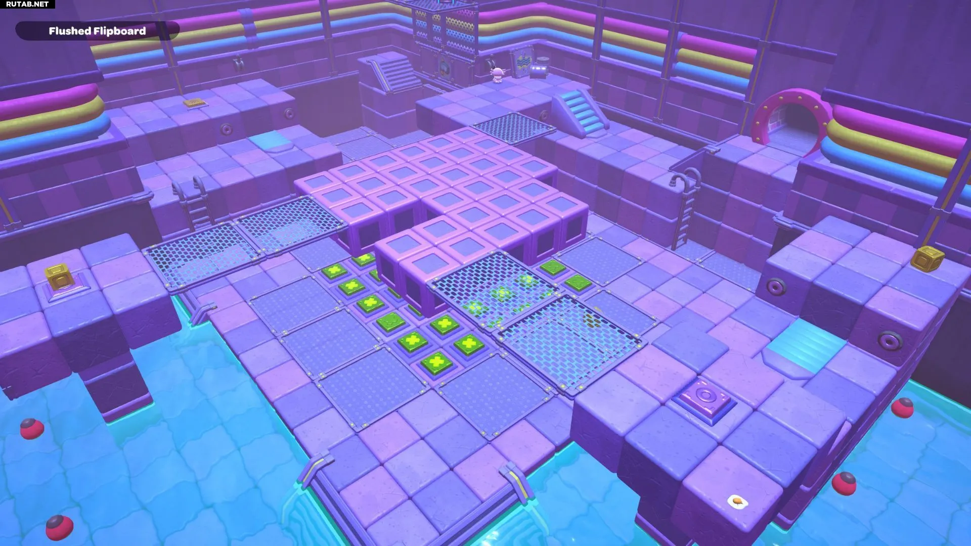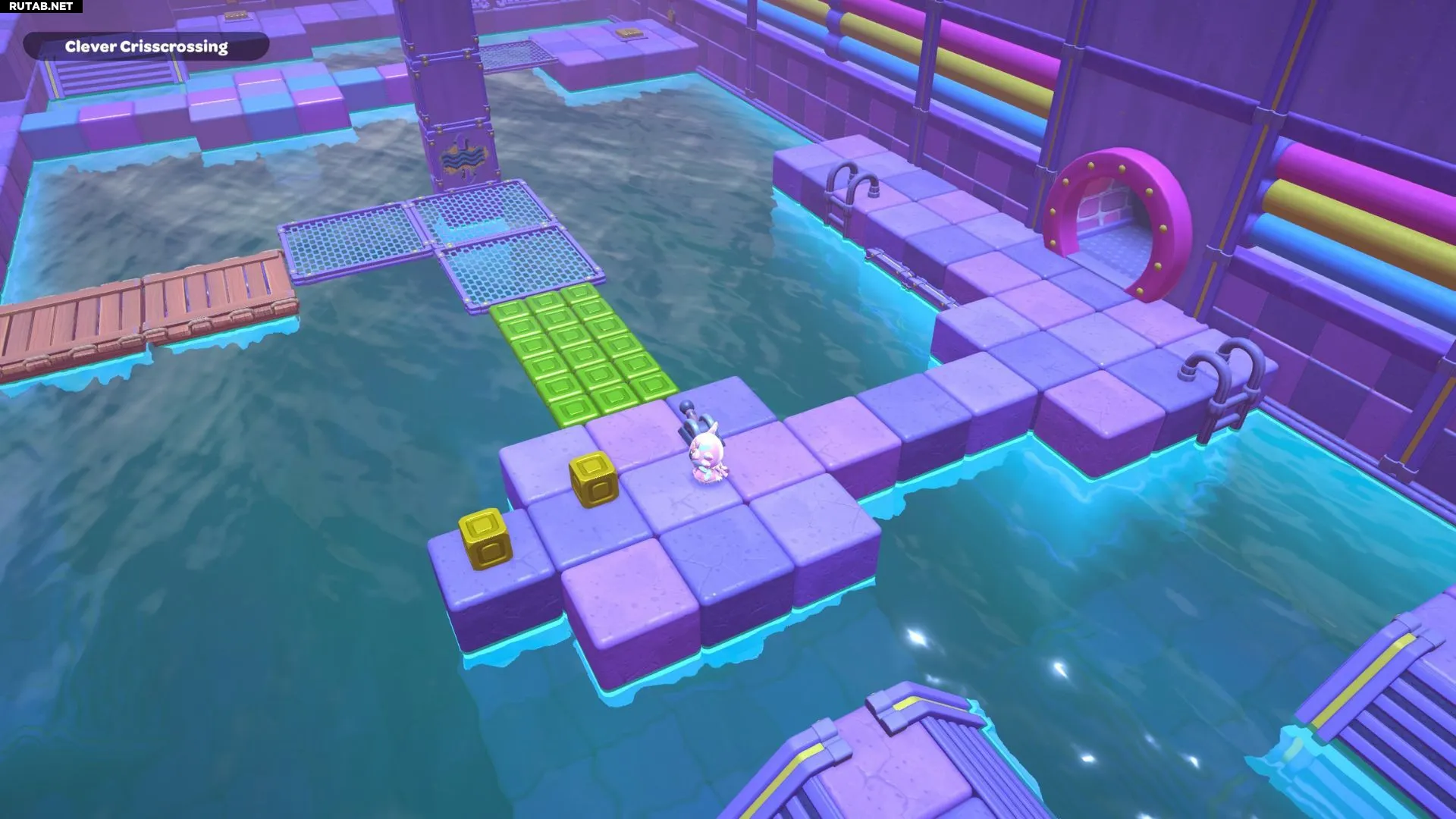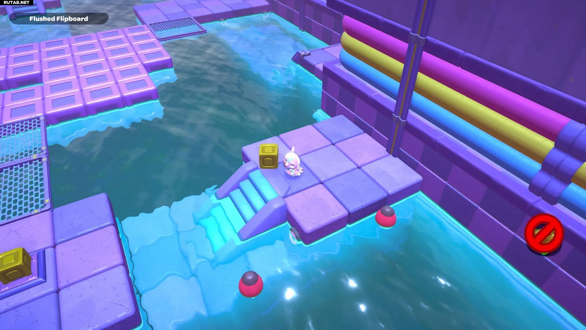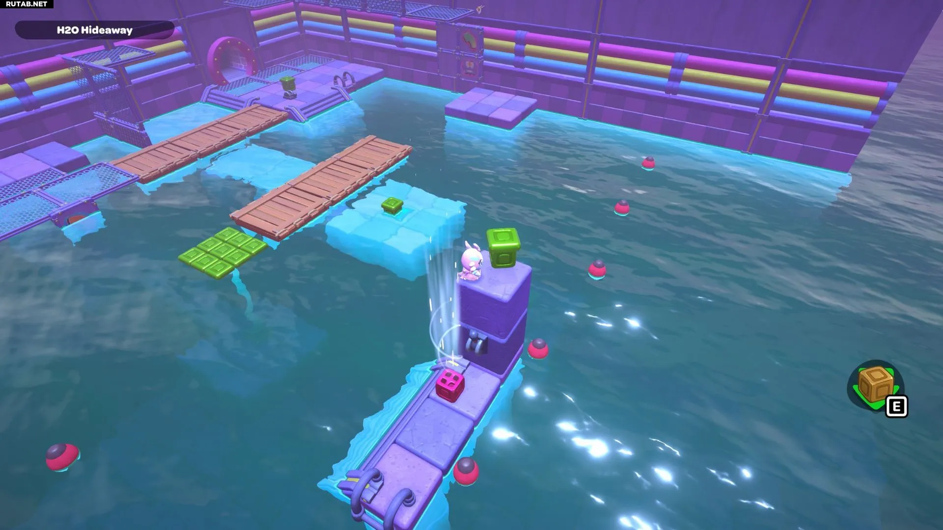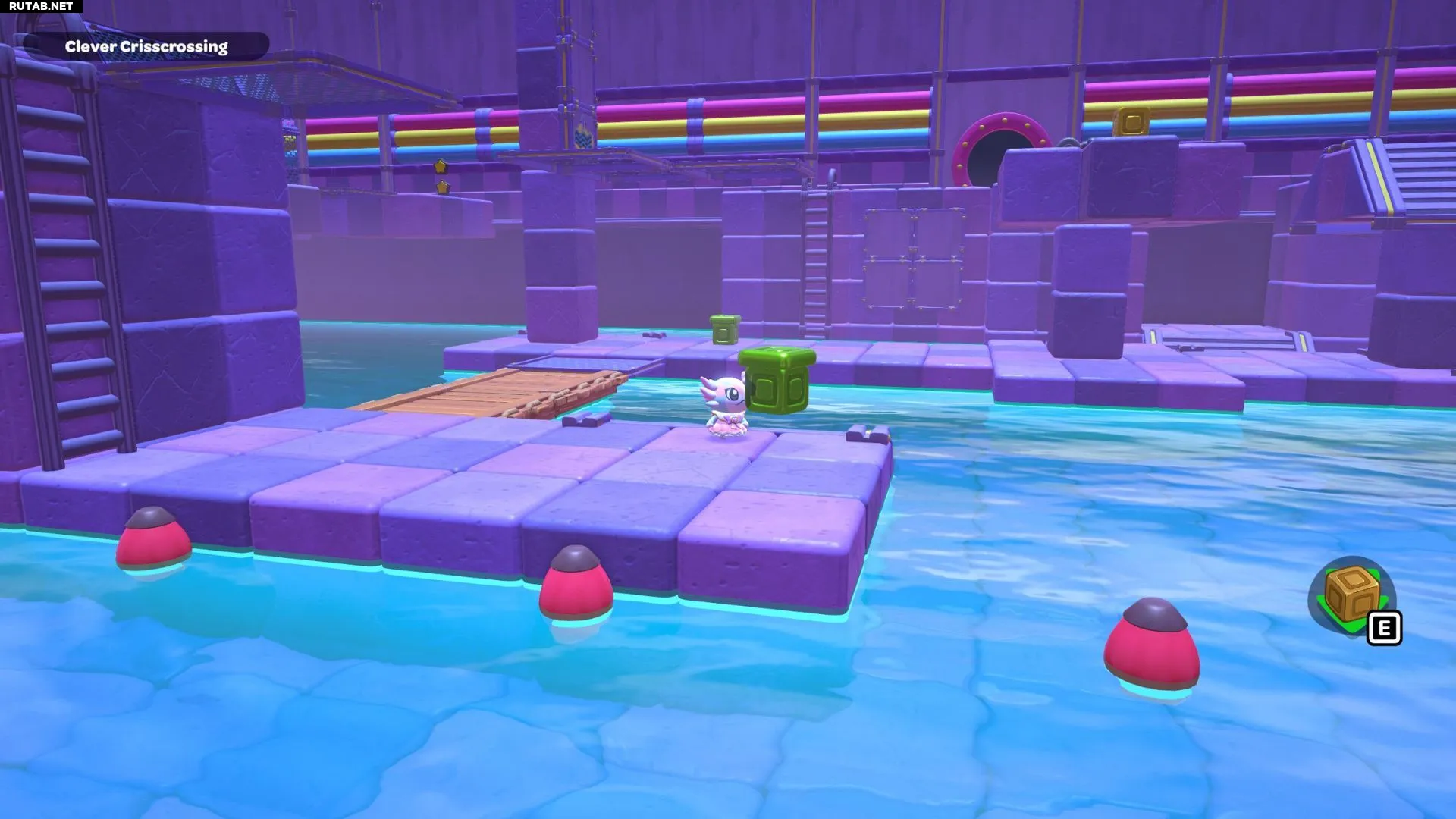 Проплывите к платформе на западе и поднимитесь по её лестнице. Прежде чем двигаться дальше, наступите на каждую кнопку на этой платформе.