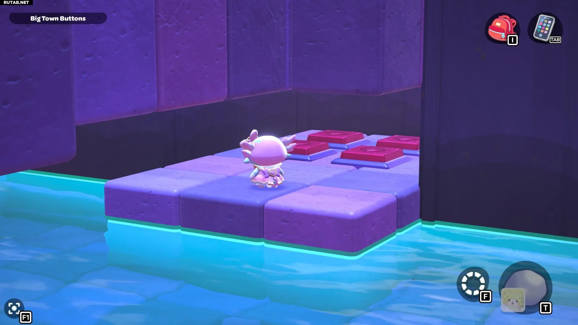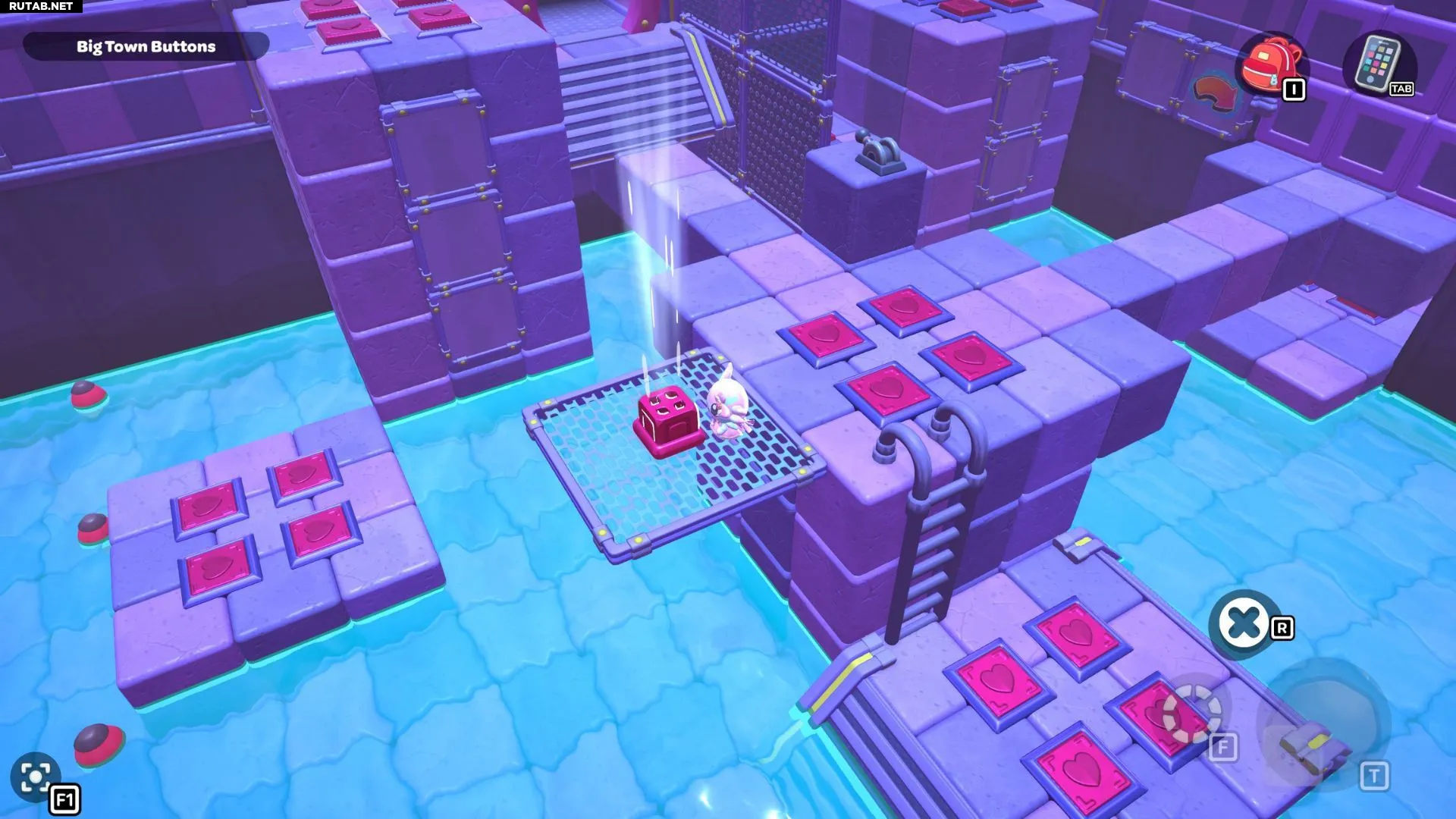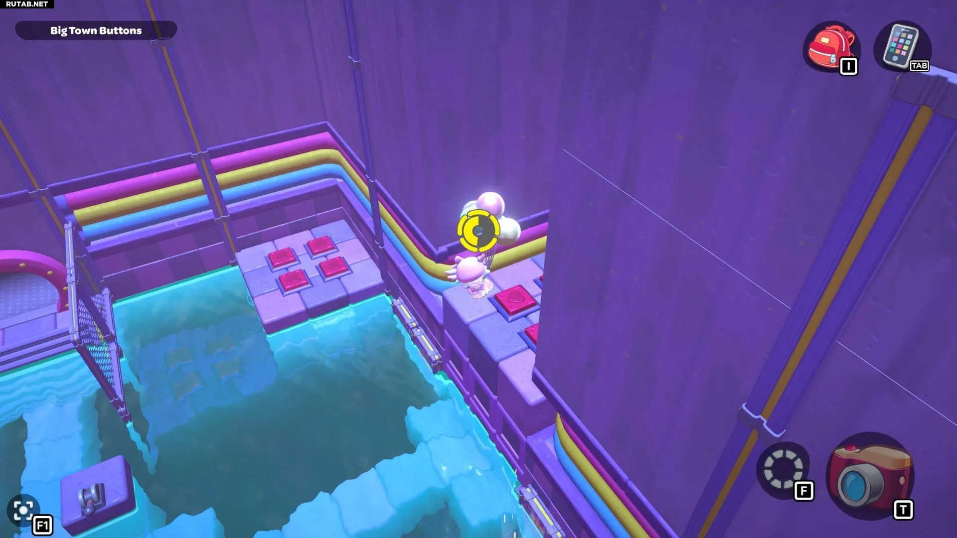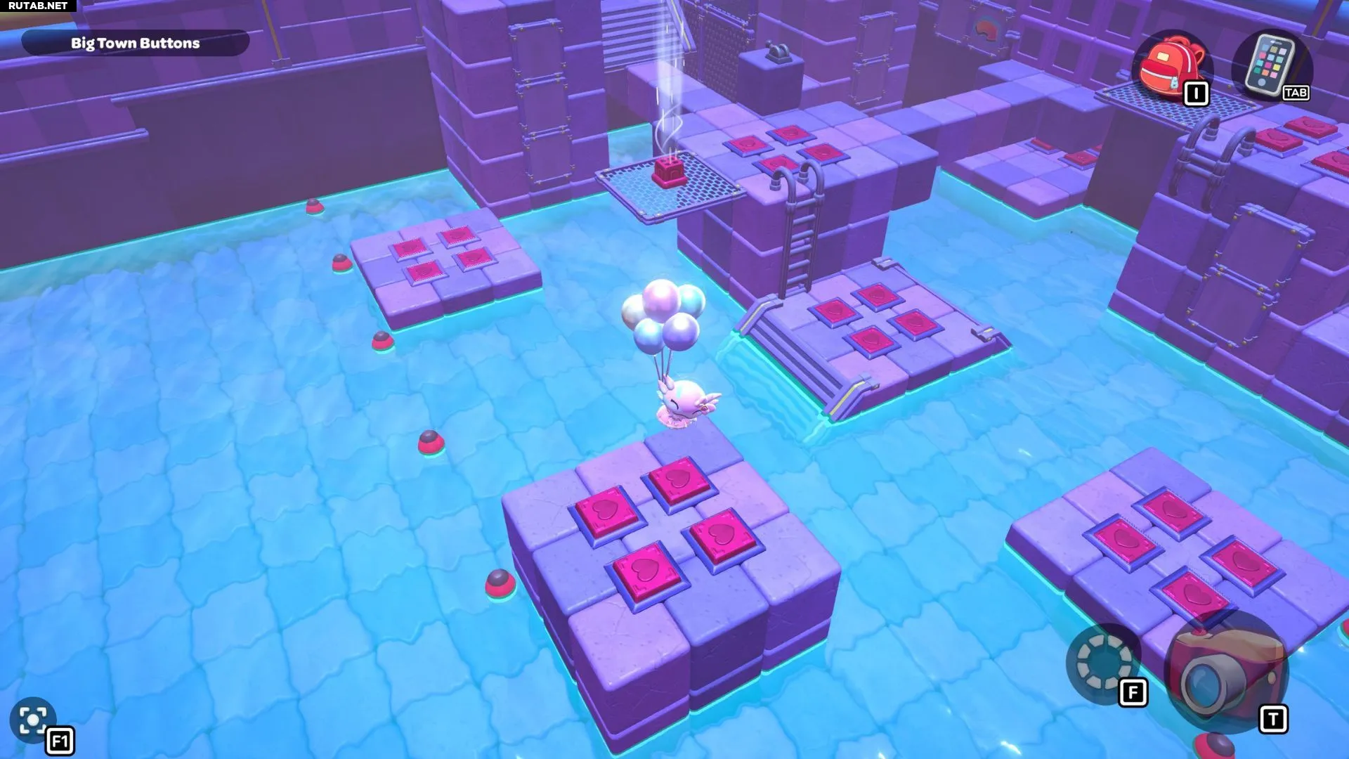 Проплывите к платформе на западе и поднимитесь по её лестнице. Прежде чем двигаться дальше, наступите на каждую кнопку на этой платформе.