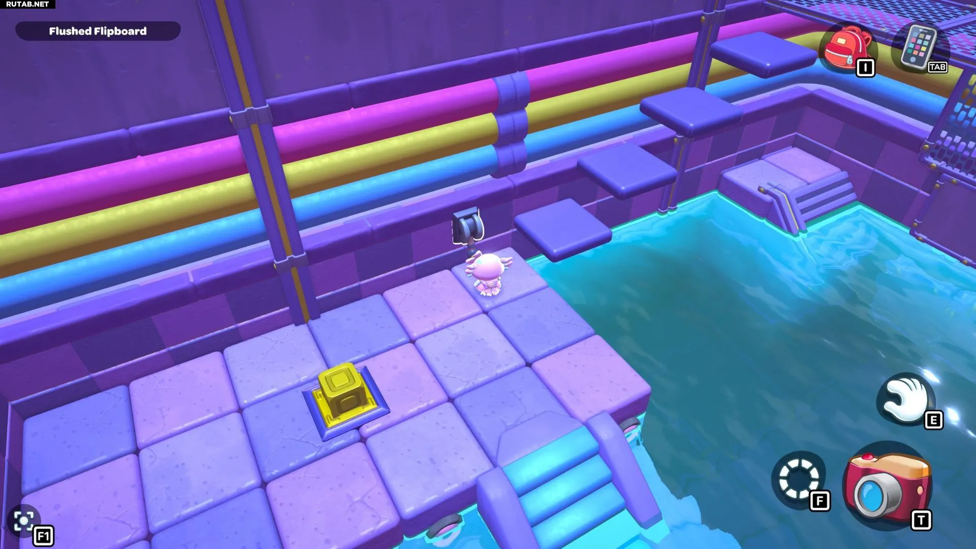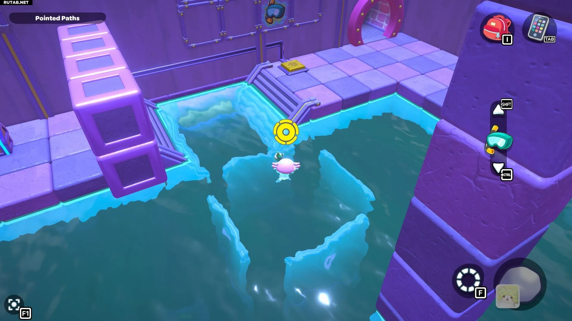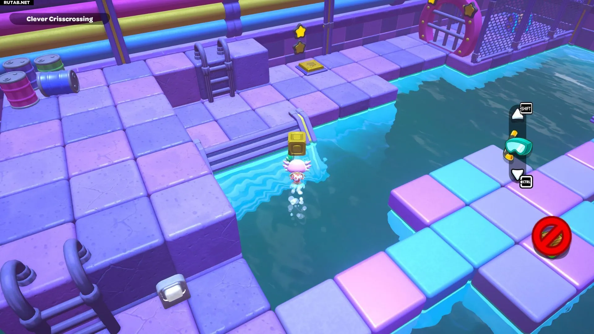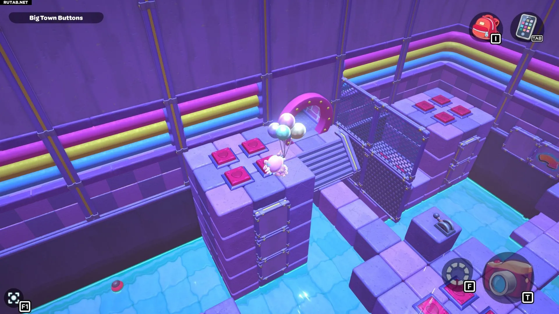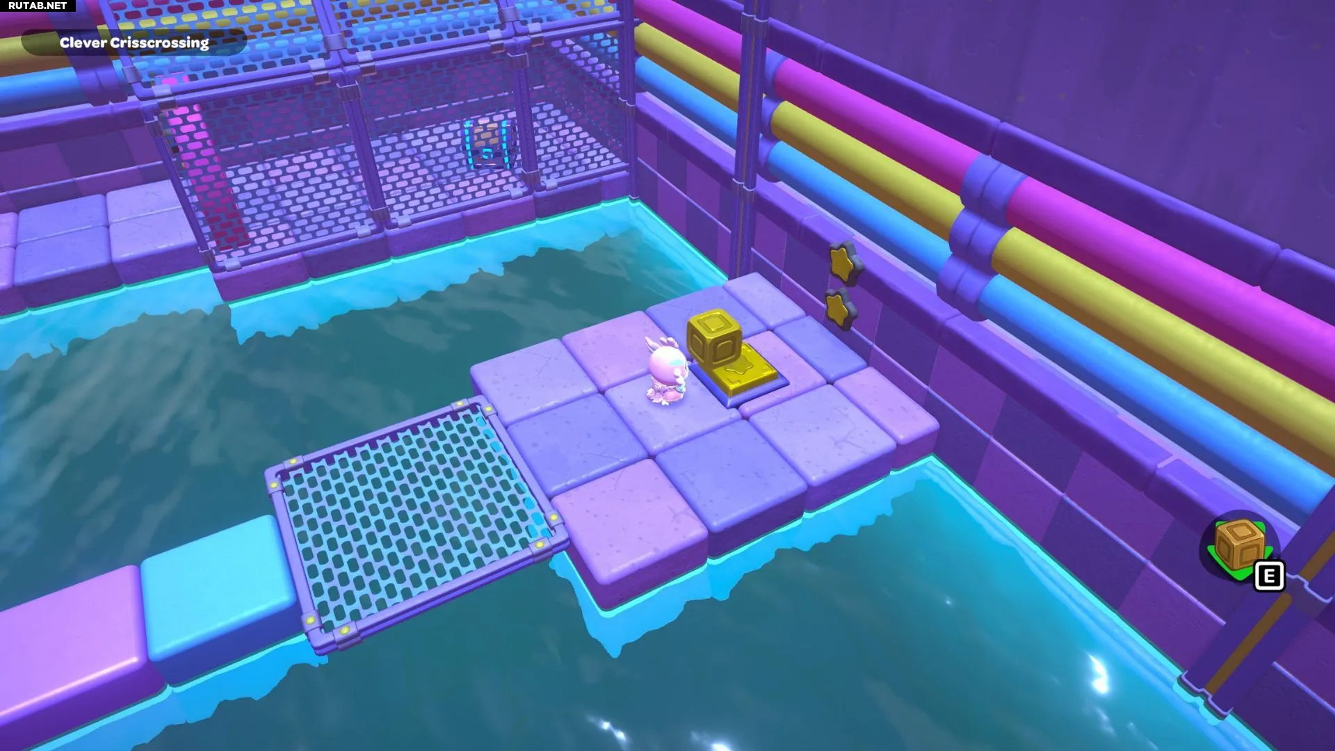 Проплывите к платформе на западе и поднимитесь по её лестнице. Прежде чем двигаться дальше, наступите на каждую кнопку на этой платформе.