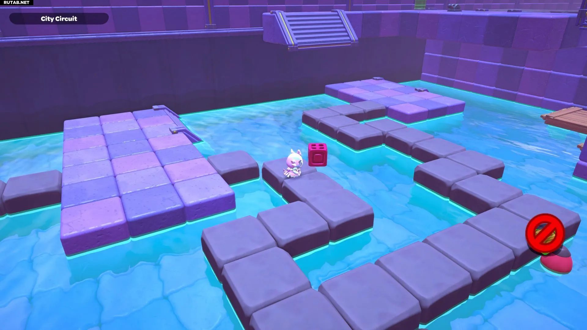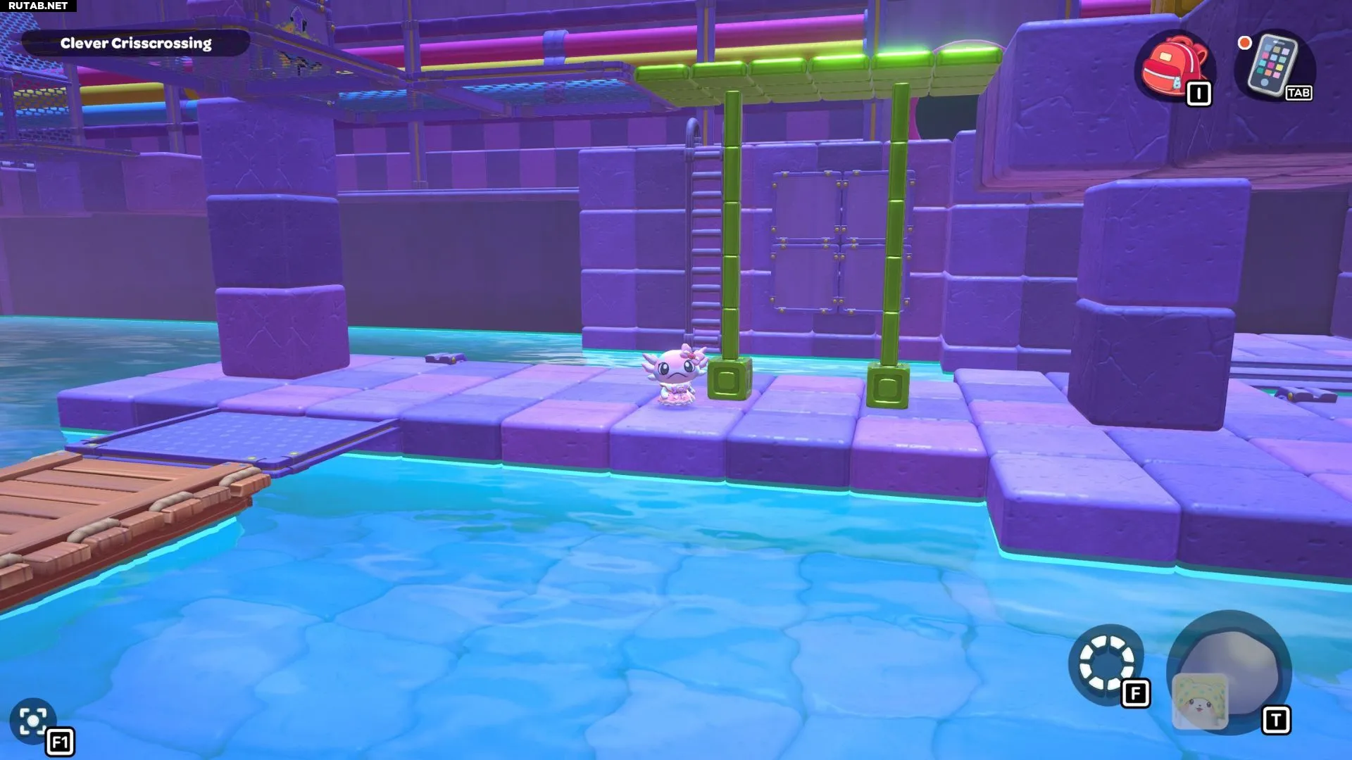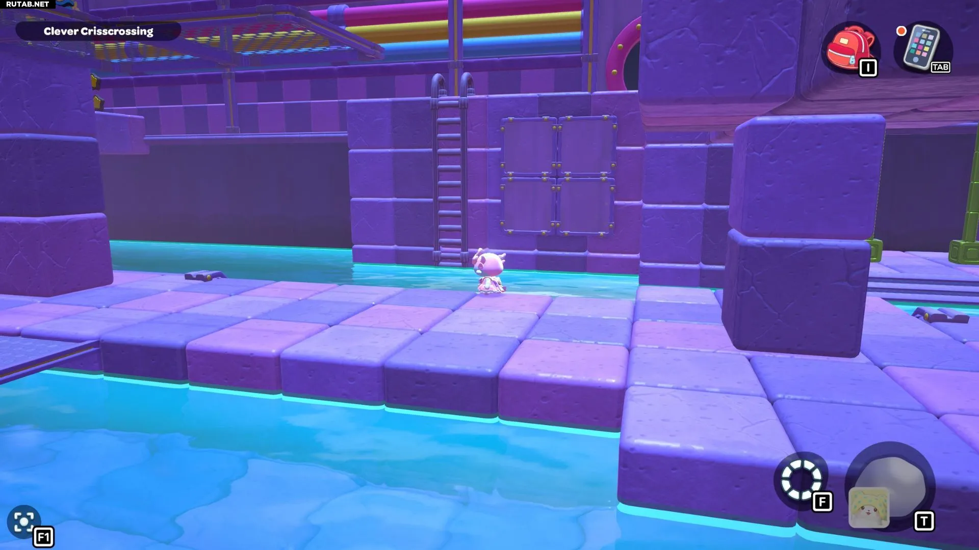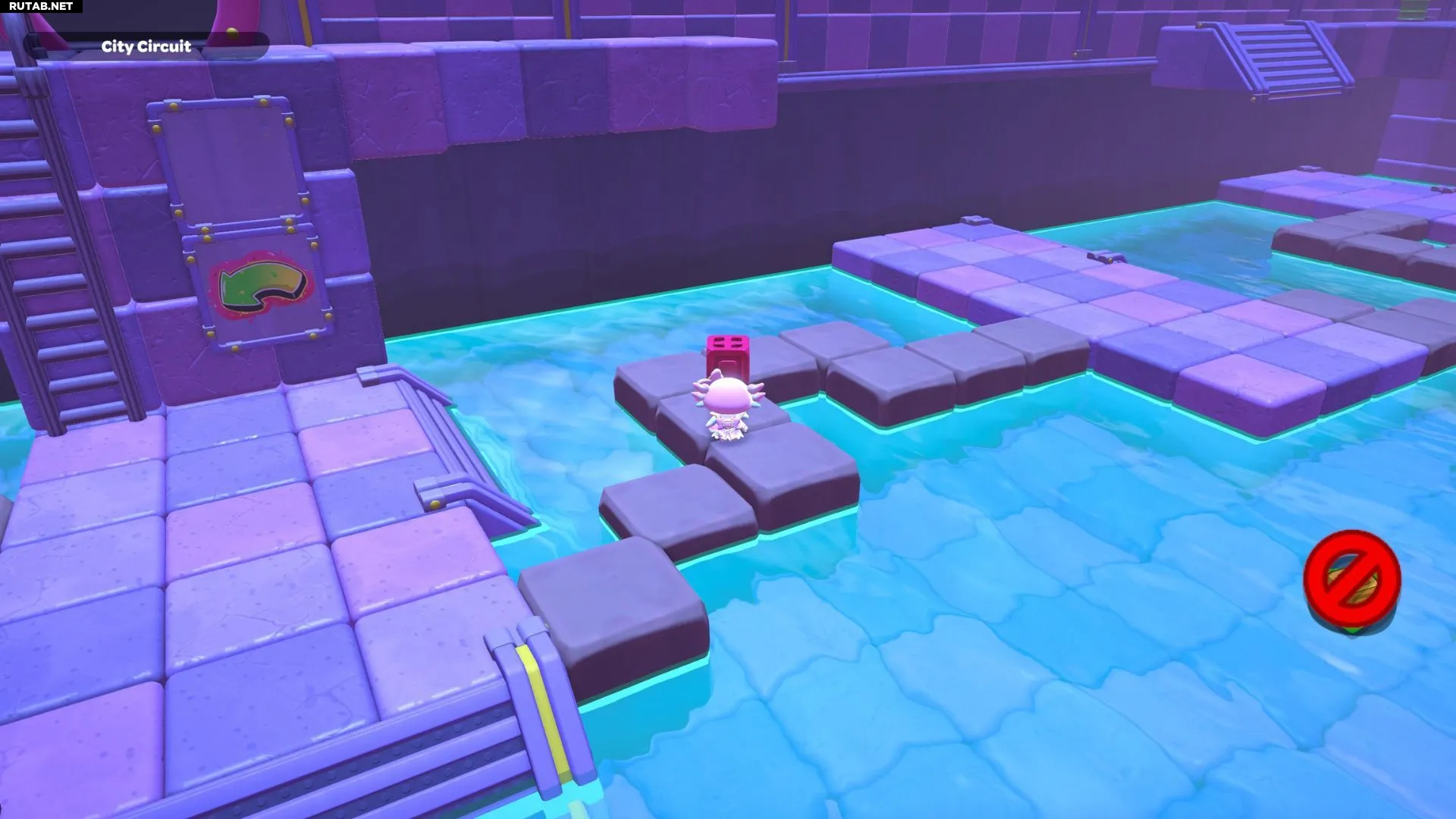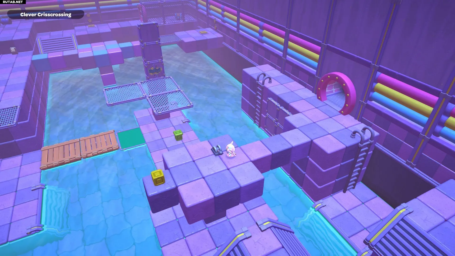Проплывите к платформе на западе и поднимитесь по её лестнице. Прежде чем двигаться дальше, наступите на каждую кнопку на этой платформе.