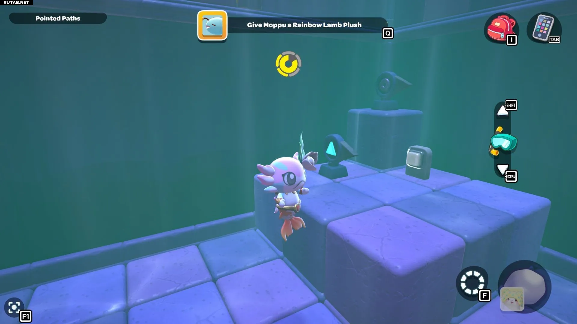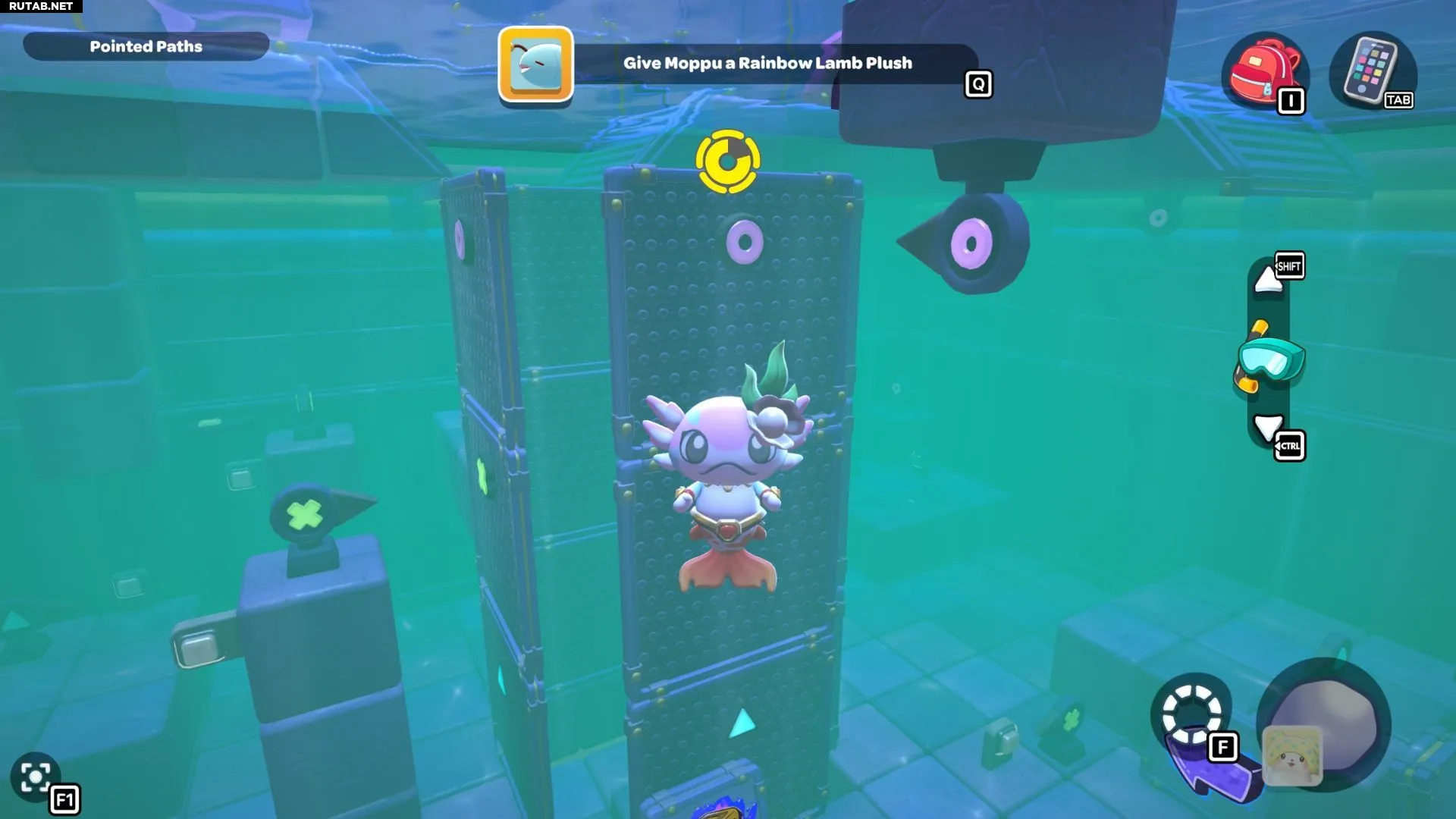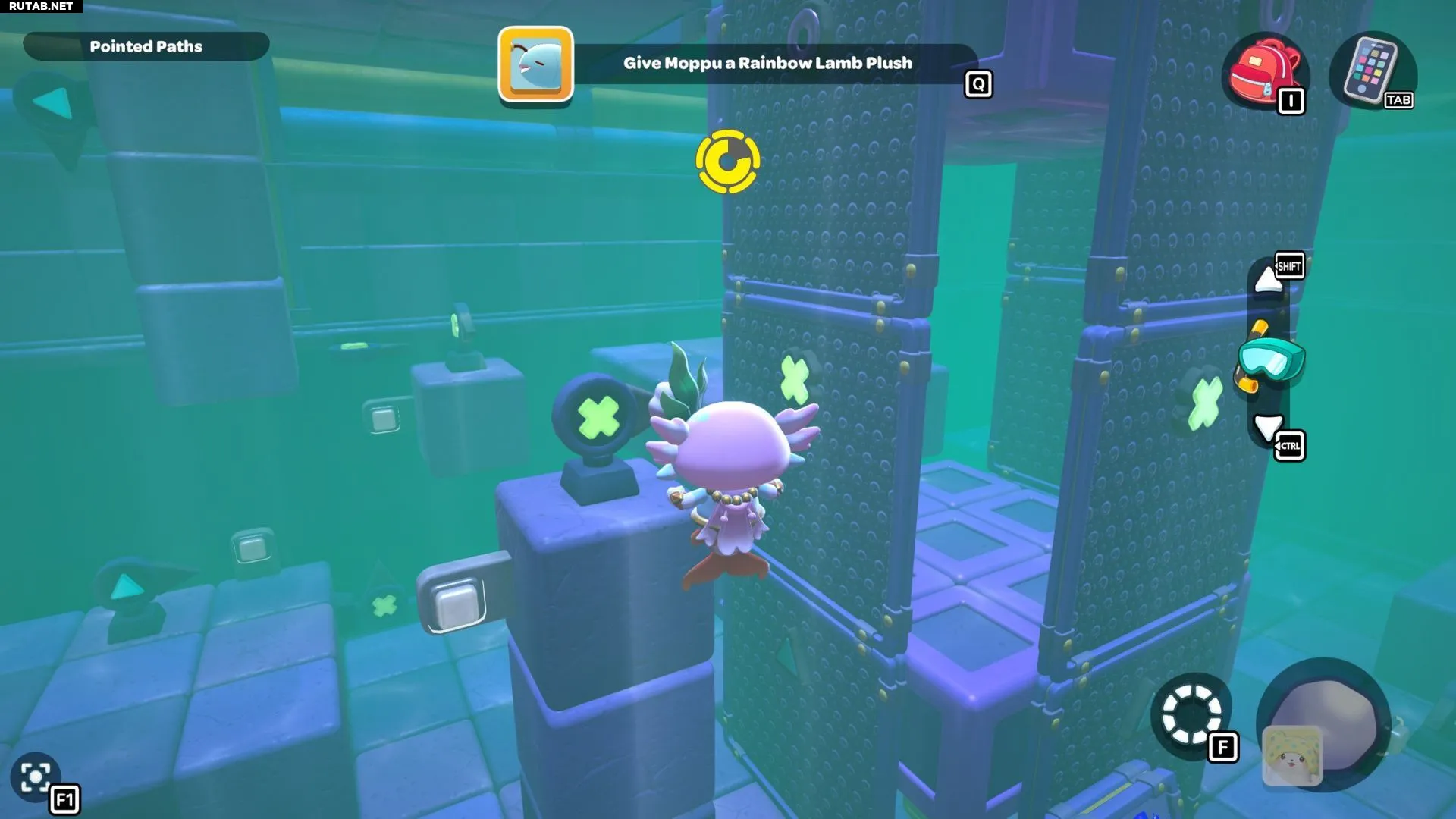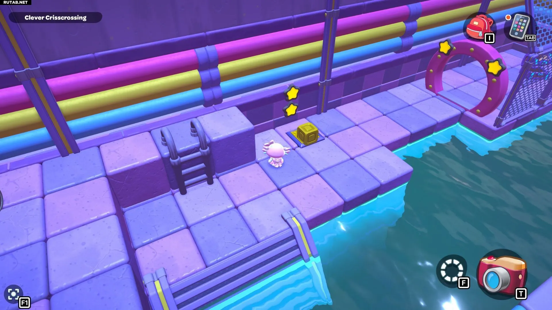 Проплывите к платформе на западе и поднимитесь по её лестнице. Прежде чем двигаться дальше, наступите на каждую кнопку на этой платформе.