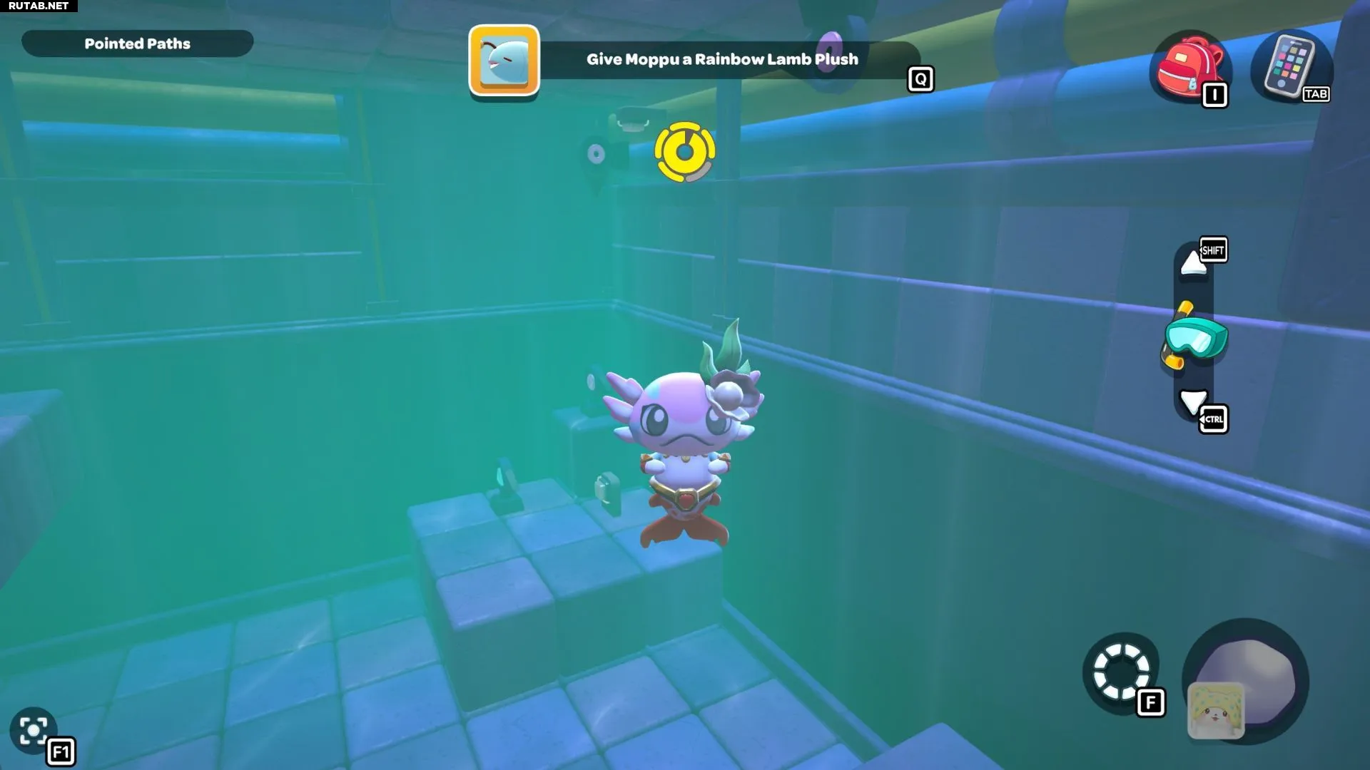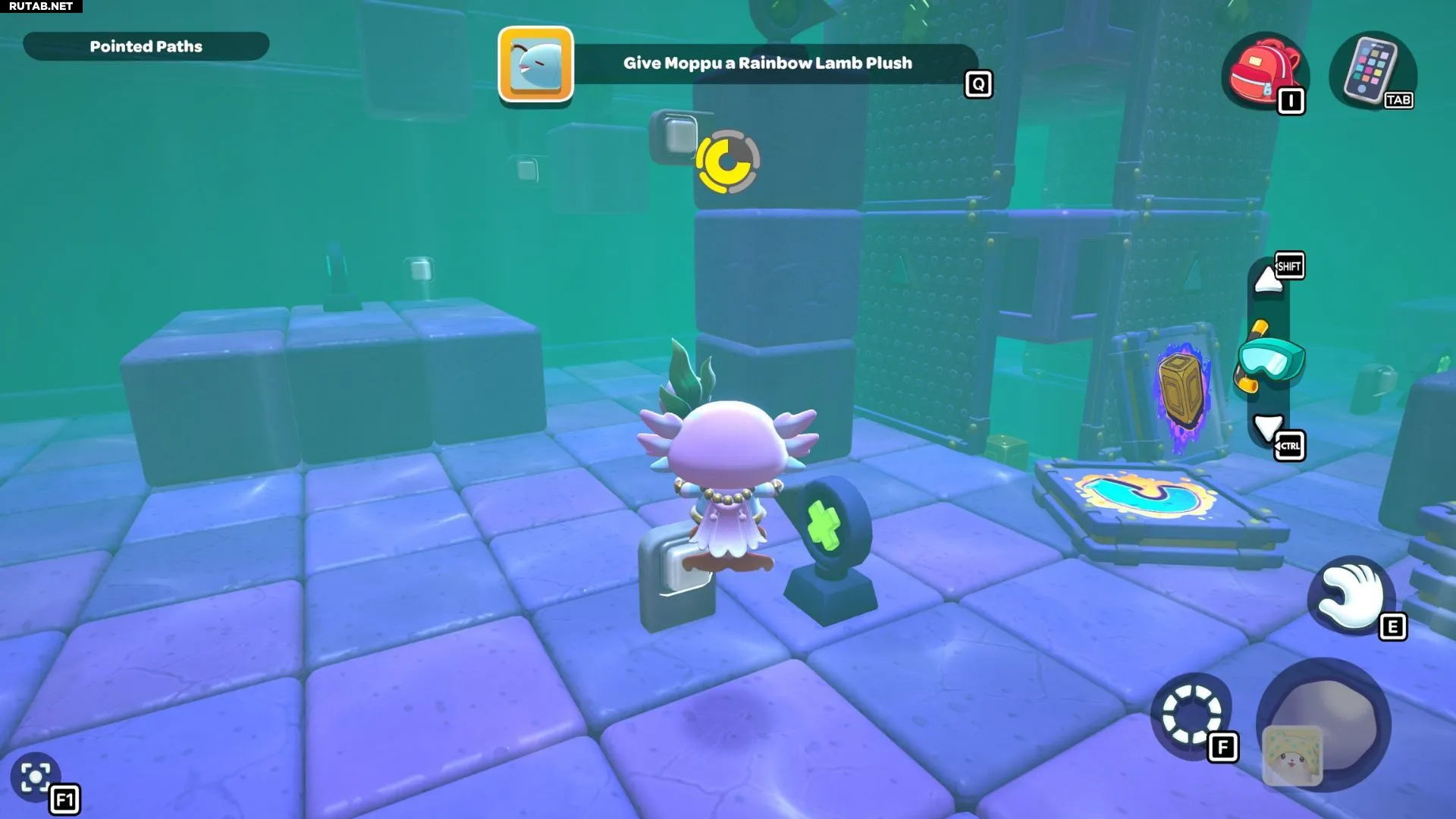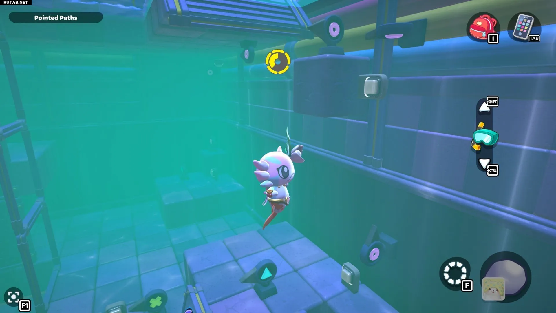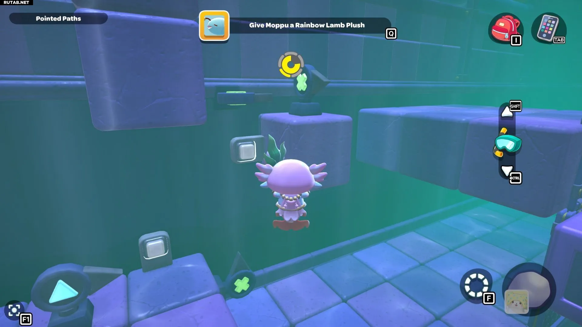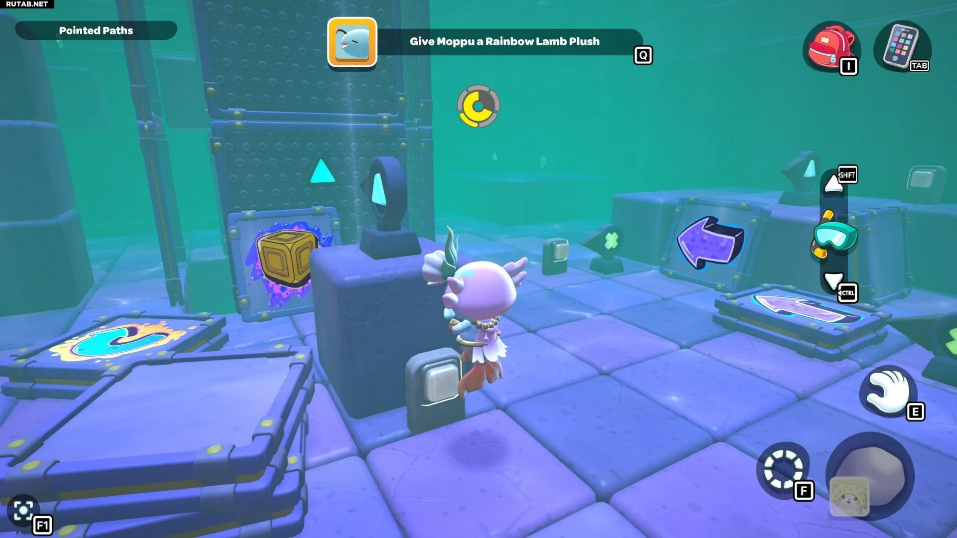 Проплывите к платформе на западе и поднимитесь по её лестнице. Прежде чем двигаться дальше, наступите на каждую кнопку на этой платформе.